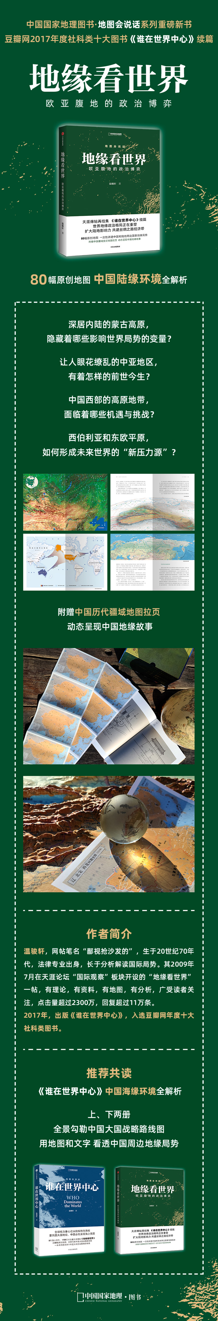 这本书以地理环境为基础,通过深入浅出的语言,运用简单明确的逻辑,以地缘为角度,以历史为参考,直观展现地缘形势。本书分四章,每章围绕一个地理单元展开,分别为蒙古高原、大中亚、青藏高原,以及西伯利亚和东欧平原,搭配79幅原创地图,论述了深居内陆的蒙古高原,隐藏着哪些影响世界局势的变量?让人眼花缭乱的中亚地区,有着怎样的前世今生?中国西部的高原地带,面临着哪些机遇与挑战?西伯利亚和东欧平原,如何形成未来世界的“新压力源”?系统解读欧亚大陆中心地带的过去与未来。