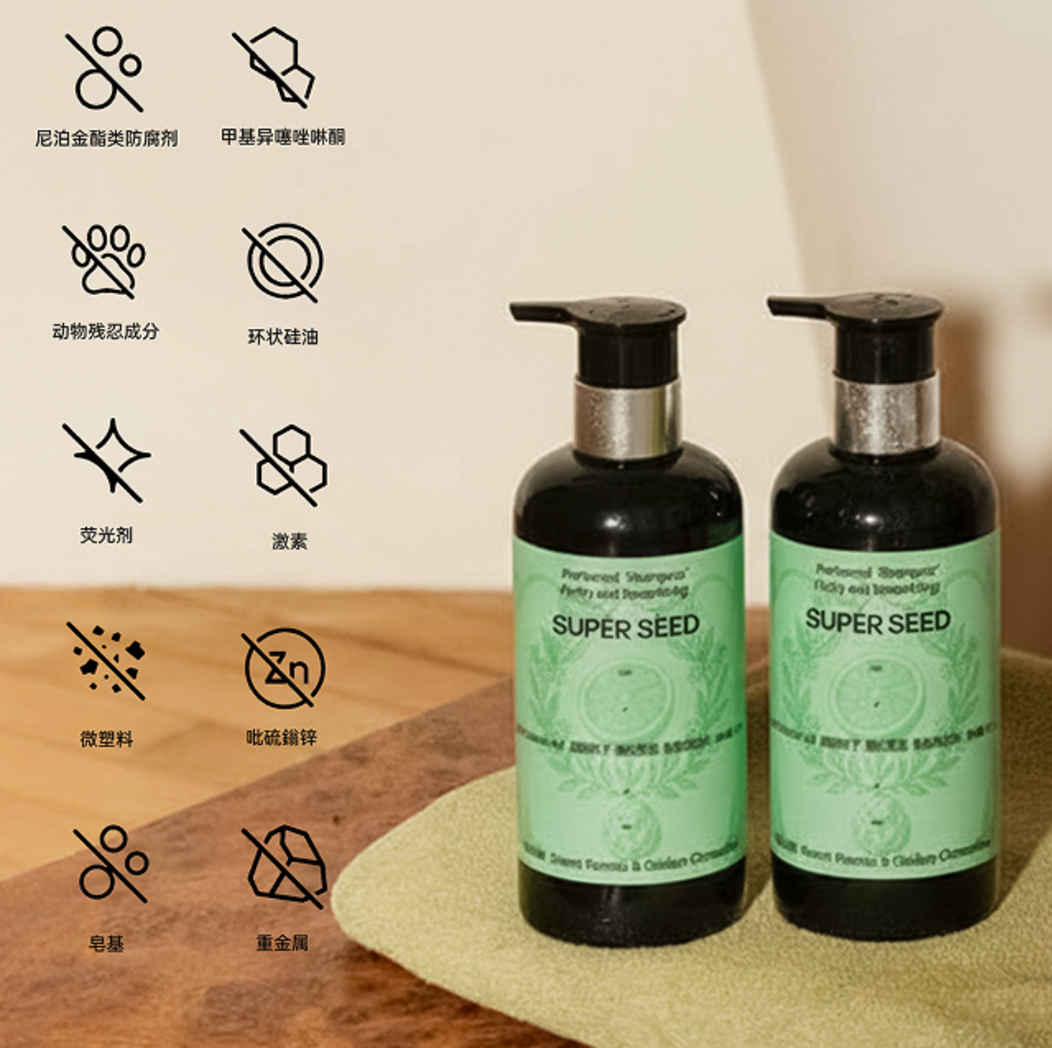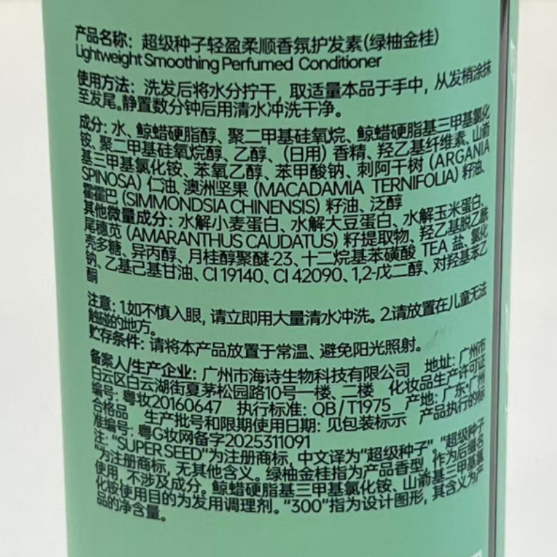 超级种子轻盈柔顺香氛护发素(绿柚金桂)含1种日用香精、2种防腐剂(苯甲酸钠、苯氧乙醇)、1种酒精成分(乙醇)。