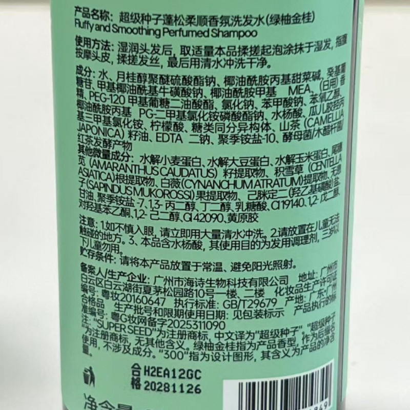 超级种子蓬松柔顺香氛洗发水(绿柚金桂)含1种日用香精、2种防腐剂(苯甲酸钠、苯氧乙醇)、1种孕妇慎用成分(水杨酸)。