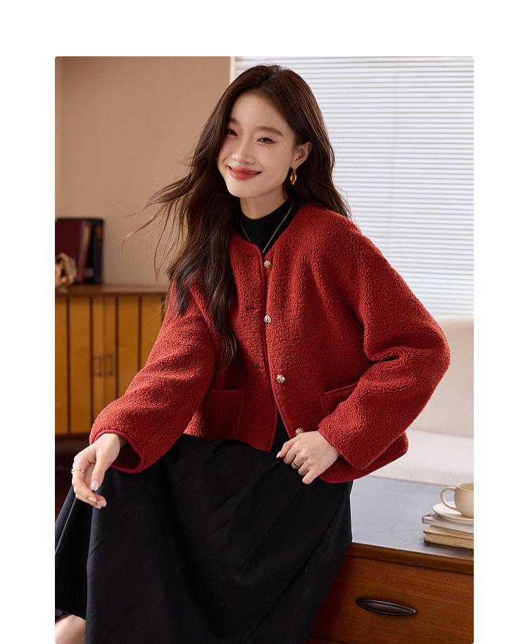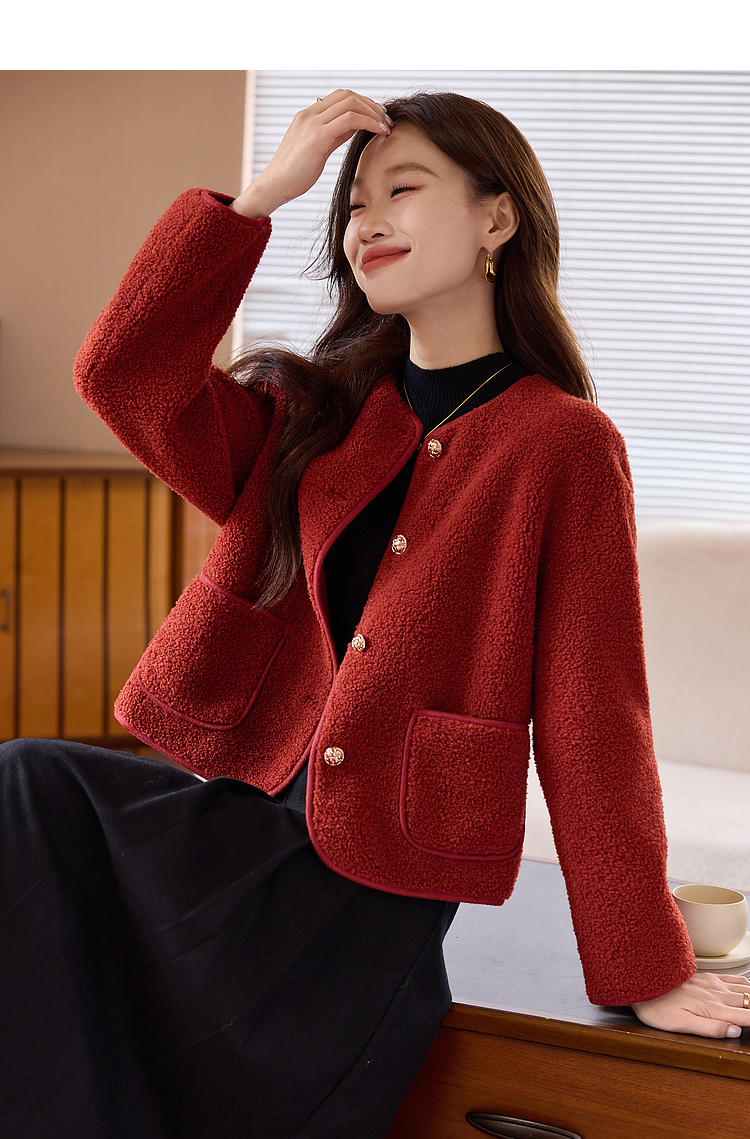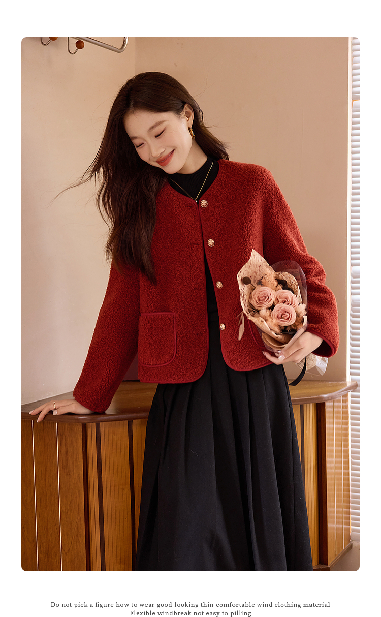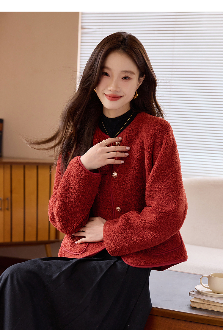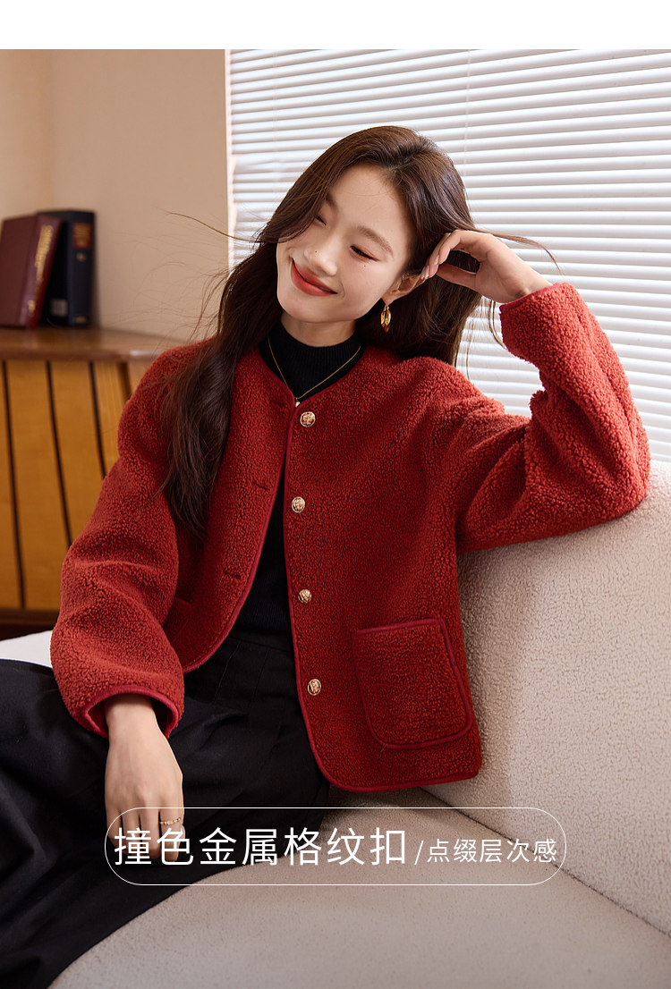 【年终特卖】熙世界复古红色小香风短款外套女秋冬小个子气质仿羊羔毛夹克上衣