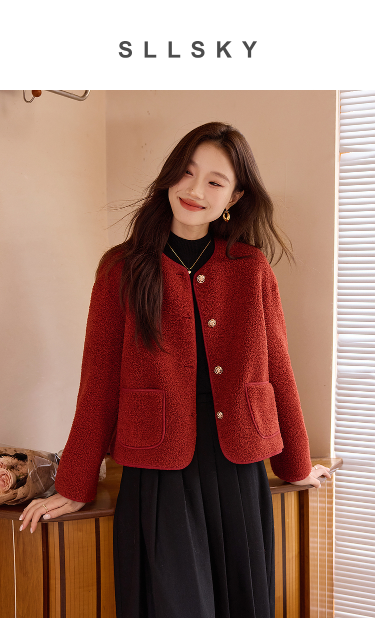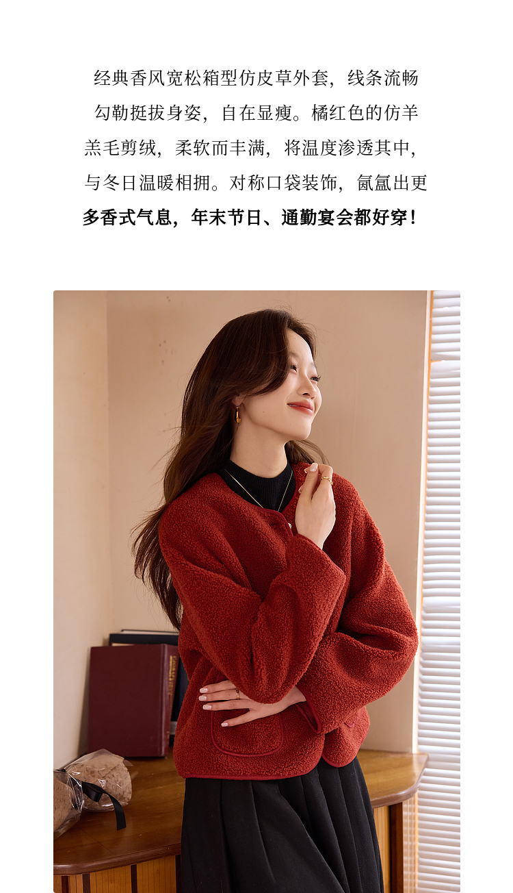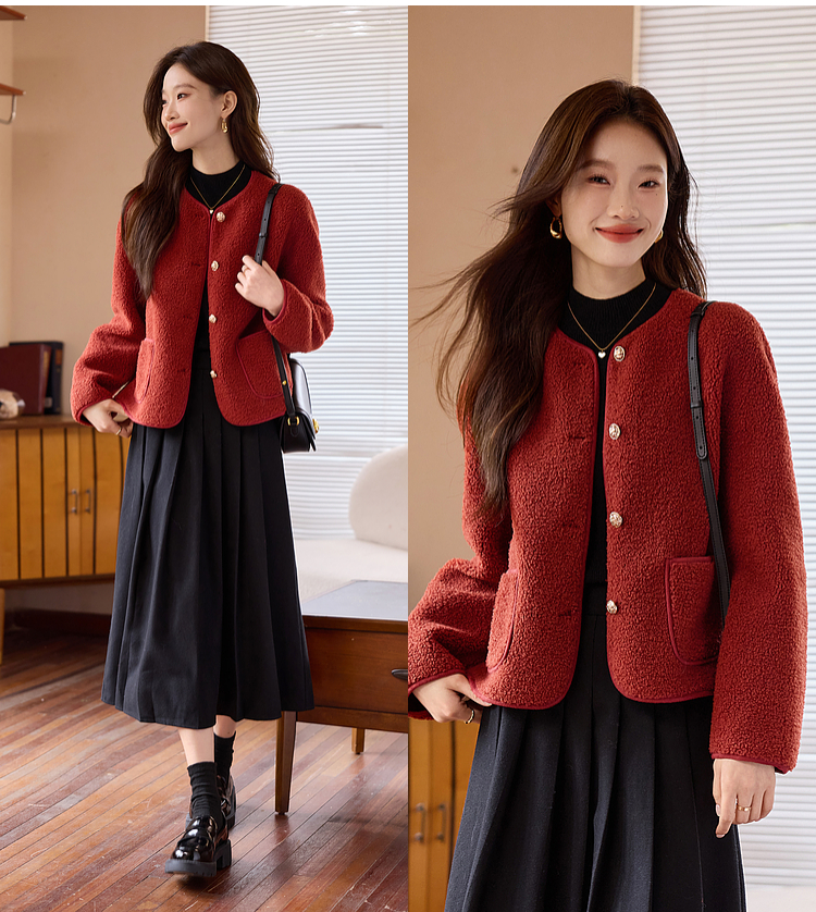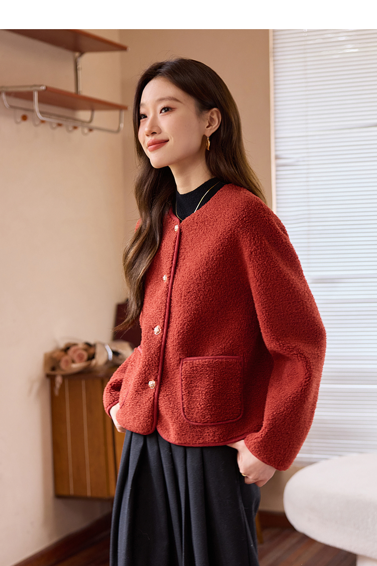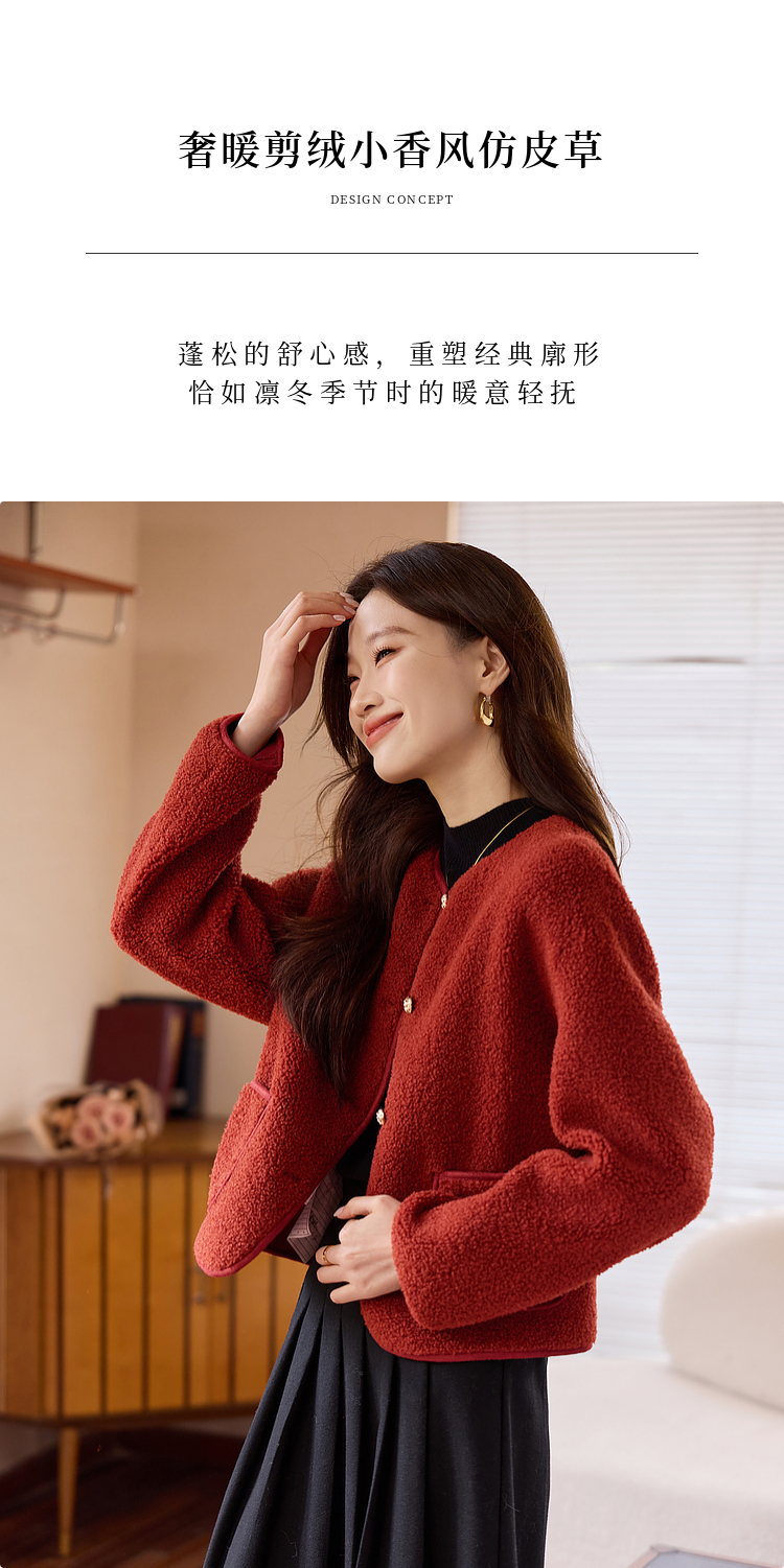 【年终特卖】熙世界复古红色小香风短款外套女秋冬小个子气质仿羊羔毛夹克上衣