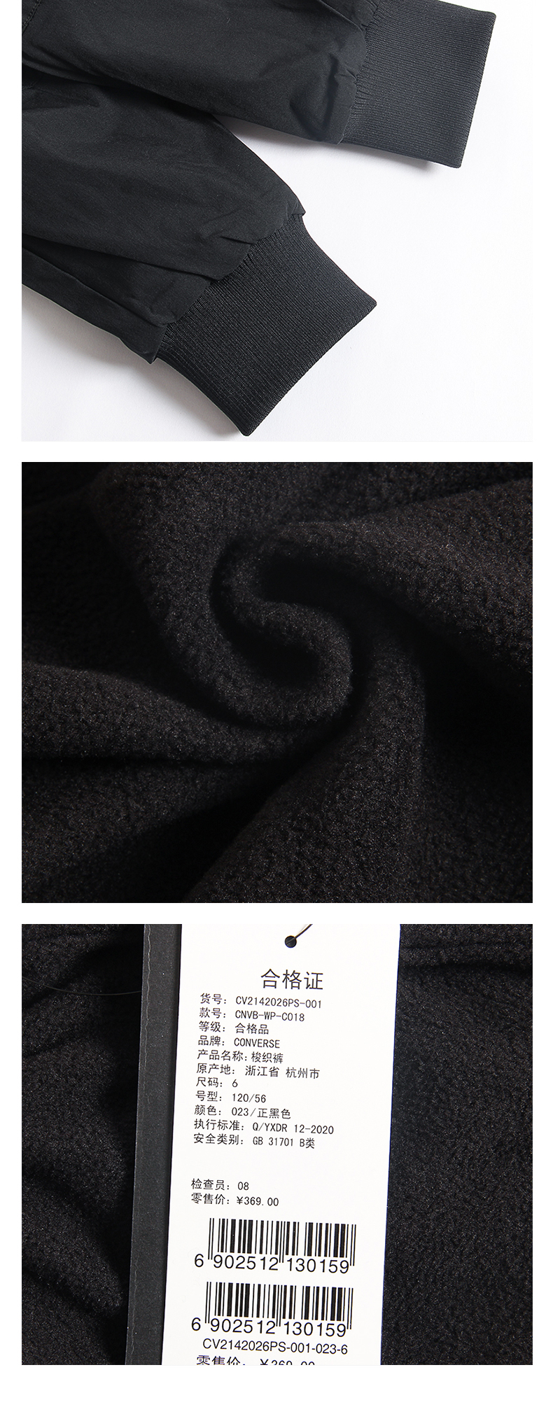Converse匡威童装冬男儿童加厚绒梭织防风运动长裤子CV2142026