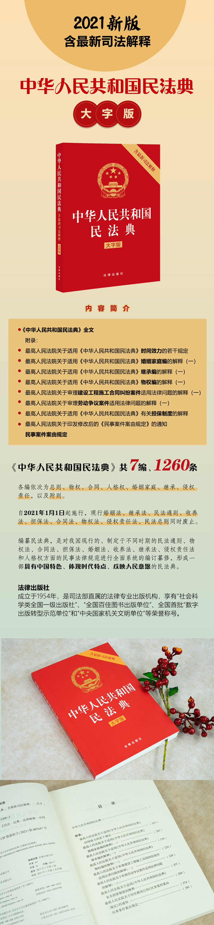 《中华人民共和国民法典》共7编、1260条,各编依次为总则、物权、合同、人格权、婚姻家庭、继承、侵权责任,以及附则,自2021年1月1日起施行,现行婚姻法、继承法、民法通则、收养法、担保法、合同法、物权法、侵权责任法、民法总则同时废止。编纂民法典,是对我国现行的、制定于不同时期的民法通则、物权法、合同法、担保法、婚姻法、收养法、继承法、侵权责任法和人格权方面的民事法律规范进行全面系统的编订纂修,形成一部具有中国特色、体现时代特点、反映人民意愿的民法典。