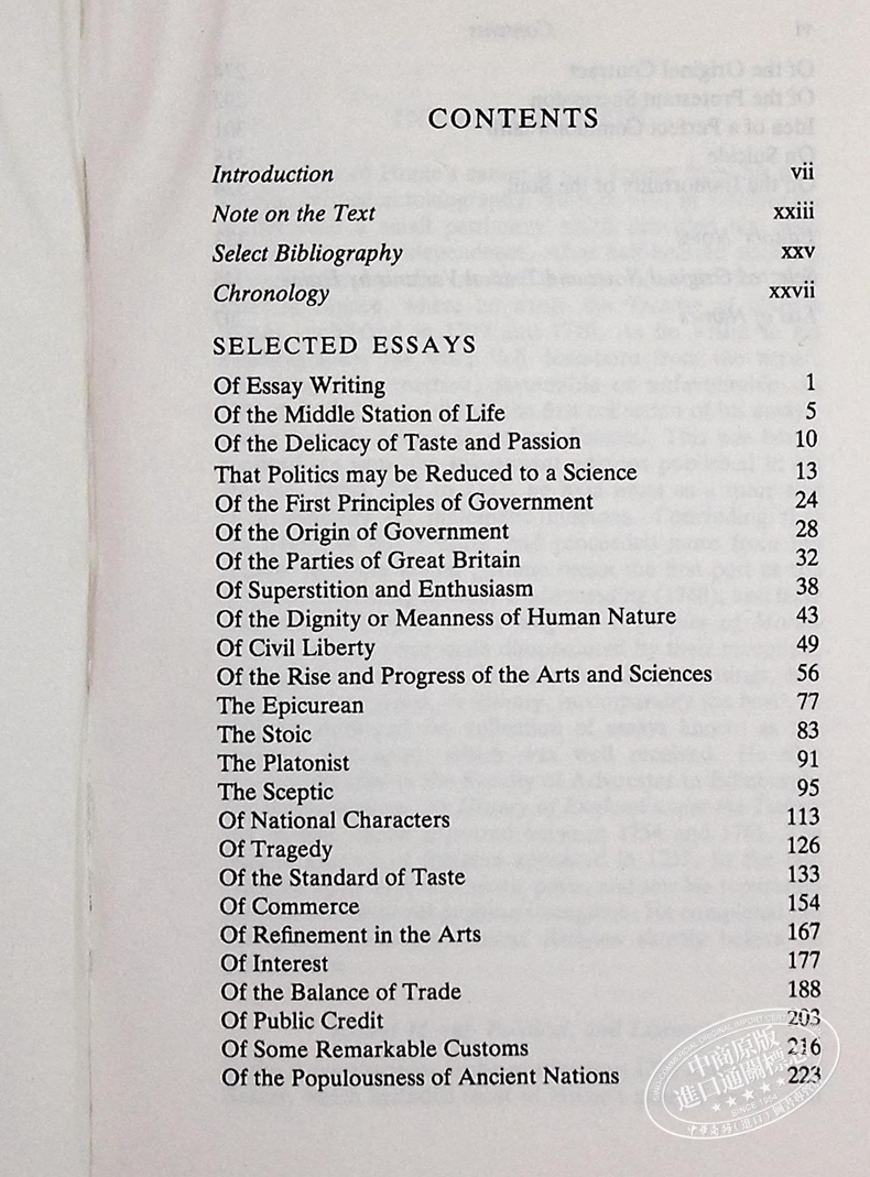 Introduction ; Note on the Text ; Select Bibliography ; Chronology ; 1. Of Essay Writing ; 2. Of the Middle Station of Life ; 3. Of the Delicacy of Taste and Passion ; 4. That Politics may be Reduced to a Science ; 5. Of the First Principles of Government ; 6. Of the Origin of Government ; 7. Of the Parties of Great Britain ; 8. Of Superstition and Enthusiasm ; 9. Of the Dignity or Meanness of Human Nature ; 10. Of Civil Liberty ; 11. Of the Rise and Progress of the Arts and Sciences ; 12. The Epicurean ; 13. The Stoic ; 14. The Platonist ; 15. The Sceptic ; 16. Of National Characters ; 17. Of Tragedy ; 18. Of the Standard of Taste ; 19. Of Commerce ; 20. Of Refinement in the Arts ; 21. Of Interest ; 22. Of the Balance of Trade ; 23. Of Public Credit ; 24. Of Some Remarkable Customs ; 25. Of the Populousness of Ancient Nations ; 26. Of the Original Contract ; 27. Of the Protestant Succession ; 28. Idea of a Perfect Commonwealth ; 29. On Suicide ; 30. On the Immortality of the Soul