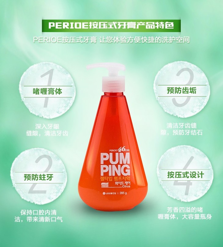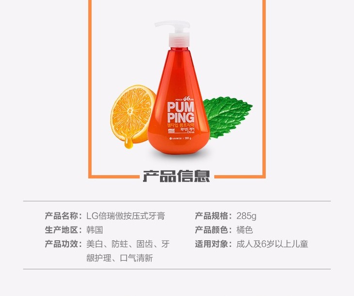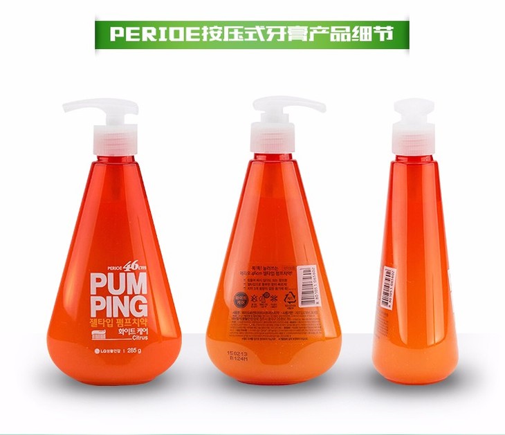 【保税仓】韩国 LG倍瑞傲 派缤 按压式牙膏 (沁橙)285g
