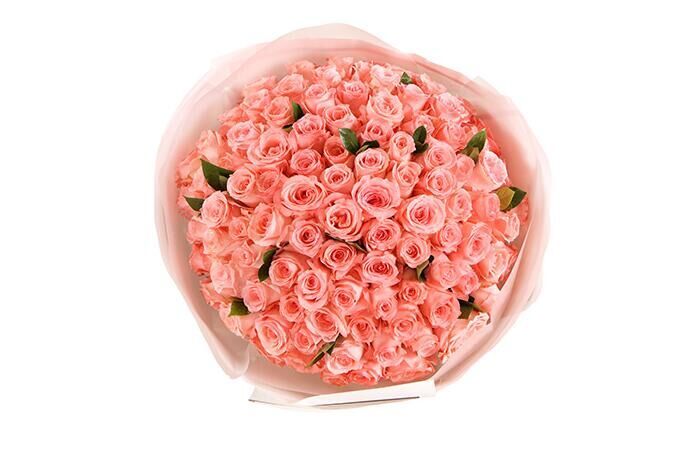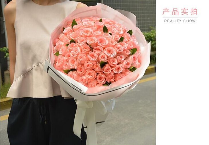 幸福久久----戴安娜粉玫瑰99枝,栀子叶适量 内层白色opp雾面纸,外层白底黑边纸,米白色缎带花结