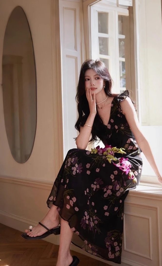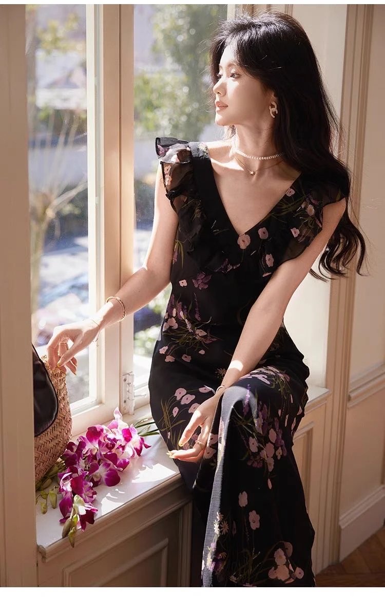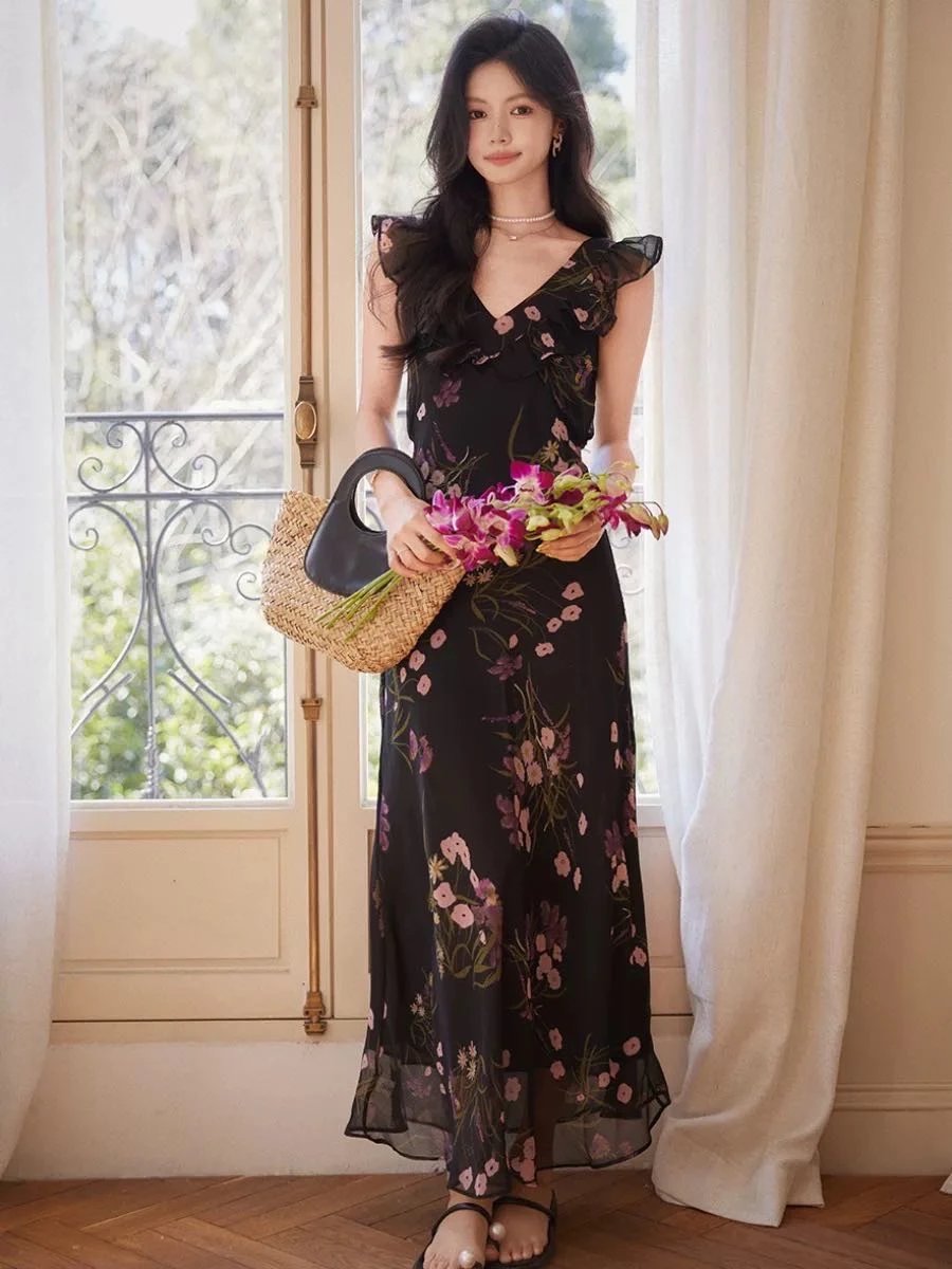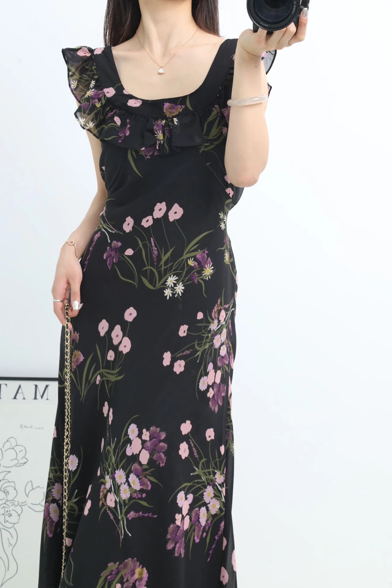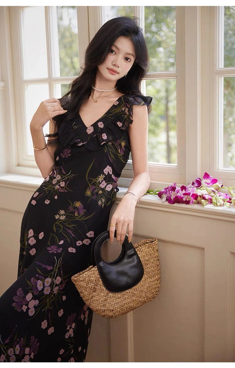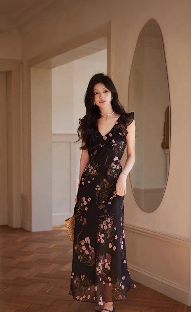 花卉图在黑色底布的映衬下自带清冷温婉既视感