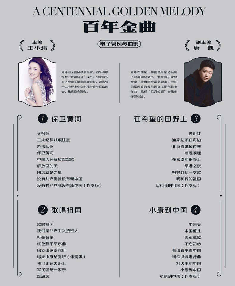 为纪念中国共产党建党100周年,青年双排键演奏家、玖月奇迹成员王小玮带领其团队遴选了近百年来创作的耳熟能详的歌曲或乐曲36首(演奏版32首、伴奏版4首),改编为电子管风琴版本,曲目按照创作年代排序,分为“保卫黄河”“歌唱祖国”“在希望的田野上”“小康到中国”四册,每首曲目分为曲谱和演奏提示两部分。所选歌曲皆为歌颂党的发展历程,赞颂党和人民深厚感情的佳作,包括《没有共产党就没有新中国》《不忘初心》等。