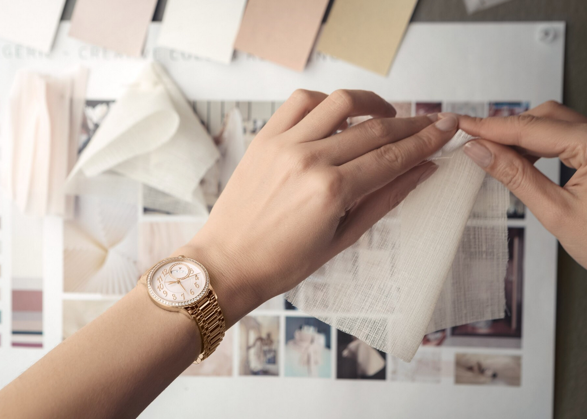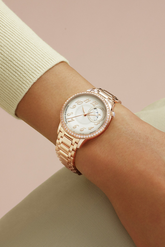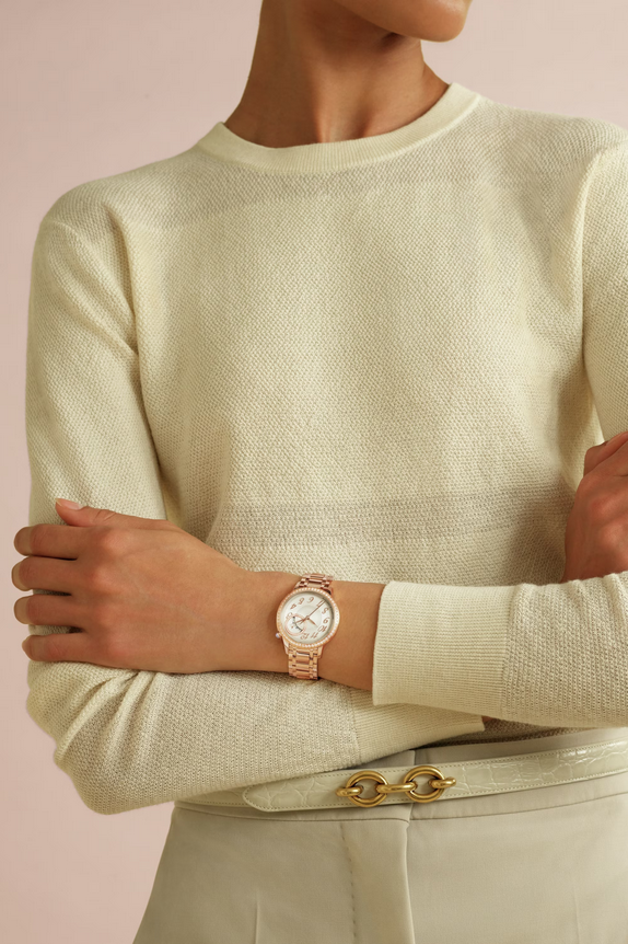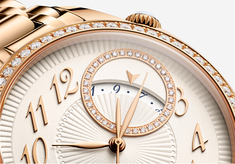 镜面材质 | 蓝宝石水晶玻璃 | 表盘 | 18K 5N粉红金表壳 乳光银色表盘织锦工艺打造的“褶皱”效果纹饰;18K 5N粉红金圆环镶有34颗圆钻;圆形珠粒式分钟轨道;18K 5N粉红金镶贴式阿拉伯数字和指针 表圈镶嵌58颗圆钻 1点钟和2点钟位置之间的日期显示圆环饰以34颗圆形切割钻石,表冠则镶嵌一颗月光石 |