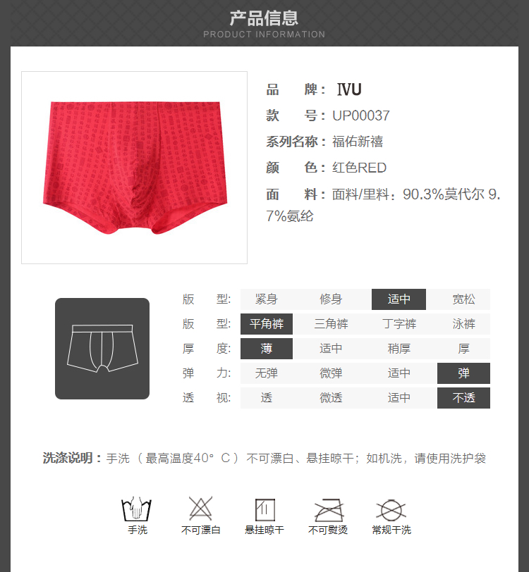 6F IVU莫代尔男本命年红色内裤福字印花无痕平角裤