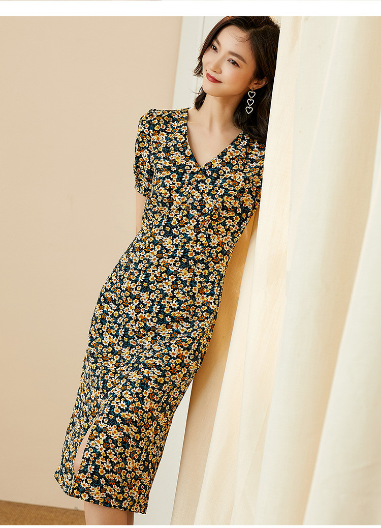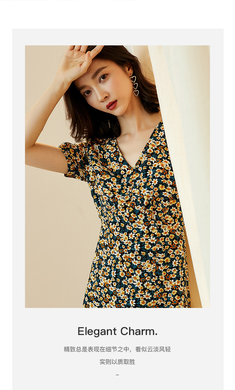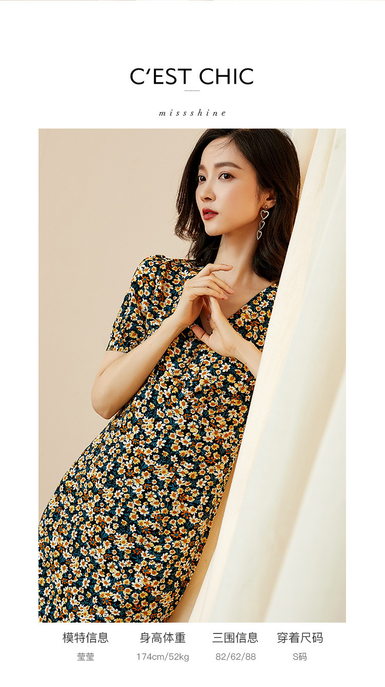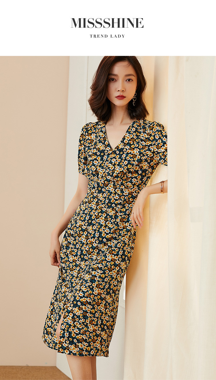 米思阳夏季2021新款时尚复古小碎花V领开叉薄款连衣裙