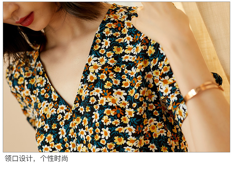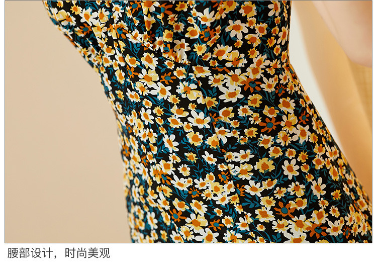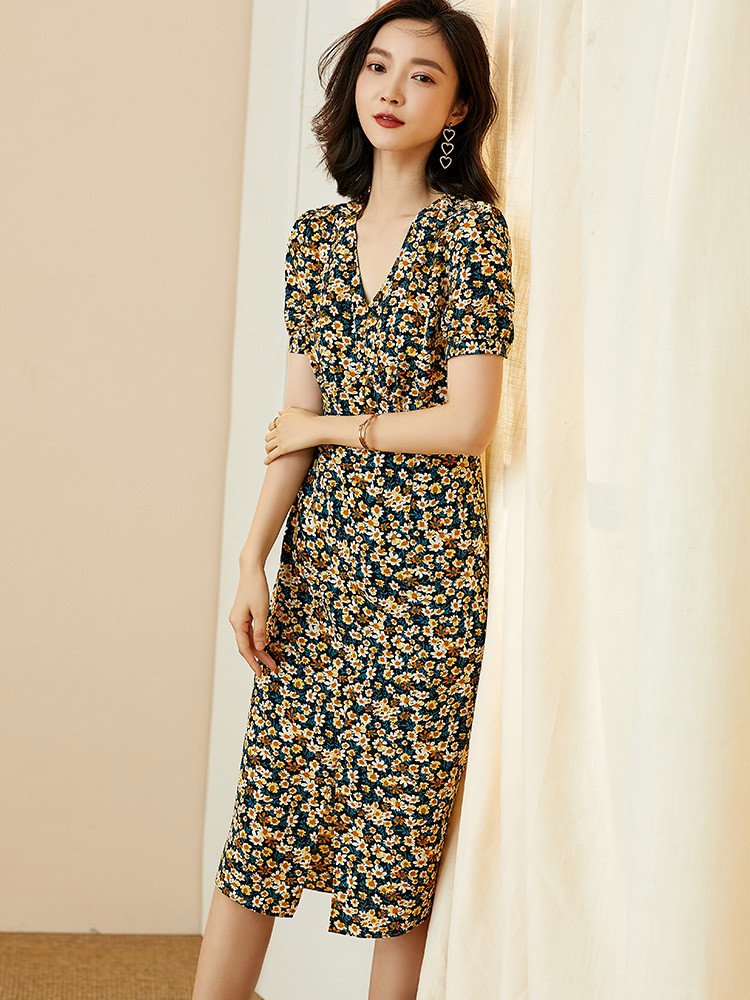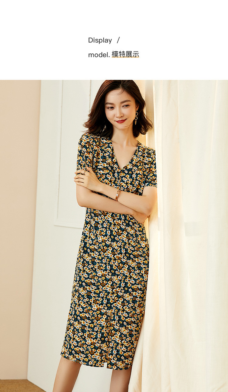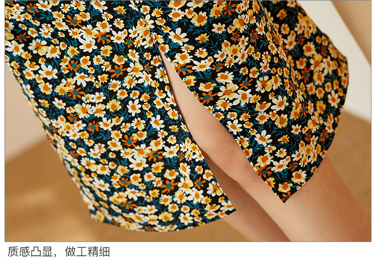 米思阳夏季2021新款时尚复古小碎花V领开叉薄款连衣裙