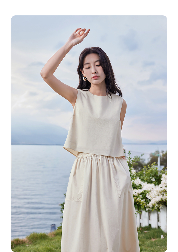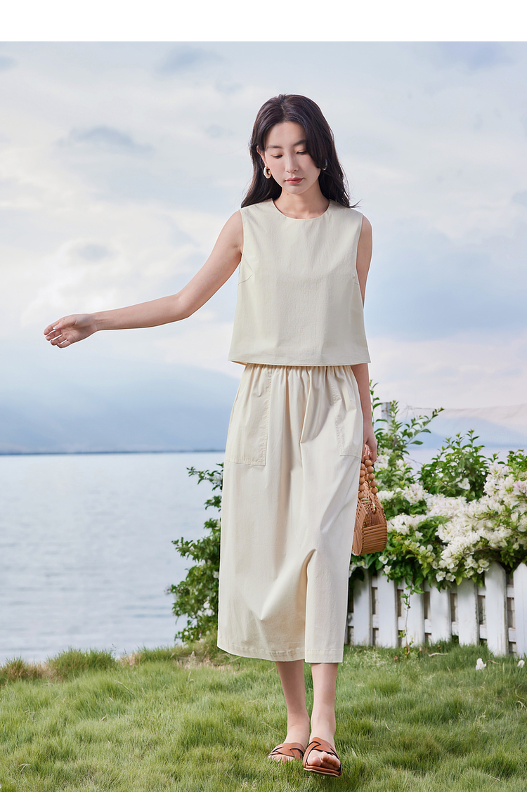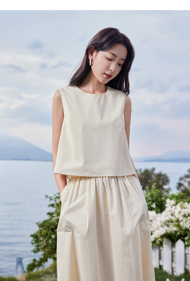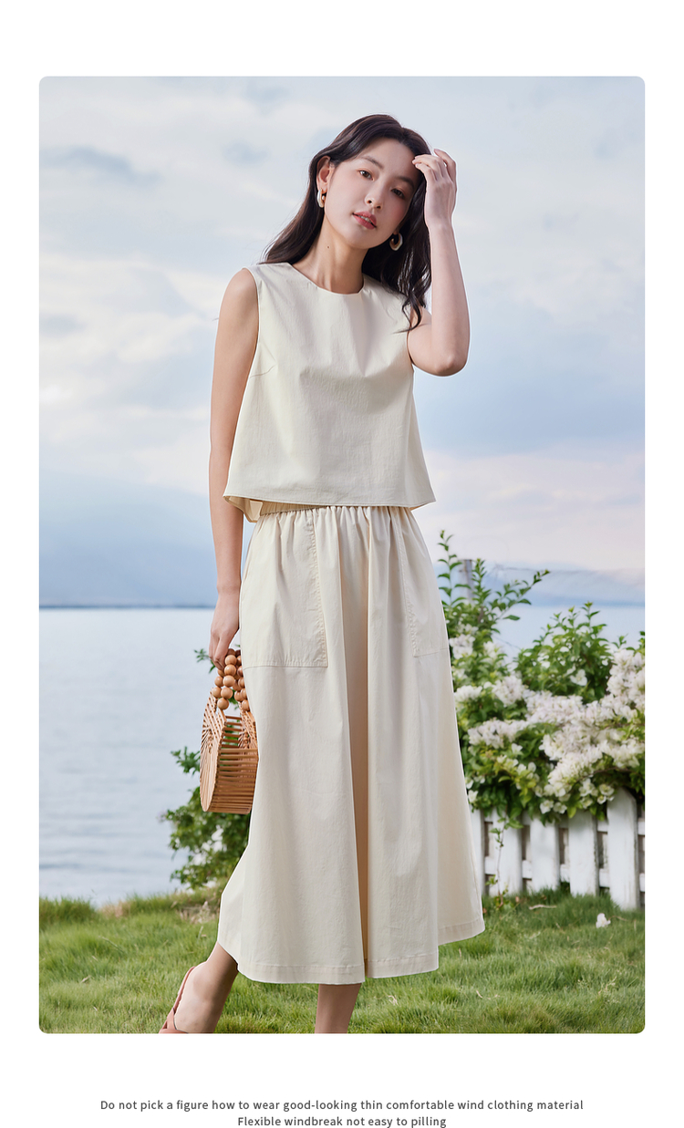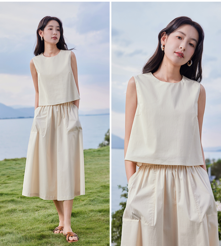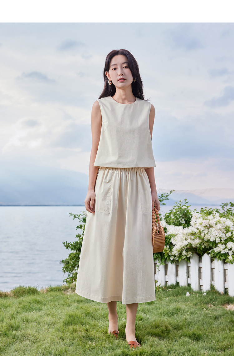 【专属特价】熙世界2025夏新款女装盐系穿搭无袖圆领背心上衣半身裙两件套装