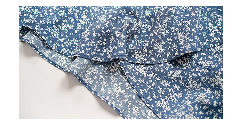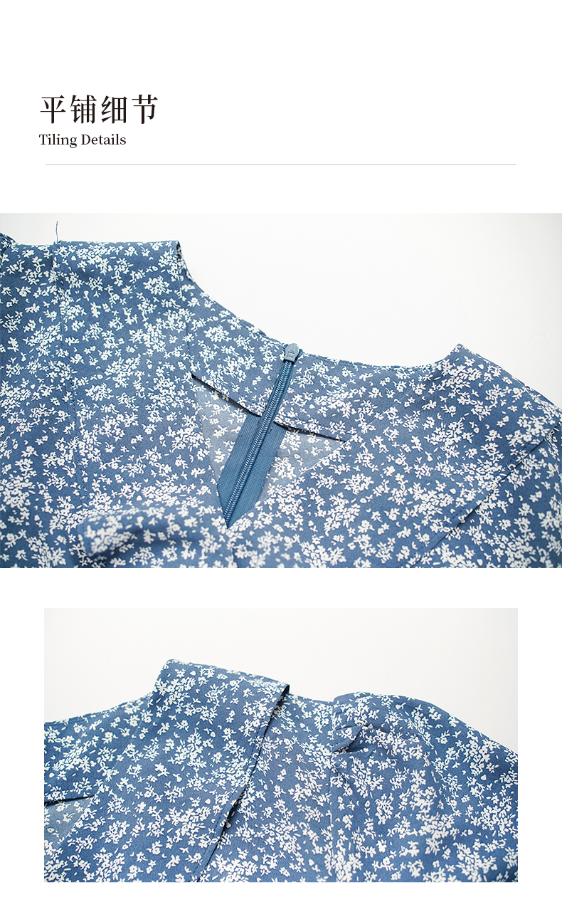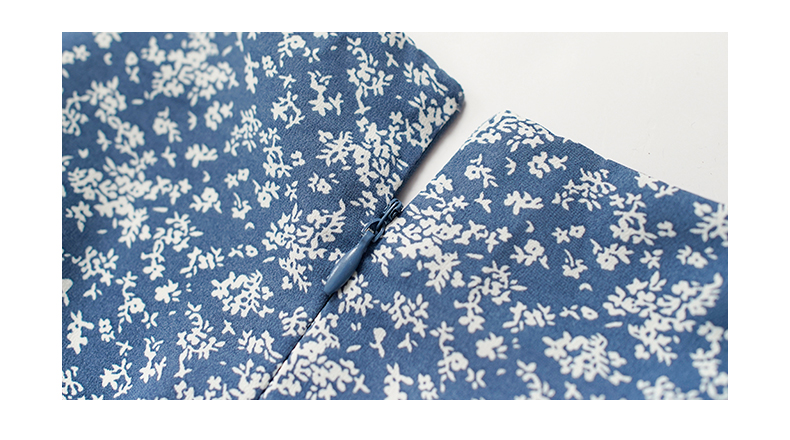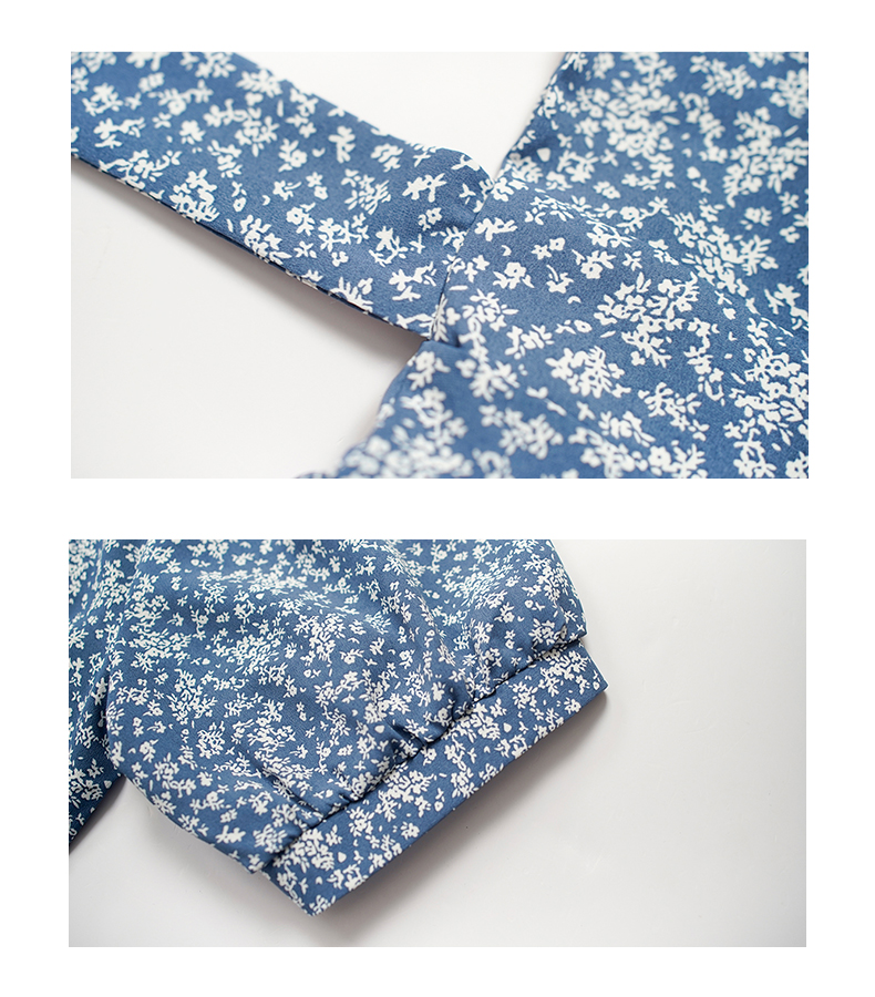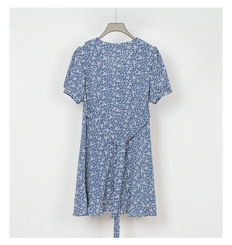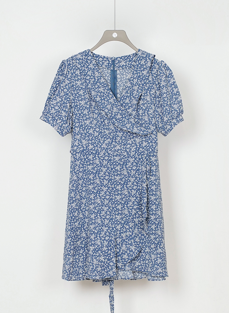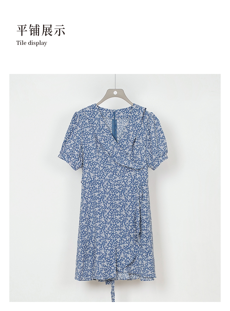 NUTS夏季新款法式小清新蓝色V领碎花短袖连衣裙女