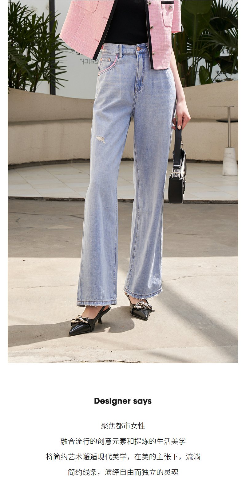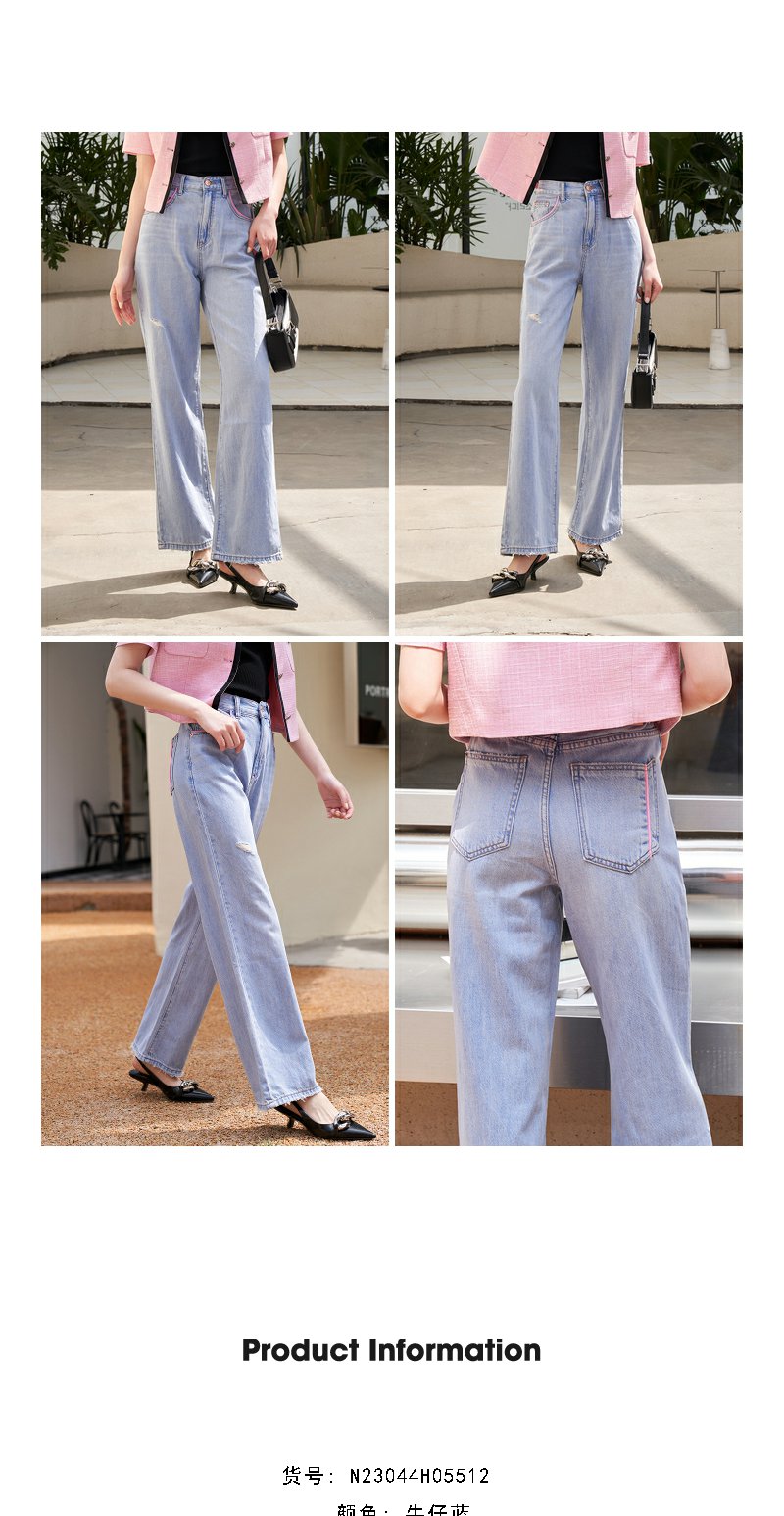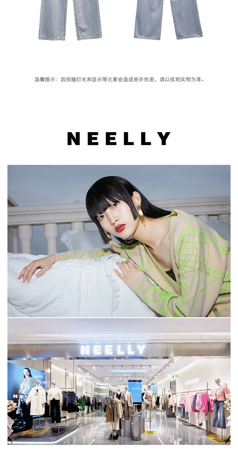 NEELLY纳俪撞色个性宽松直筒阔腿裤女柔软磨边破洞浅蓝牛仔裤薄款