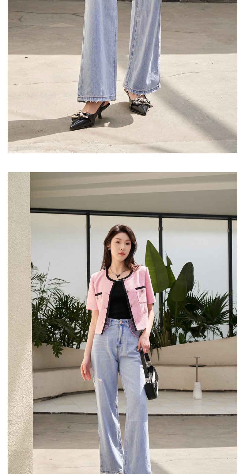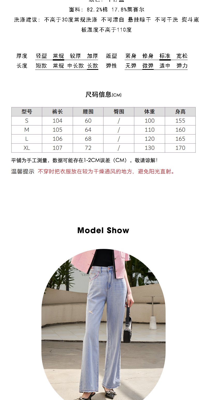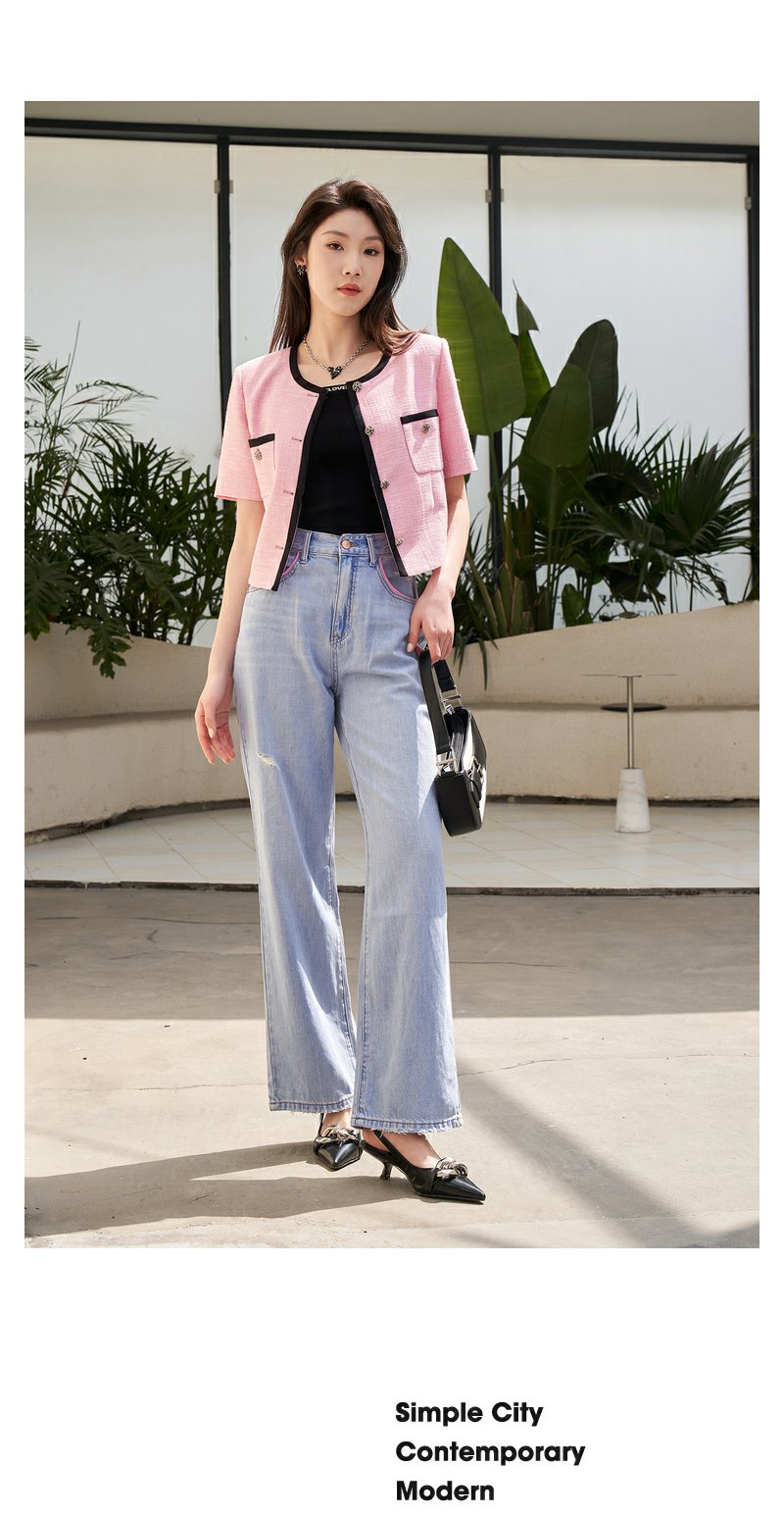 NEELLY纳俪撞色个性宽松直筒阔腿裤女柔软磨边破洞浅蓝牛仔裤薄款