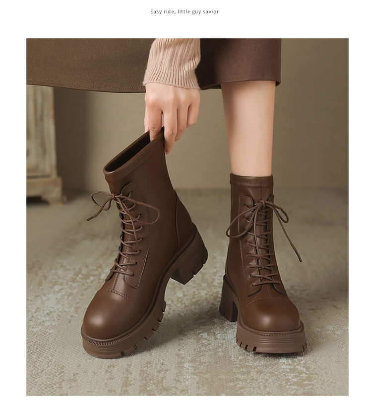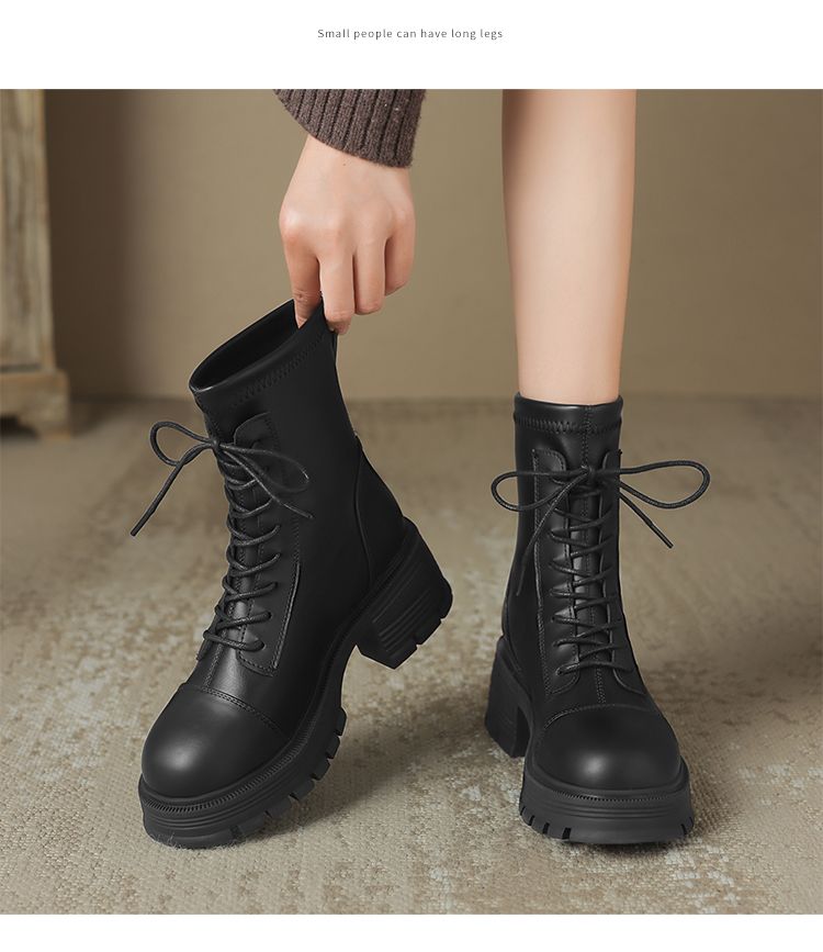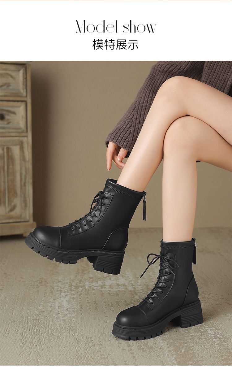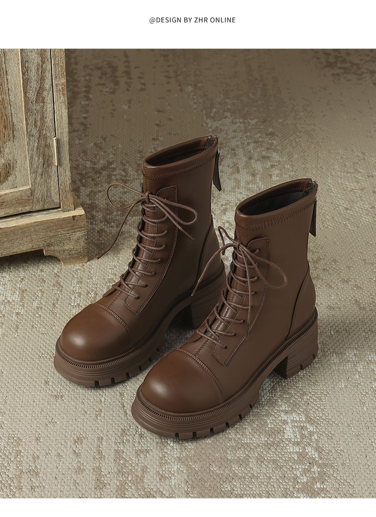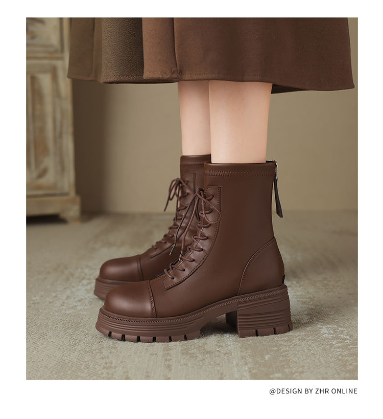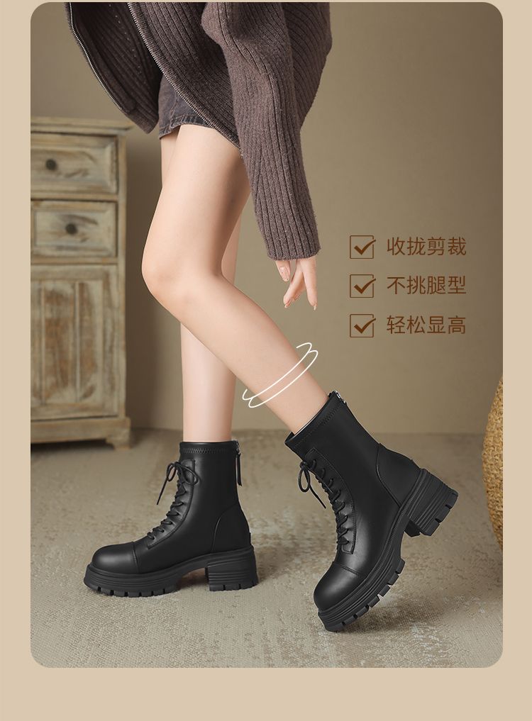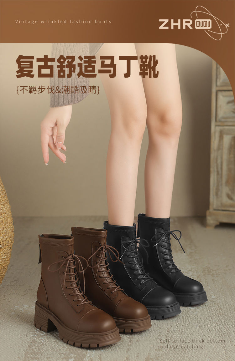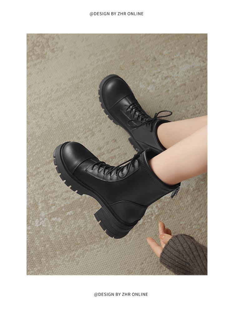 ZHR厚底马丁靴女2024秋冬新款ins系带短靴薄绒保暖女靴法式瘦瘦靴