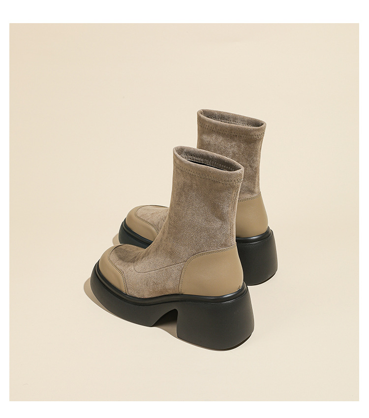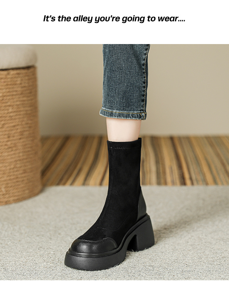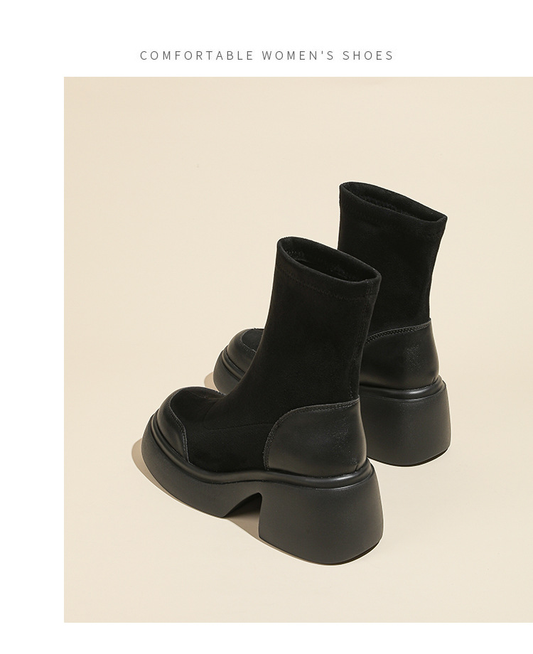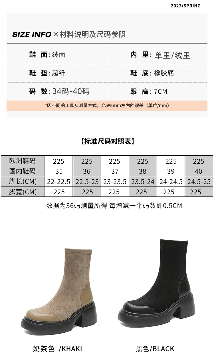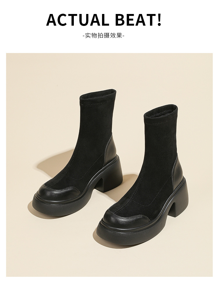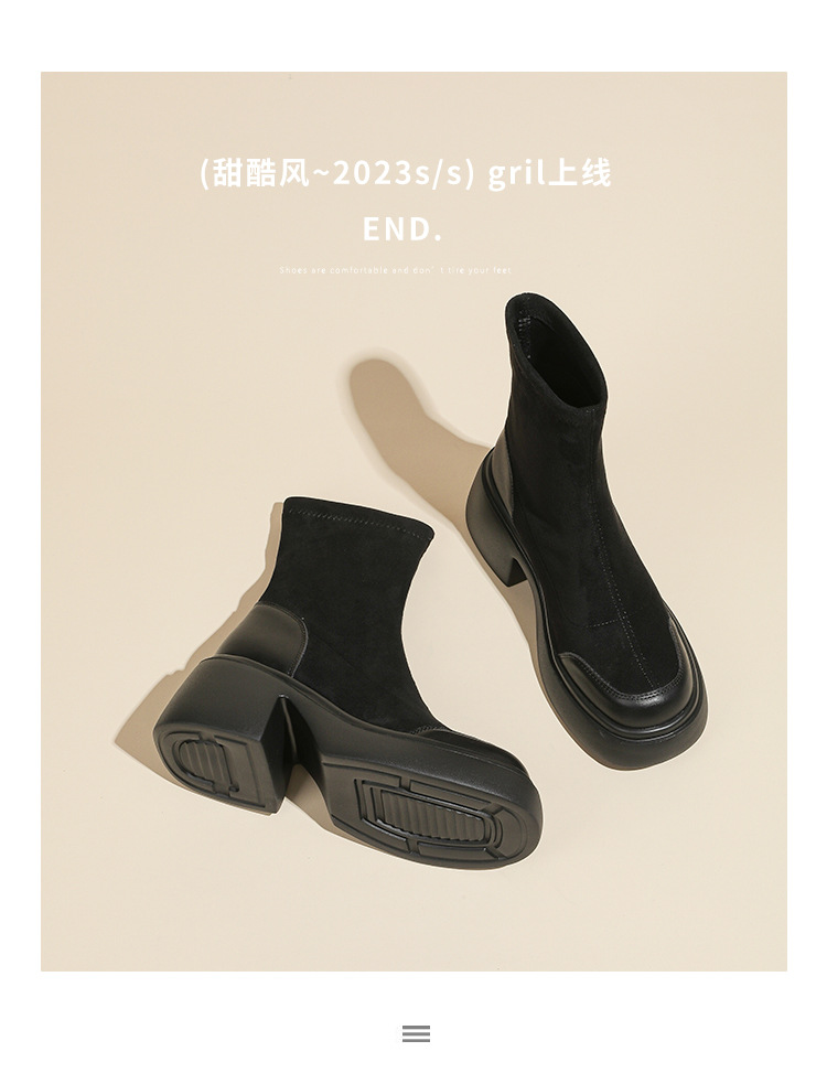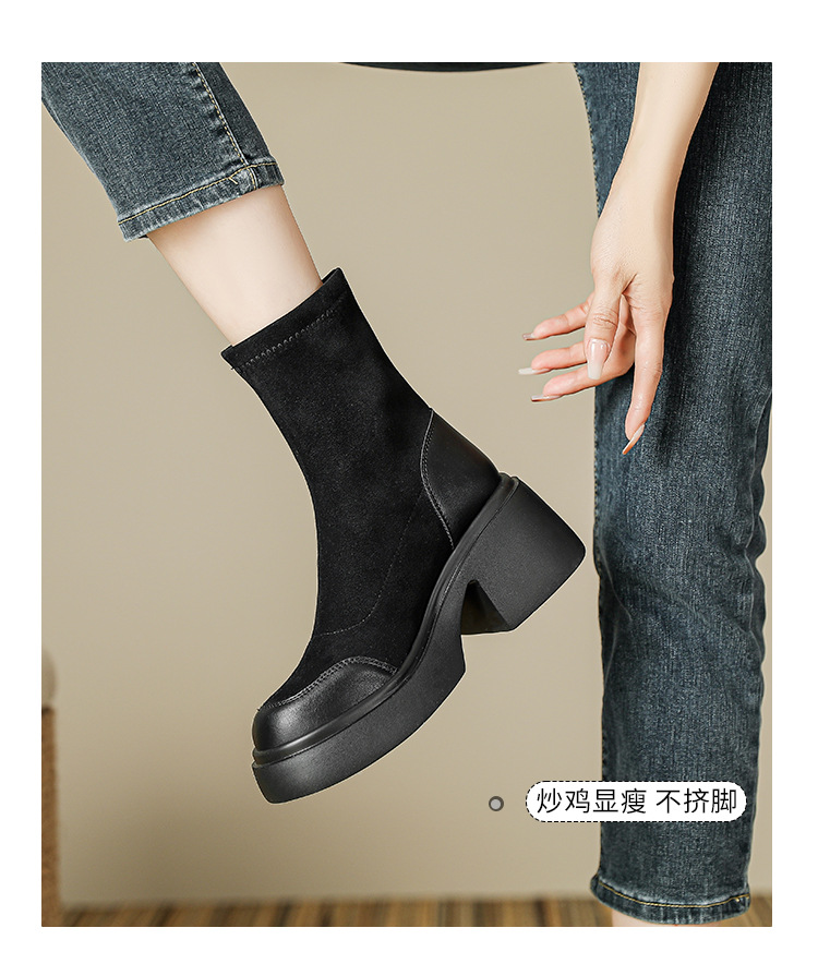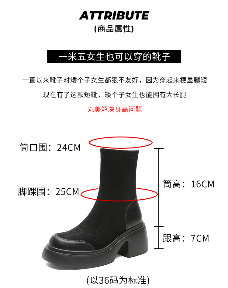 爆款现货绒面短靴女秋冬款7cm高跟厚底防水台短筒瘦瘦靴马丁靴女