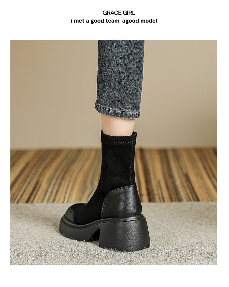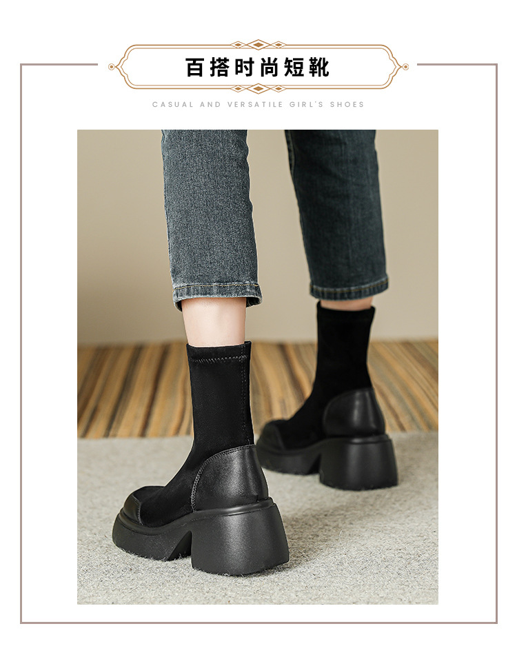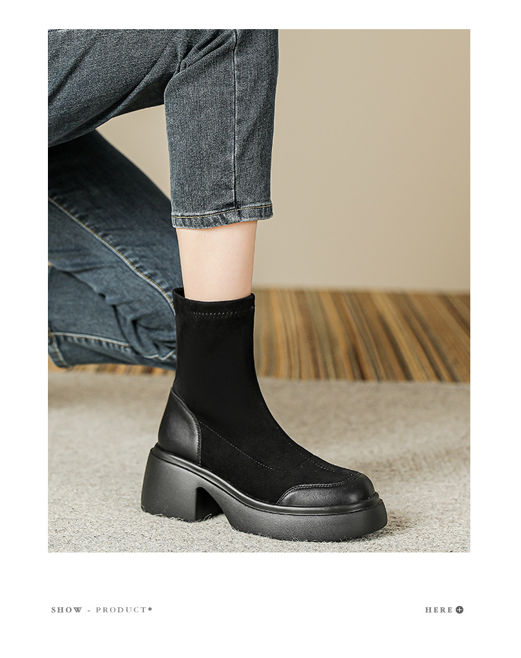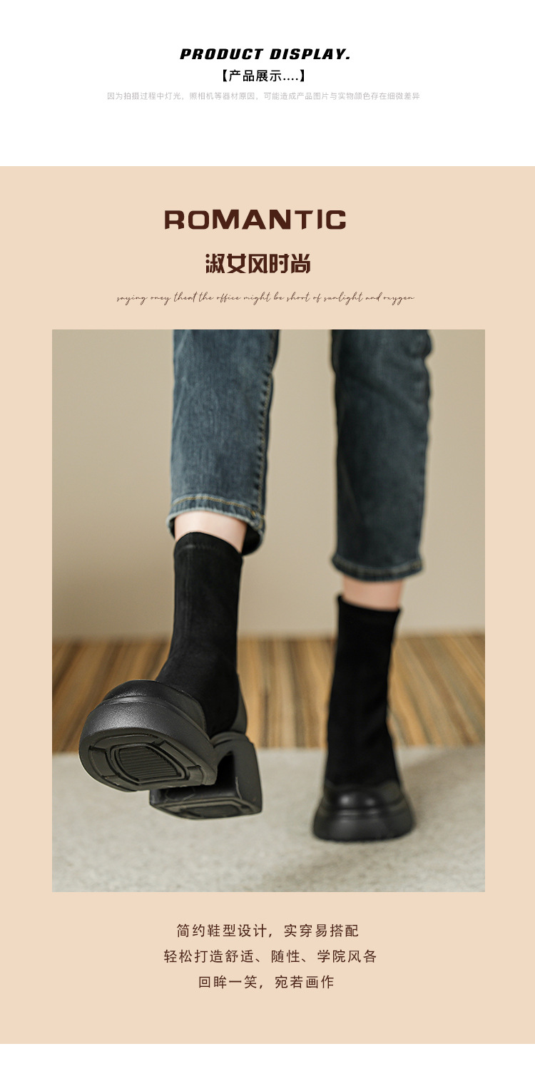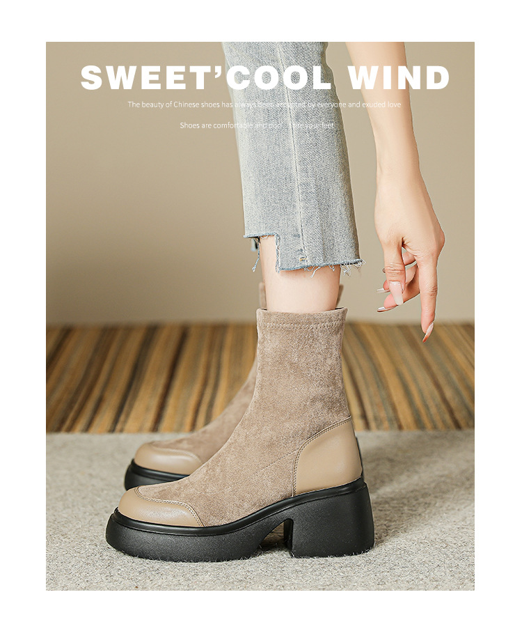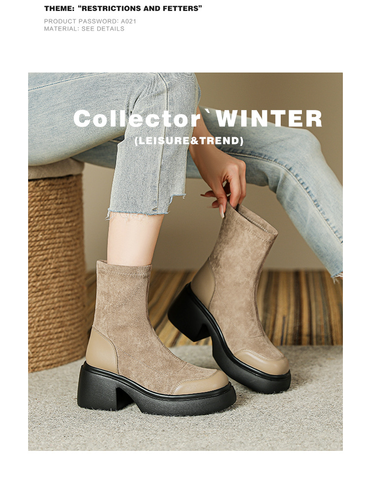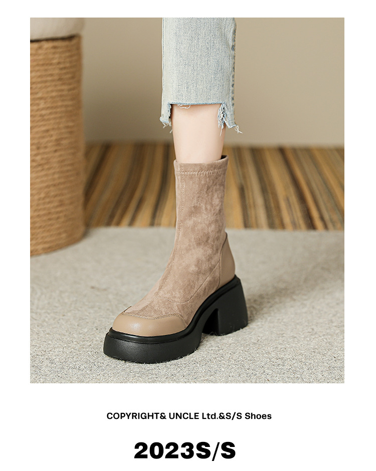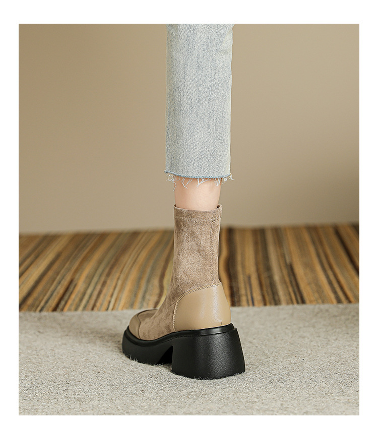 爆款现货绒面短靴女秋冬款7cm高跟厚底防水台短筒瘦瘦靴马丁靴女
