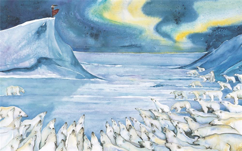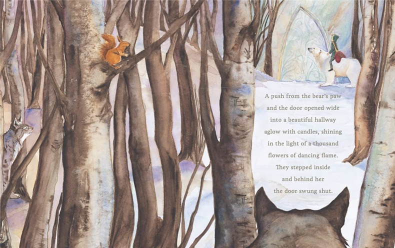 这次邂逅标志着一段漫长而不寻常的旅程的开始。在远山的熊的秘密宫殿里,她受到了非常有礼貌的对待,尽管她被熊的深不可测的悲伤所困扰。随着熊的秘密被揭开,另一场冒险也随之展开,它把她带到了四面八方的家园和更远的地方,来到了太阳以东、月亮以西的城堡。