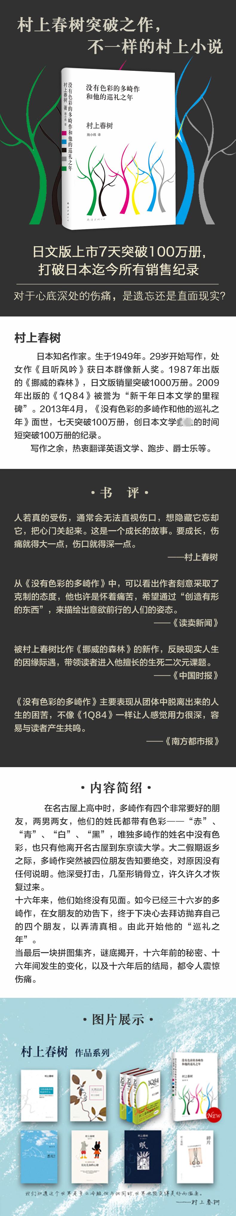 《没有色彩的多崎作和他的巡礼之年》是村上春树近期新长篇小说,也是他所有作品中“最不一样”的小说,被媒体和读者誉为“村上春树突破之作”。