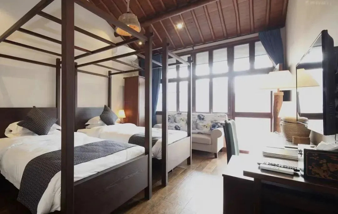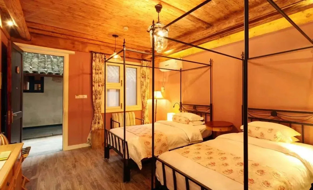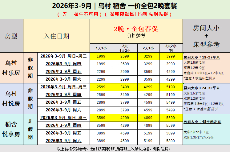 村乐房:面积19㎡-27㎡不等。大床房1.5米*1张,标间1.2米*2张,家庭房1.5米1张+1.2米1张(家庭房较少,先订先得)