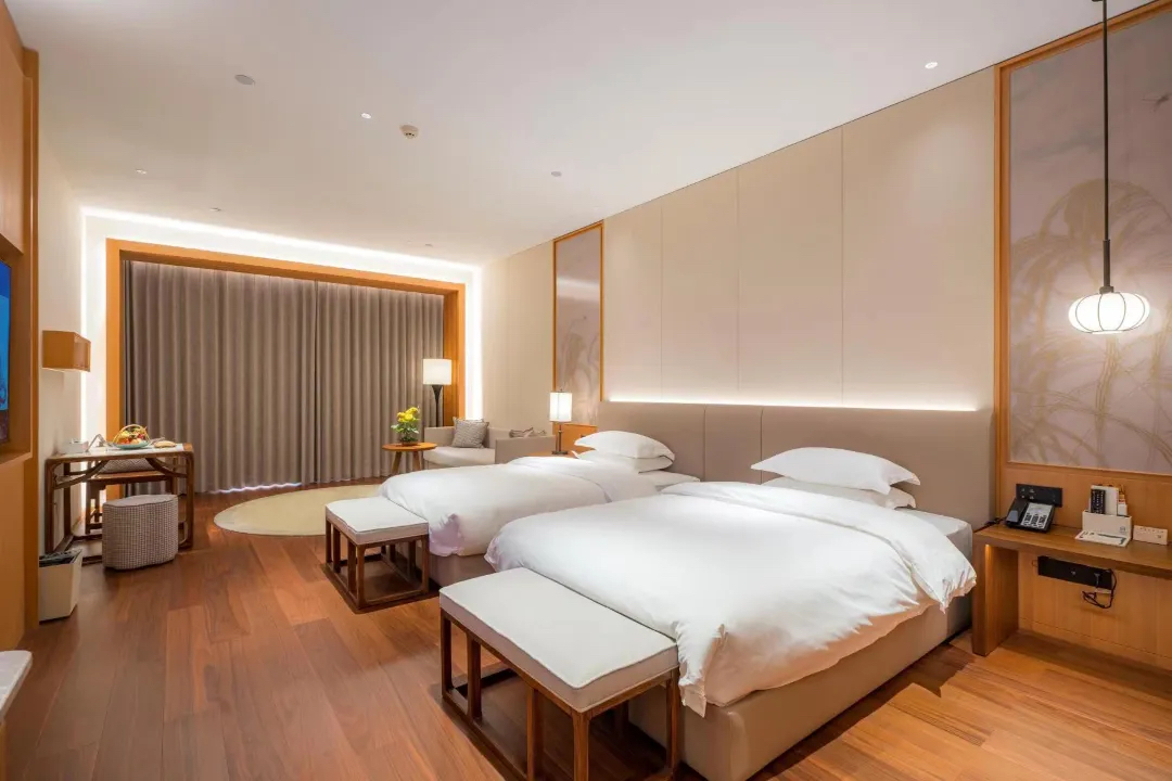 悦享房:大床房面积38-48m²,床2米*1张;标间面积47-56m²,床1.35米*2张