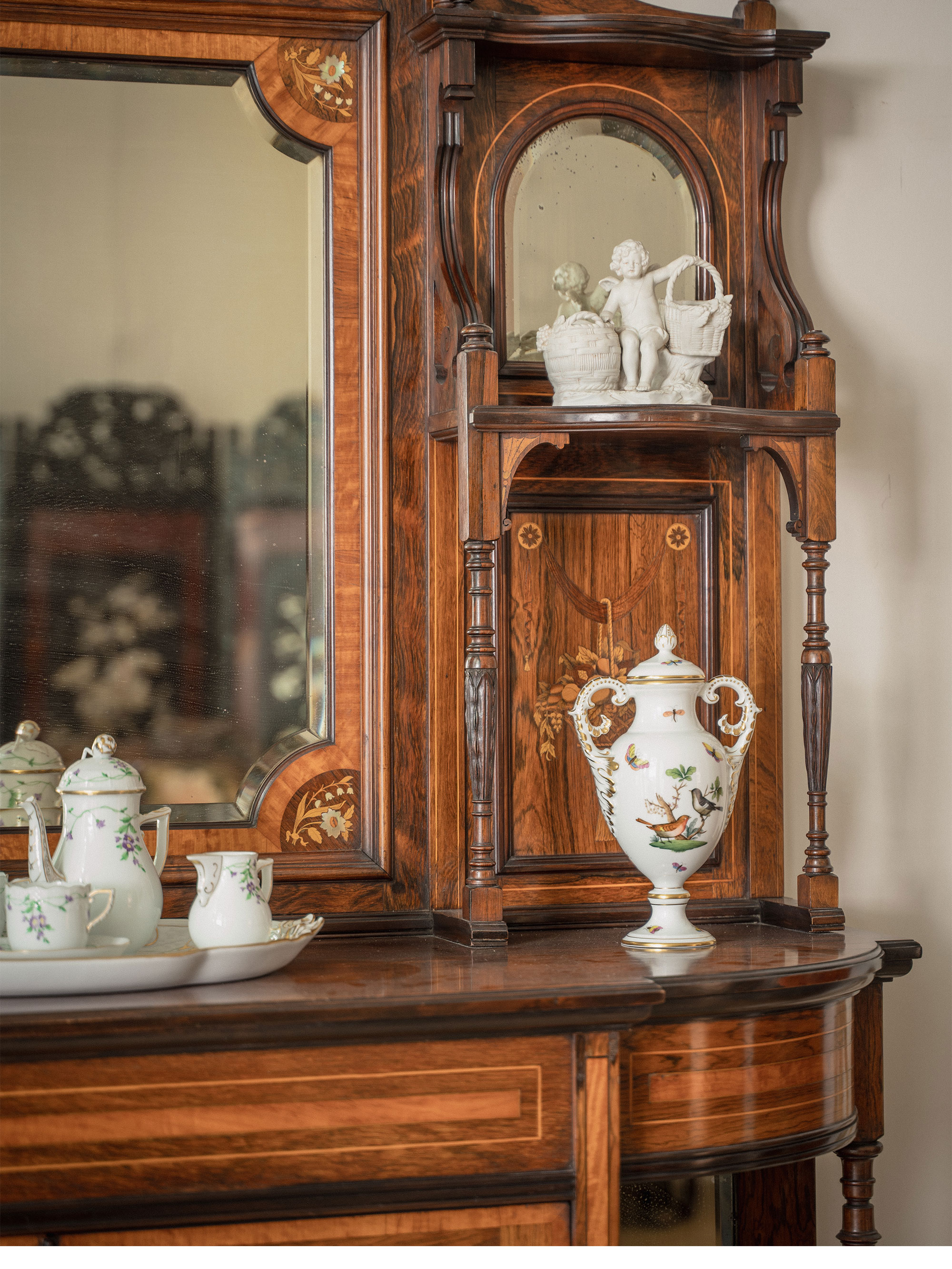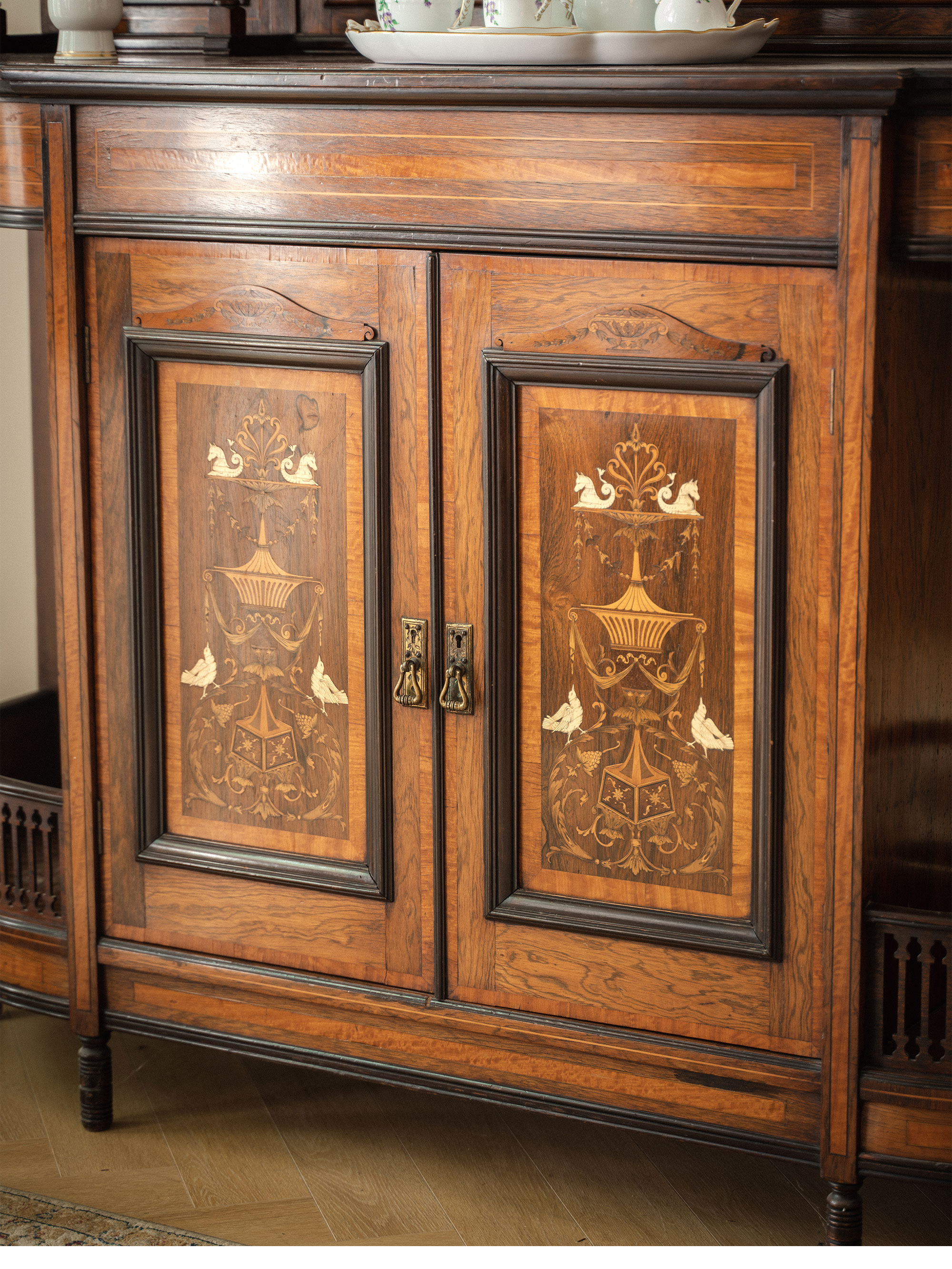 1890年代英国工坊出品新古典主义风格纹饰细木镶嵌带镜大型餐边柜