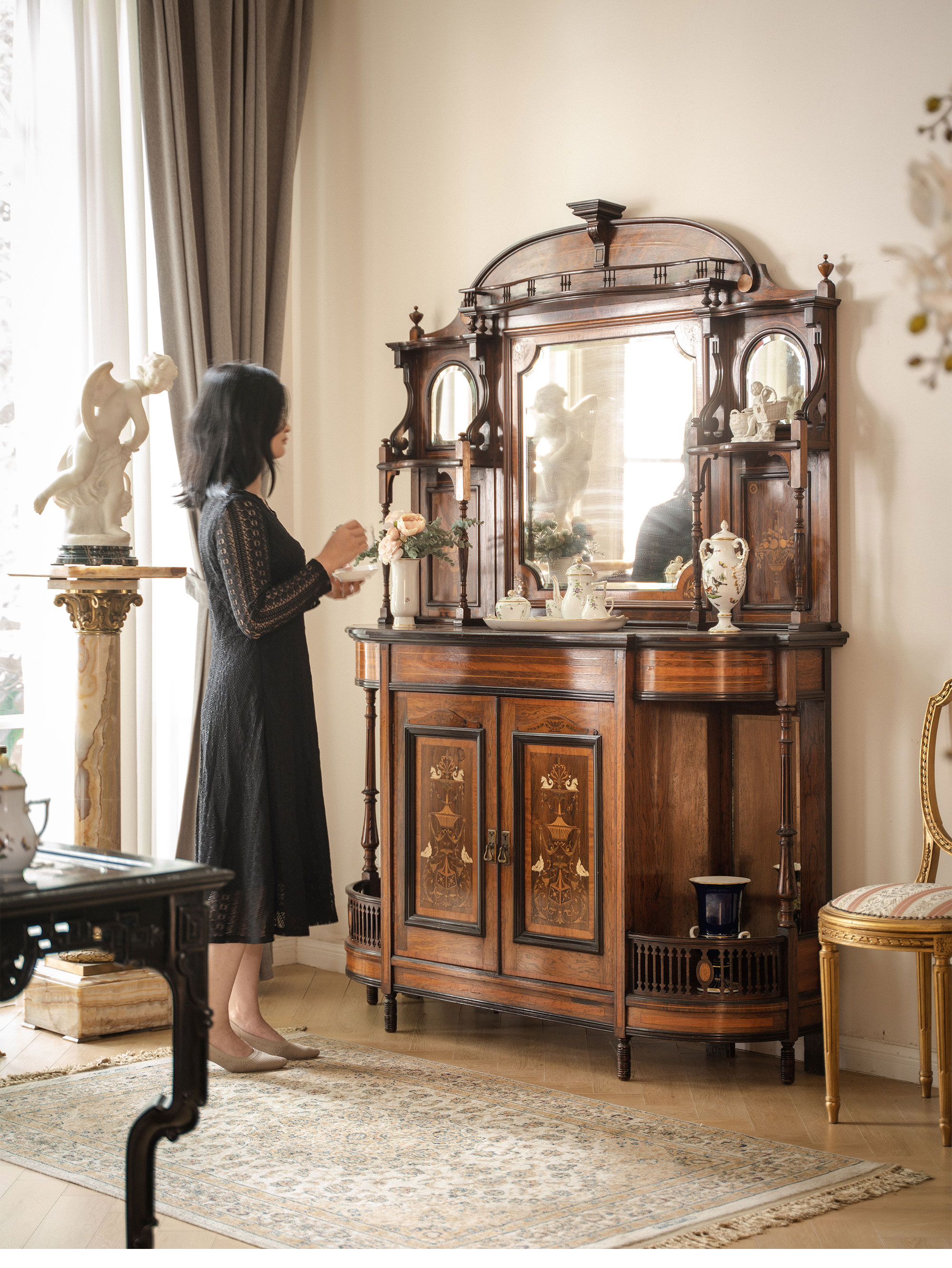 【已售】独角鹿西洋古董 1890年代英国工坊出品新古典主义风格纹饰细木镶嵌带镜大型餐边柜