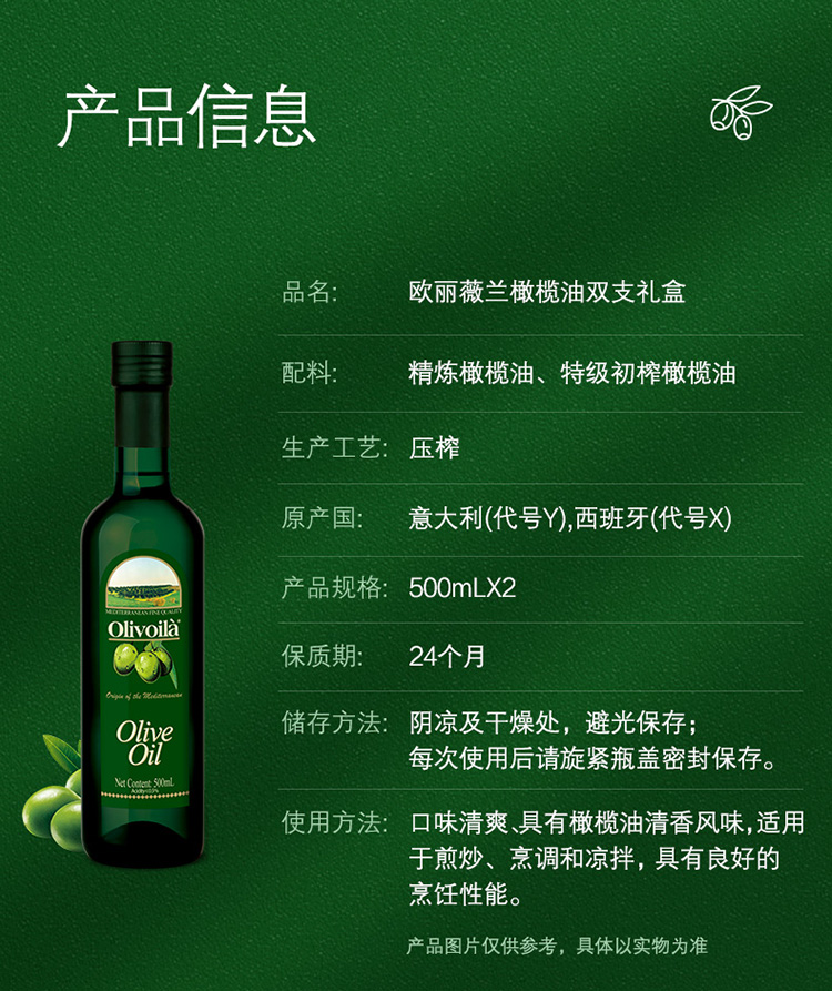 欧丽薇兰 Olivoilà 食用油 纯正橄榄油礼盒500MLx2礼盒