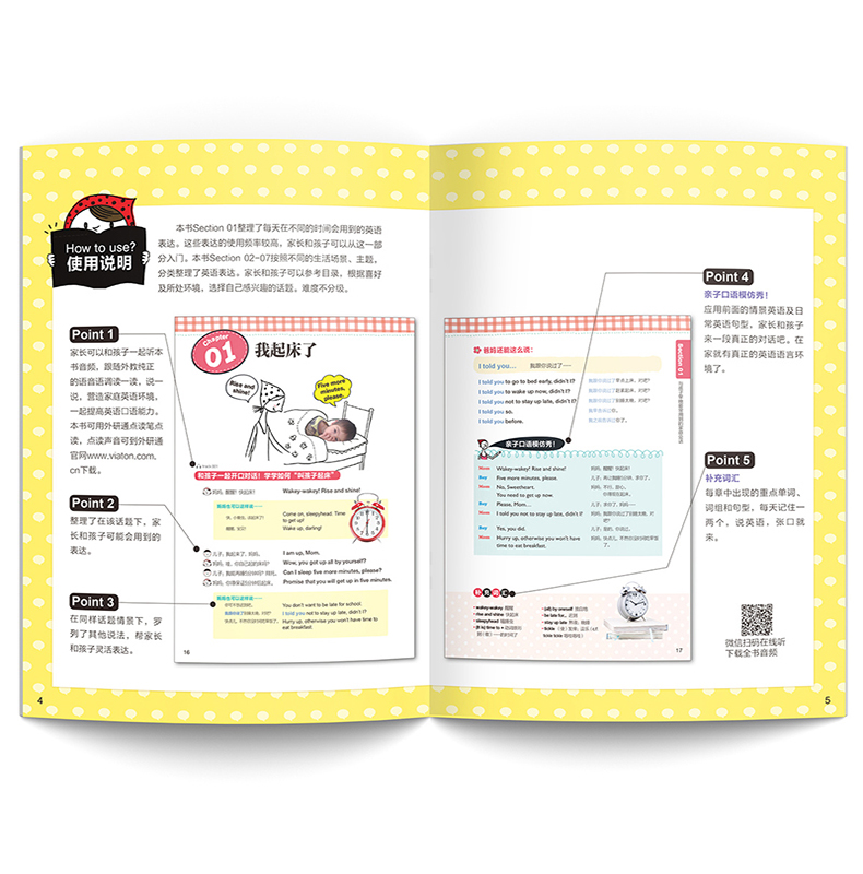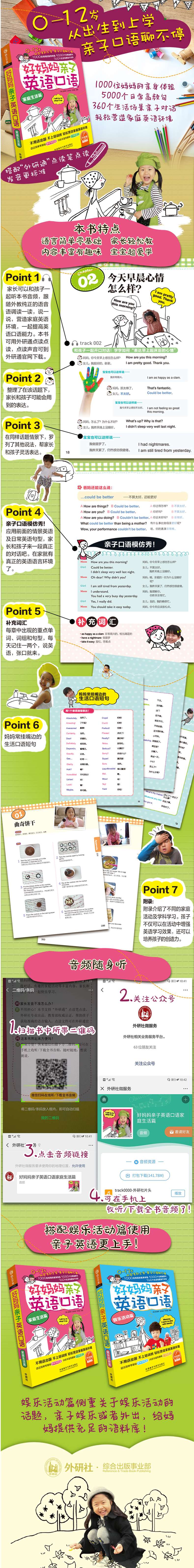 本书按照真实生活场景主题分类整理了英语口语句子、对话、词汇等,难度不分级,为家庭英语提供尽可能多的语料。家长可以根据孩子兴趣爱好选择互动话题。除此之外,本书还包括妈妈常挂嘴边的生活口语短句、家庭口语精选对话、有趣的家庭活动等丰富内容。家长和孩子可以一起快乐学习。本书支持外研通点读笔点读,扫码可下载音频。