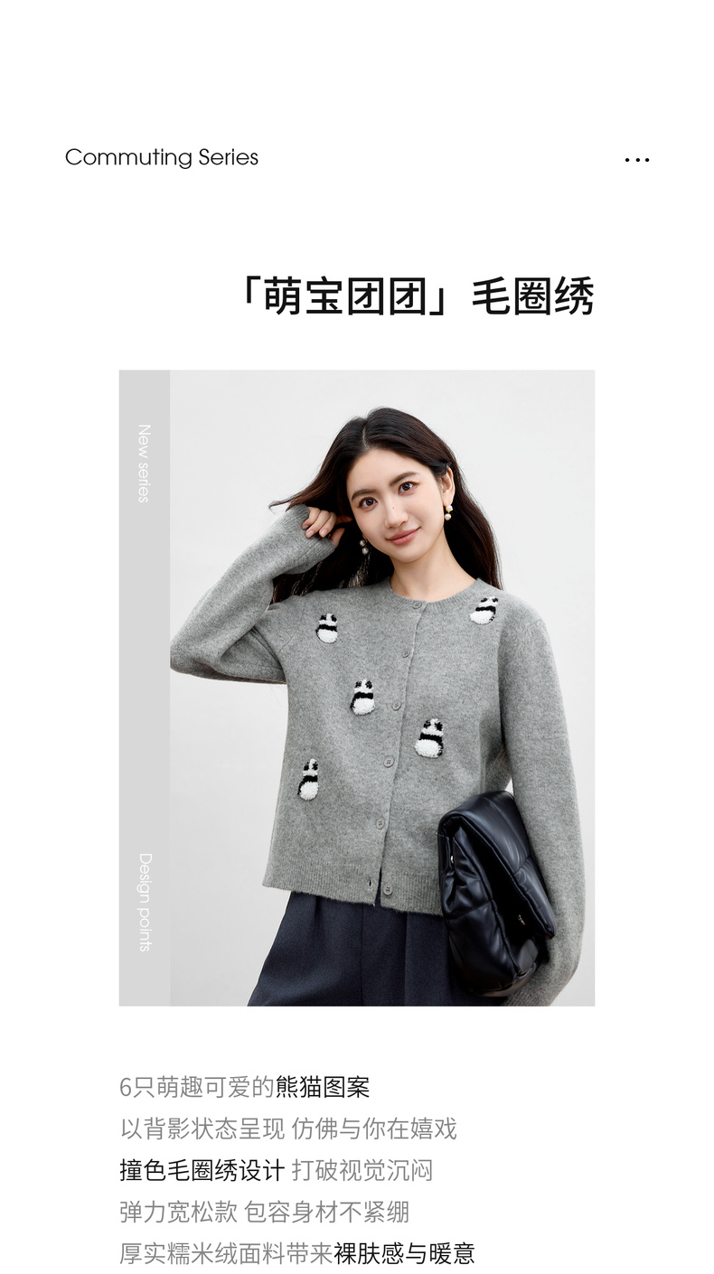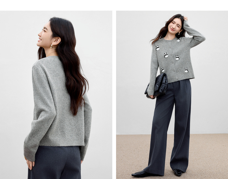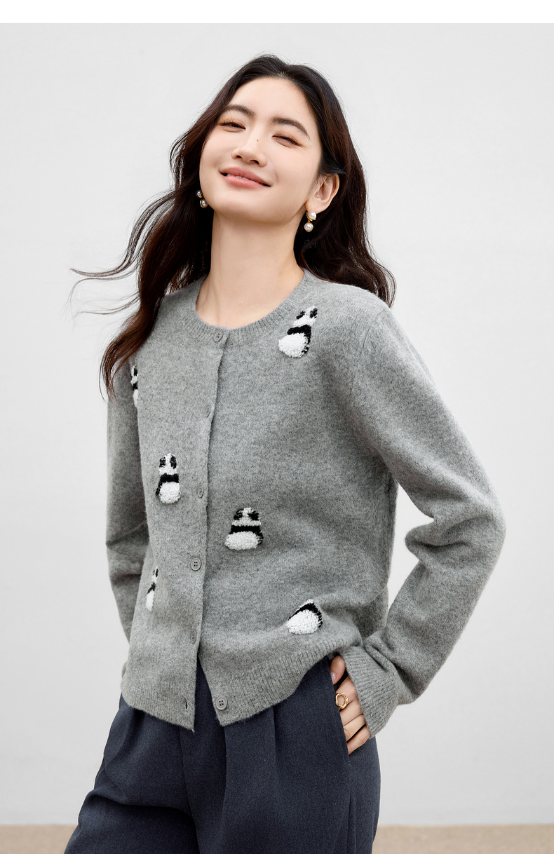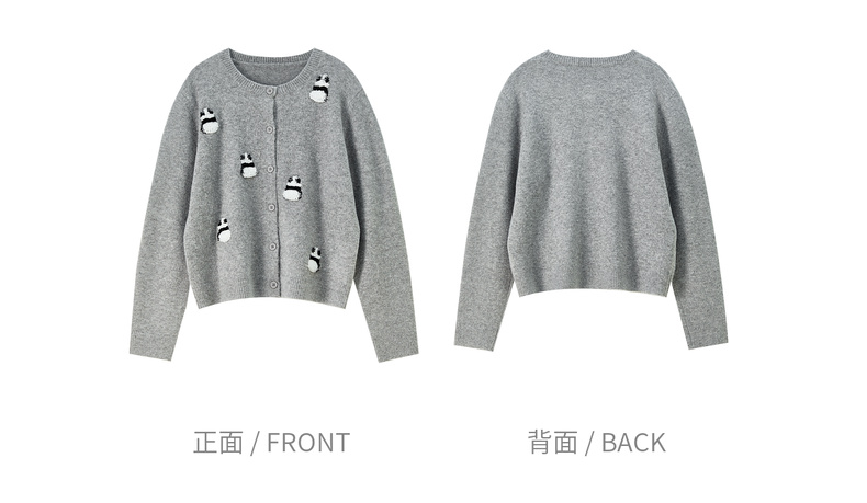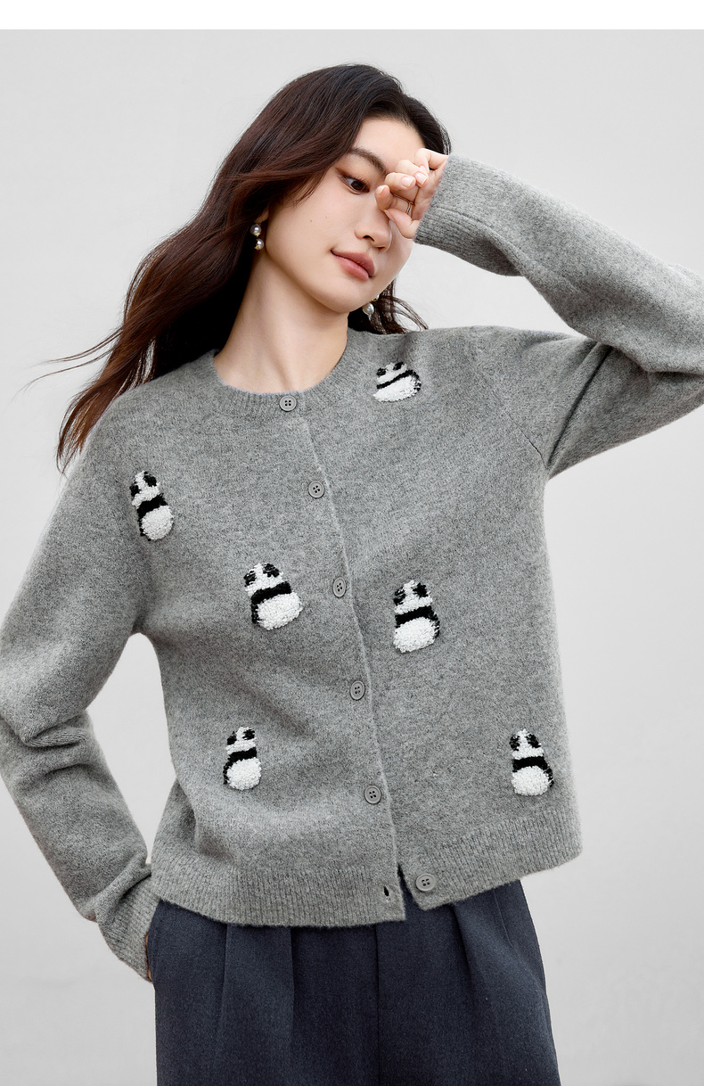 【内购】【趣味熊猫】含绵羊毛简约通勤圆领单排扣宽松弹力保暖厚开衫毛衣-W53EB3143