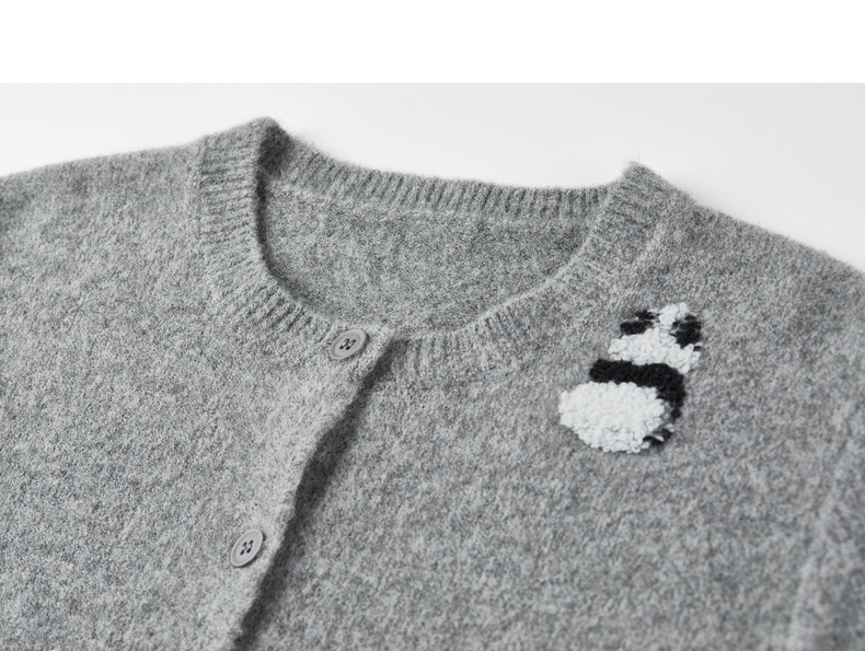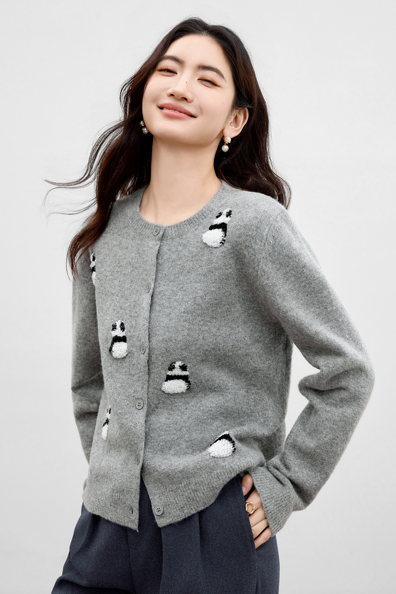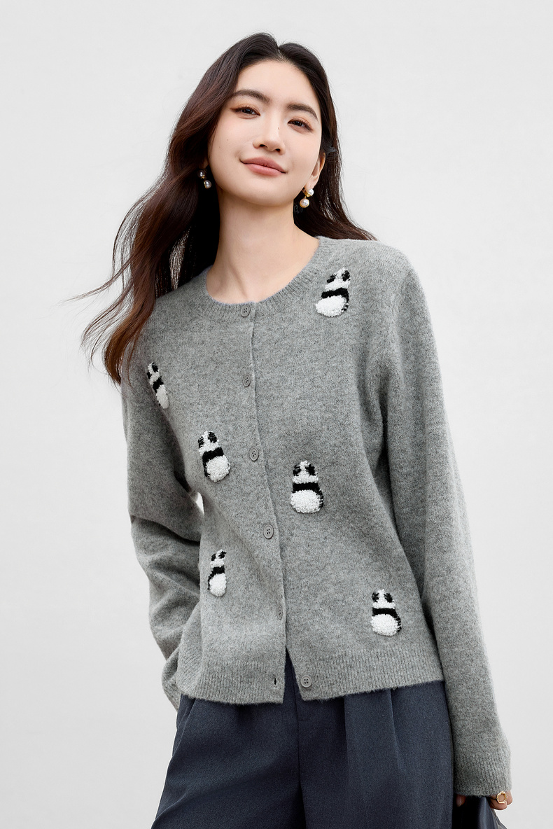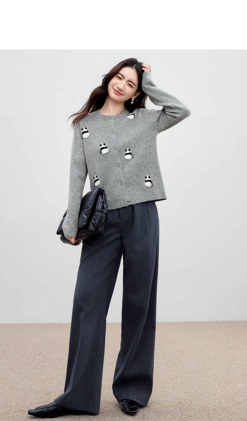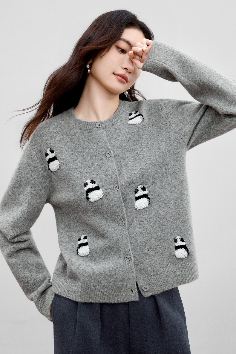 【内购】【趣味熊猫】含绵羊毛简约通勤圆领单排扣宽松弹力保暖厚开衫毛衣-W53EB3143