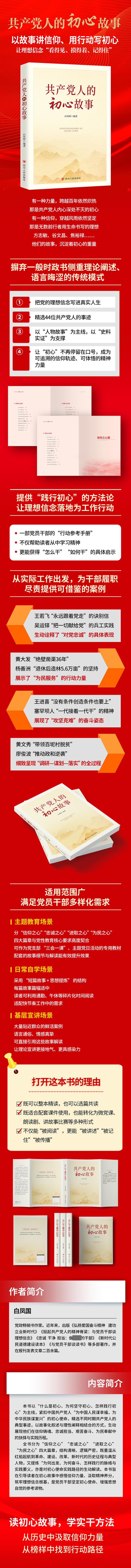 1.用“故事+史料”讲初心,让理想信念“看得见、摸得着、记得住” 本书摒弃一般时政书侧重理论阐述、语言晦涩的传统模式,以“人物故事”为主线,以“史料实证”为支撑,把党的理想信念写进真实人生。书中精选44位共产党人的事迹,既重温从红船起航到革命、建设、改革、新时代的历史征程与典型人物,又提炼“为何出发、为何奋斗、怎样践行”的脉络与实践要义;既有、方志敏的信仰坚守,也有焦裕禄、谷文昌的公仆情怀,更有黄大年、张桂梅、王传喜等新时代楷模的担当作为。这种“故事叙事+史料注解”的结构打破了传统理论读物的“说教感”,既有可读性,又有思想性;使读者既能被故事打动,又能从史料中获得思想启迪。它让“初心”不再停留在口号层面,而成为可追溯的信仰轨迹、可体悟的精神力量,是一本难得的“有温度、有依据、有思想”的党员学习读物。 2.提供“践行初心”的方法论,让理想信念落地为工作行动 这本书不是故事集,而是一本党员干部的“行动参考手册”。它围绕“如何坚守初心、如何践行使命”,从实际工作出发,为干部履职尽责提供可借鉴的路径。 书中王若飞“永远跟着党走”的诀别信、吴运铎“把一切献给党”的兵工实践,生动诠释了“对党忠诚”的具体表现;黄大发“绝壁凿渠36年”、杨善洲“退休后造林5.6万亩”的坚持,展示了“为民服务”的行动力量;王进喜“没有条件创造条件也要上”、塞罕坝人“一代接着一代干”的精神,展现了“攻坚克难”的奋斗姿态。特别是在乡村振兴、基层治理等一线工作中,黄文秀“带领百坭村脱贫”、廖俊波“推动政和逆袭”的案例,细致呈现“调研—谋划—落实”的全过程。 本书不仅帮助读者从中学习精神,更能助其获得“怎么干”“如何干”的具体启示,真正把初心转化为担当,把理想落在行动上。 3.适用范围广,“主题教育 + 日常自学 + 基层宣讲” 三大核心场景,满足党员干部多样化学习需求 主题教育场景:本书分“信仰之心”“忠诚之心”“进取之心”“为民之心”四大篇章,四大篇章与党性教育核心要求高度契合,可作为党支部 “三会一课”、主题党日活动的专用教材。例如开展 “坚守初心使命” 专题学习时,可结合书中方志敏 “敌人只能砍下我们的头颅,决不能动摇我们的信仰” 的狱中誓言,组织党员干部讨论 “如何在新时代保持信仰坚定”,配套的故事细节与权威解读能有效提升学习效果。 日常自学场景:全书采用 “短篇故事 + 思想提炼”的结构,每篇故事篇幅适中,读者可利用通勤、午休等碎片化时间阅读,如通过张桂梅 “创办女高” 的故事,在短时间内汲取 “无私奉献” 的精神力量,适配快节奏工作中的学习需求。 基层宣讲场景:书中大量贴近群众的鲜活案例,如 “半条被子”“红嫂用乳汁救伤员”,语言通俗、情感真挚,党员干部在农村、社区宣讲时,可直接引用这些故事解读 “初心使命”,让理论宣讲更接地气、更具感染力,帮助群众直观理解共产党人的初心本质。
