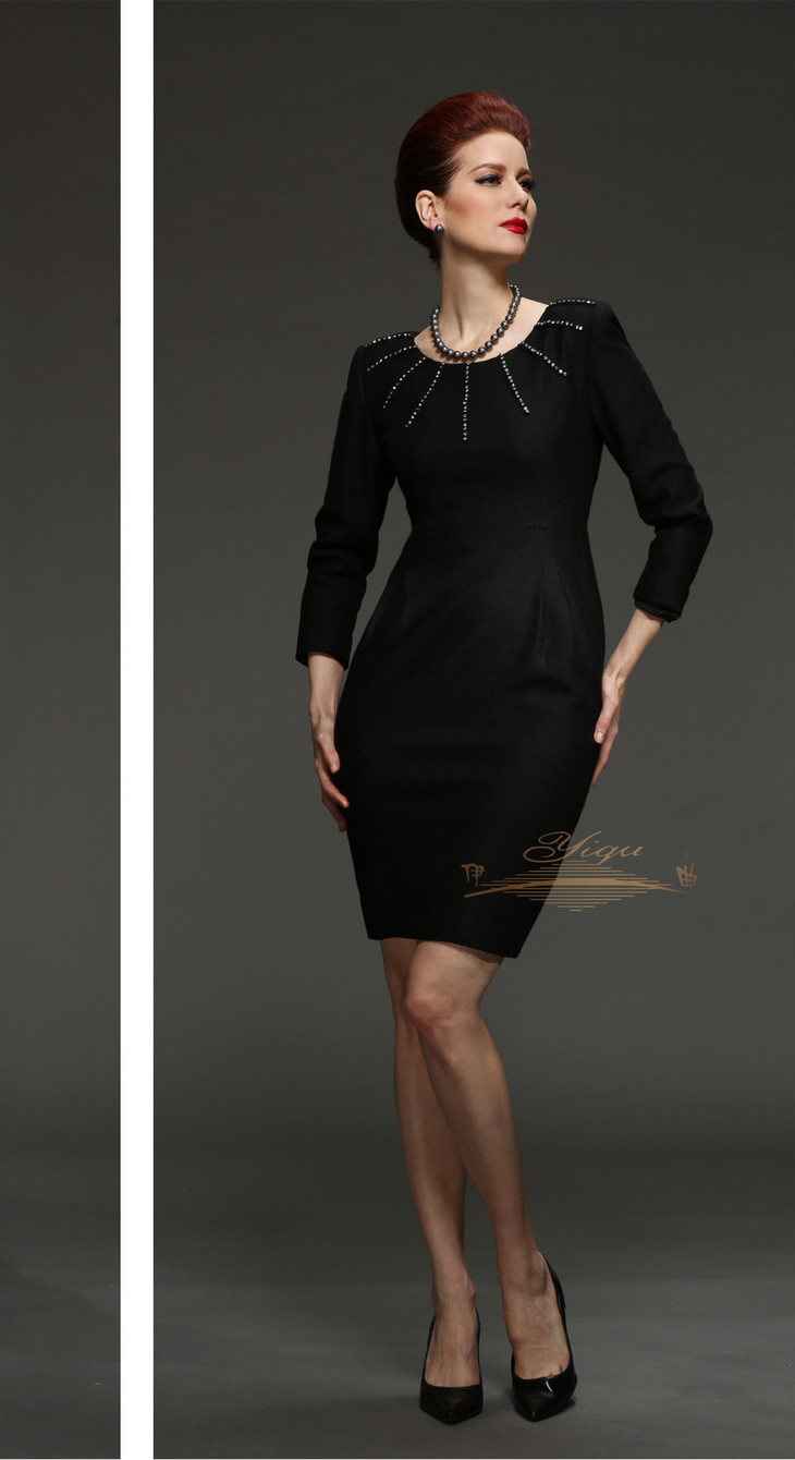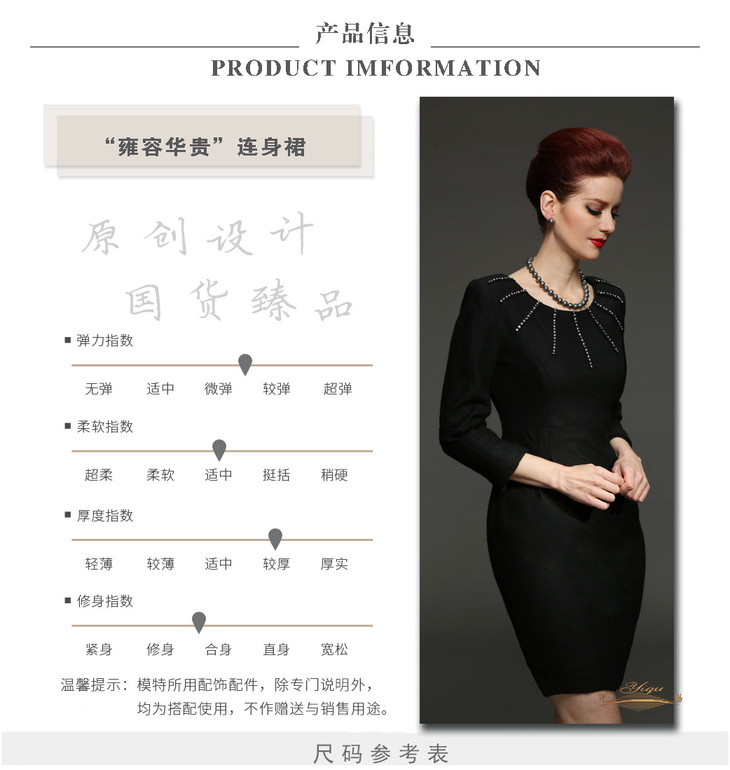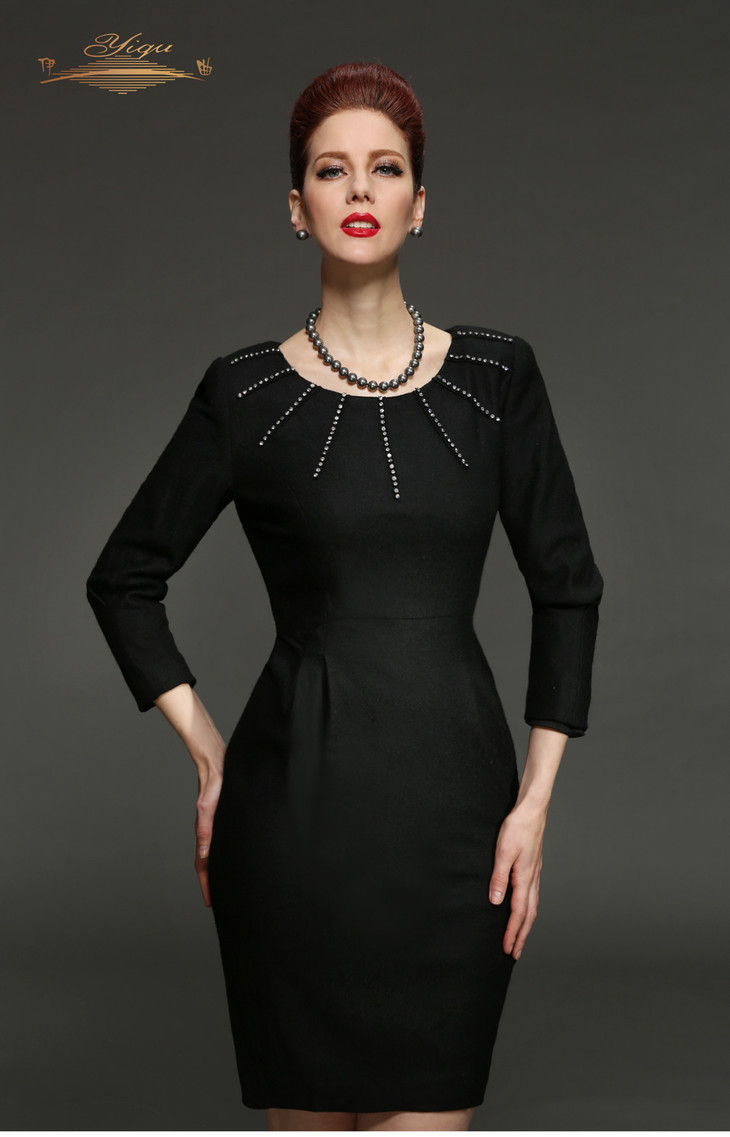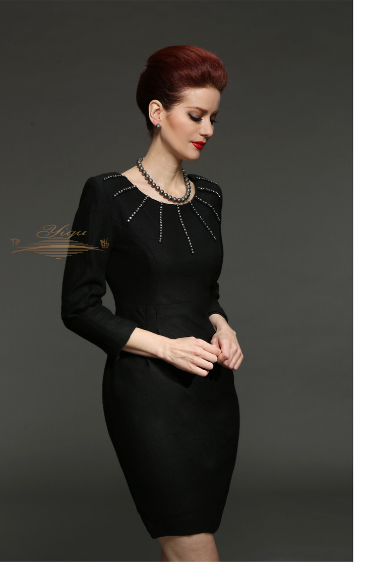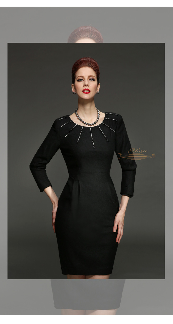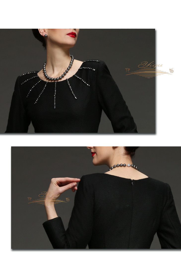 【断码】M/L/LD/XXL/XXXL码•YIQU |“雍容华贵”烫钻款连身裙(高贵黑·含45%羊毛)
