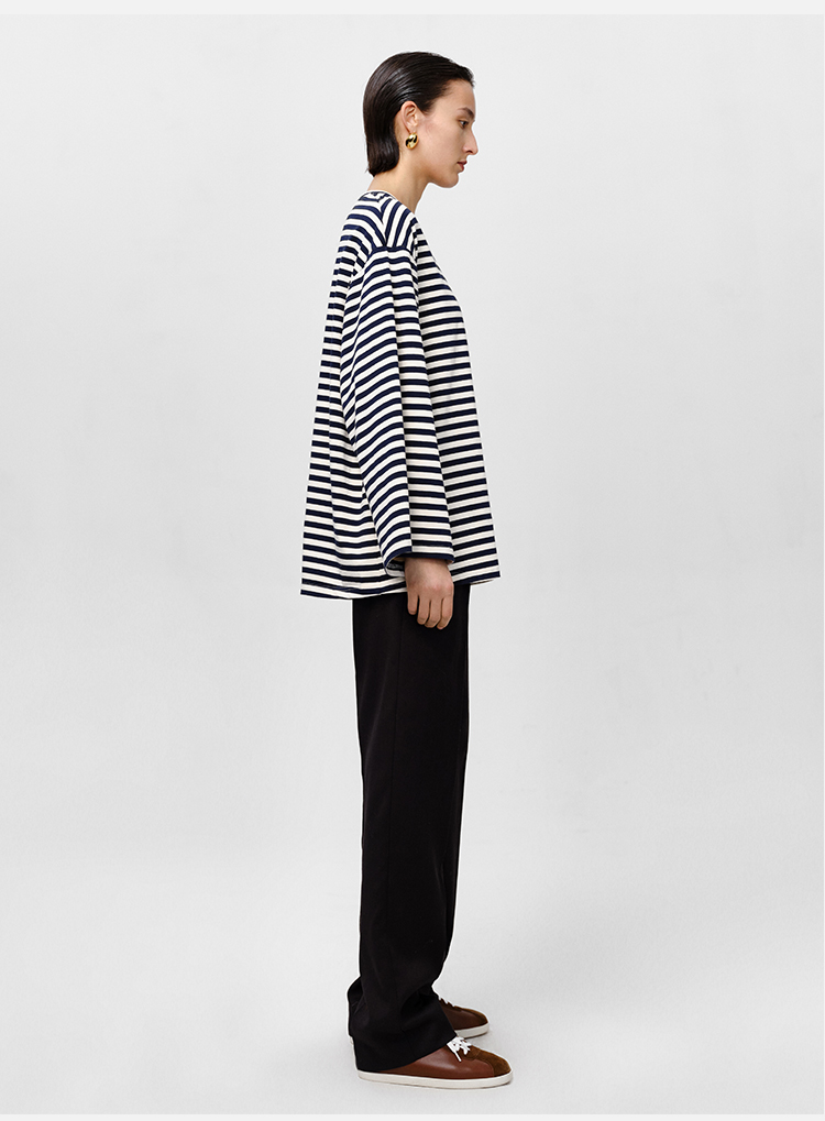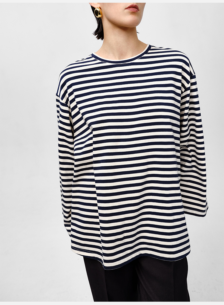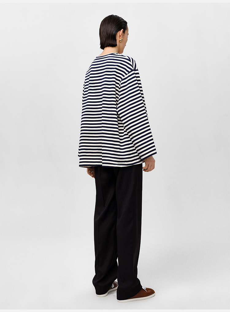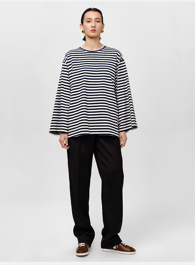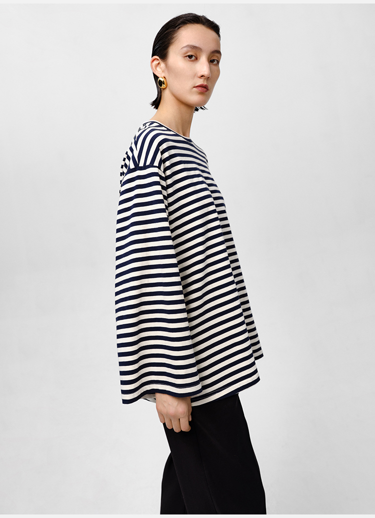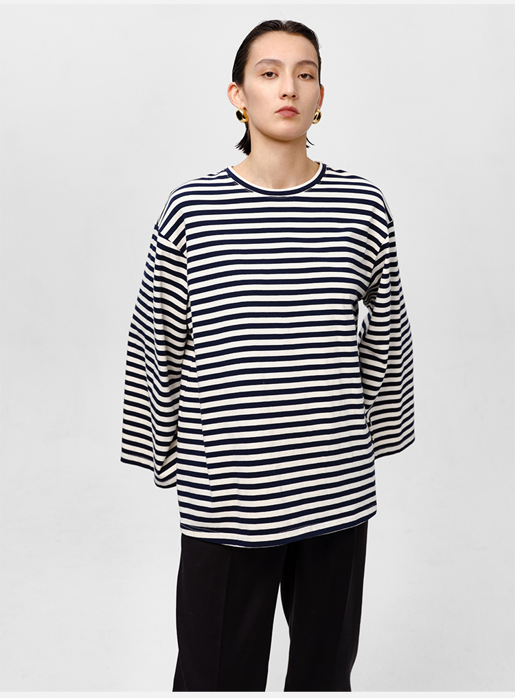 HIDEMI 条纹色织棉喇叭袖廓形圆领长袖针织上衣 蓝白/黑咖