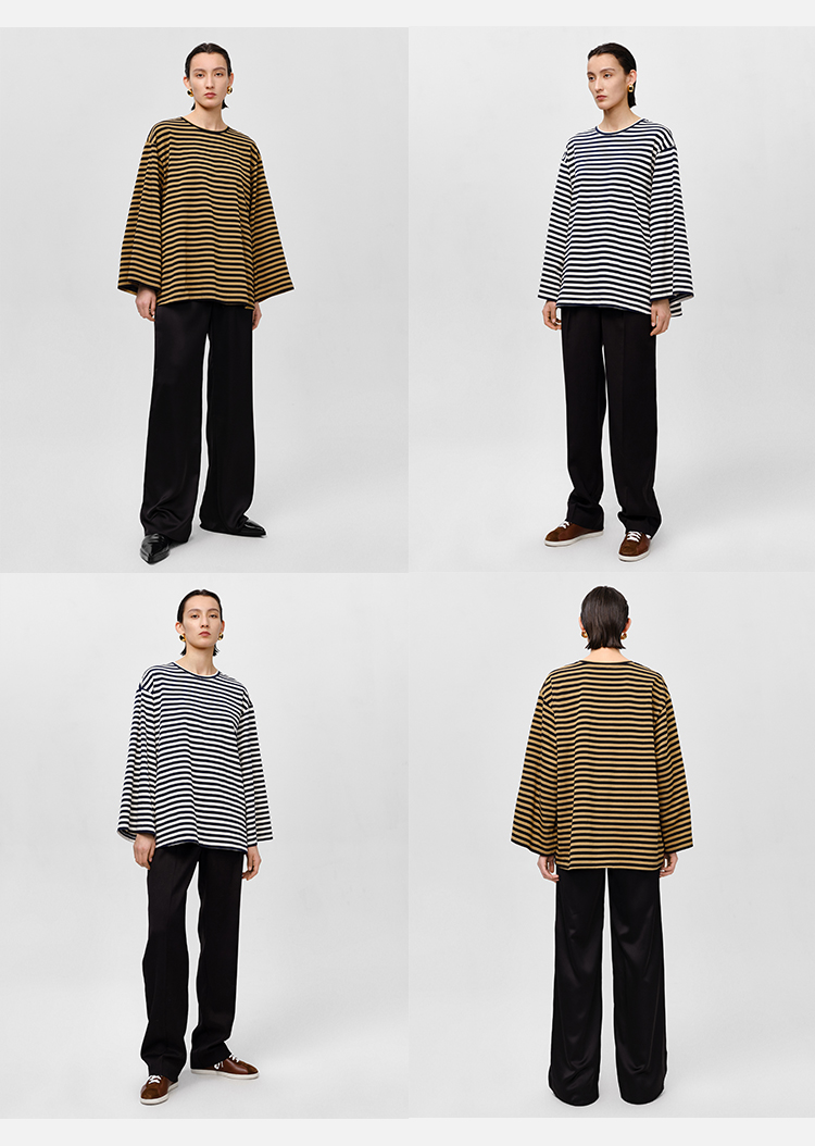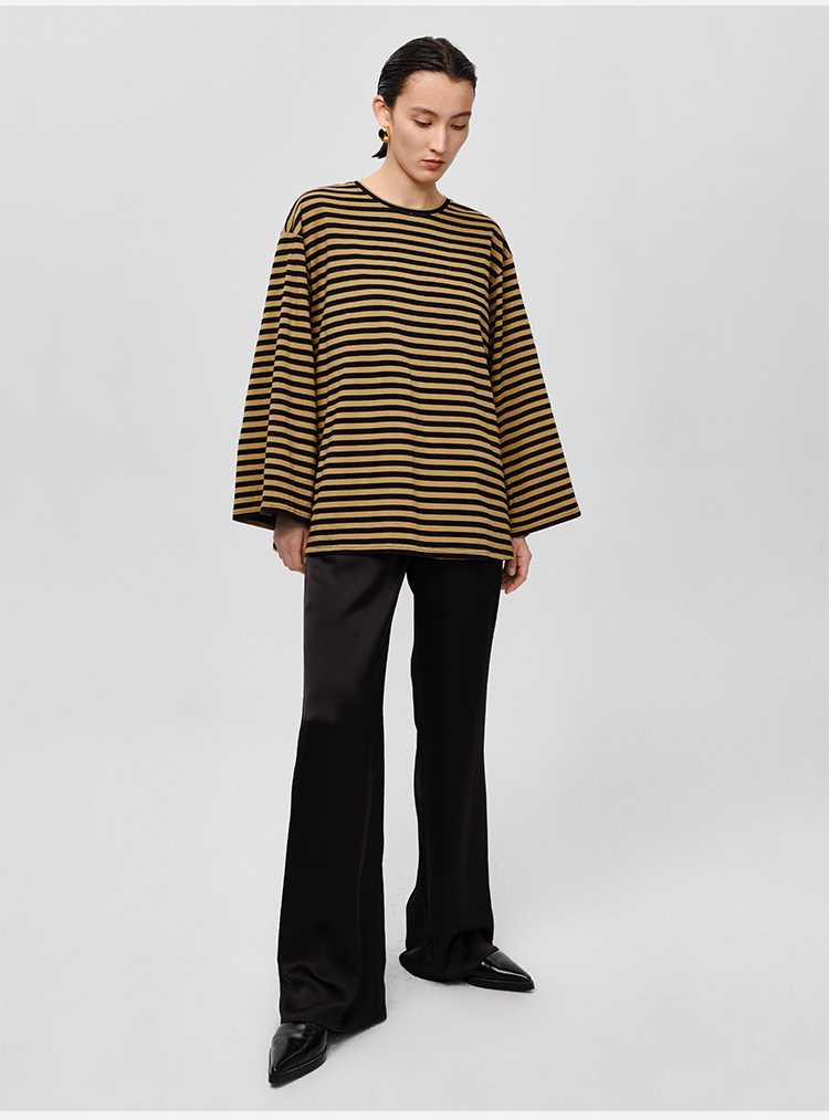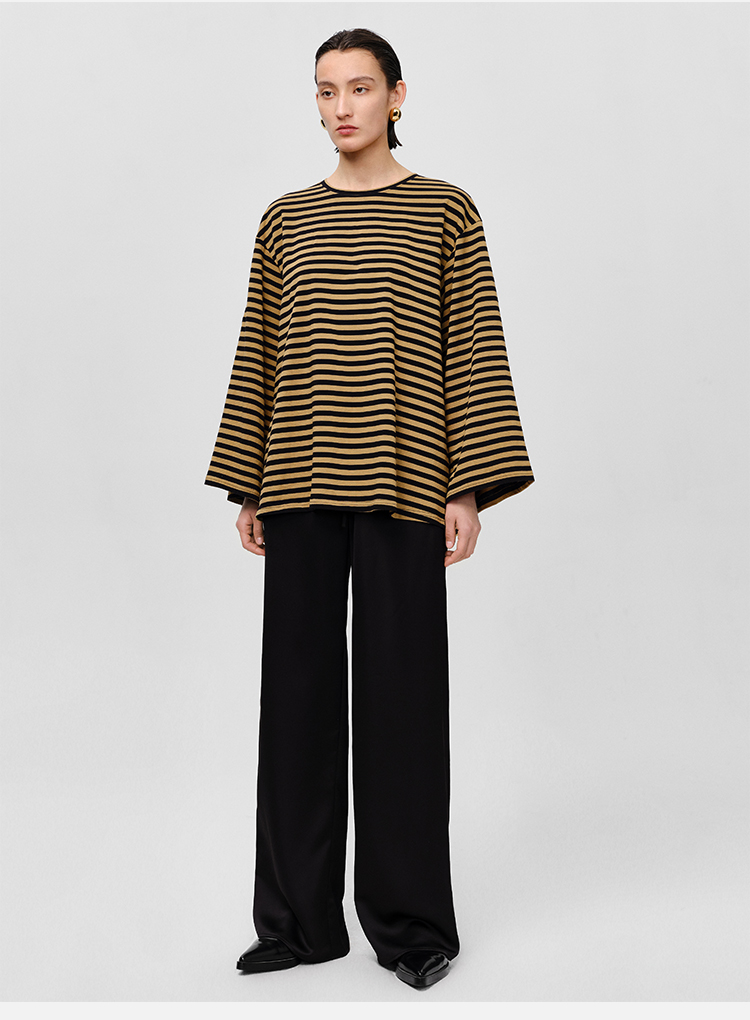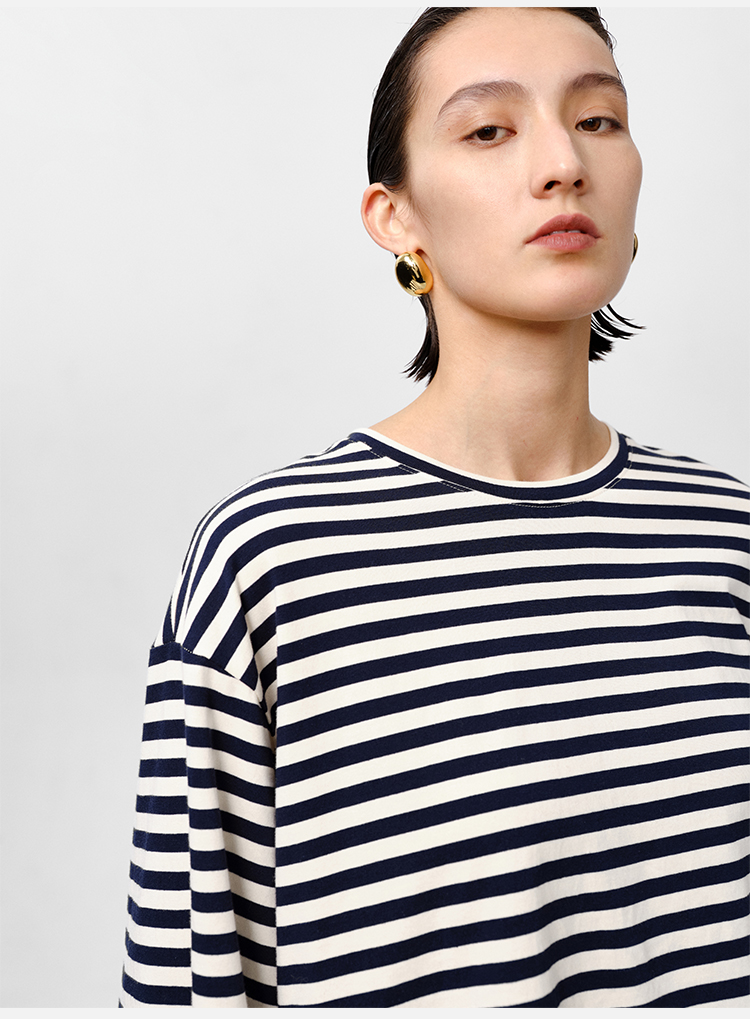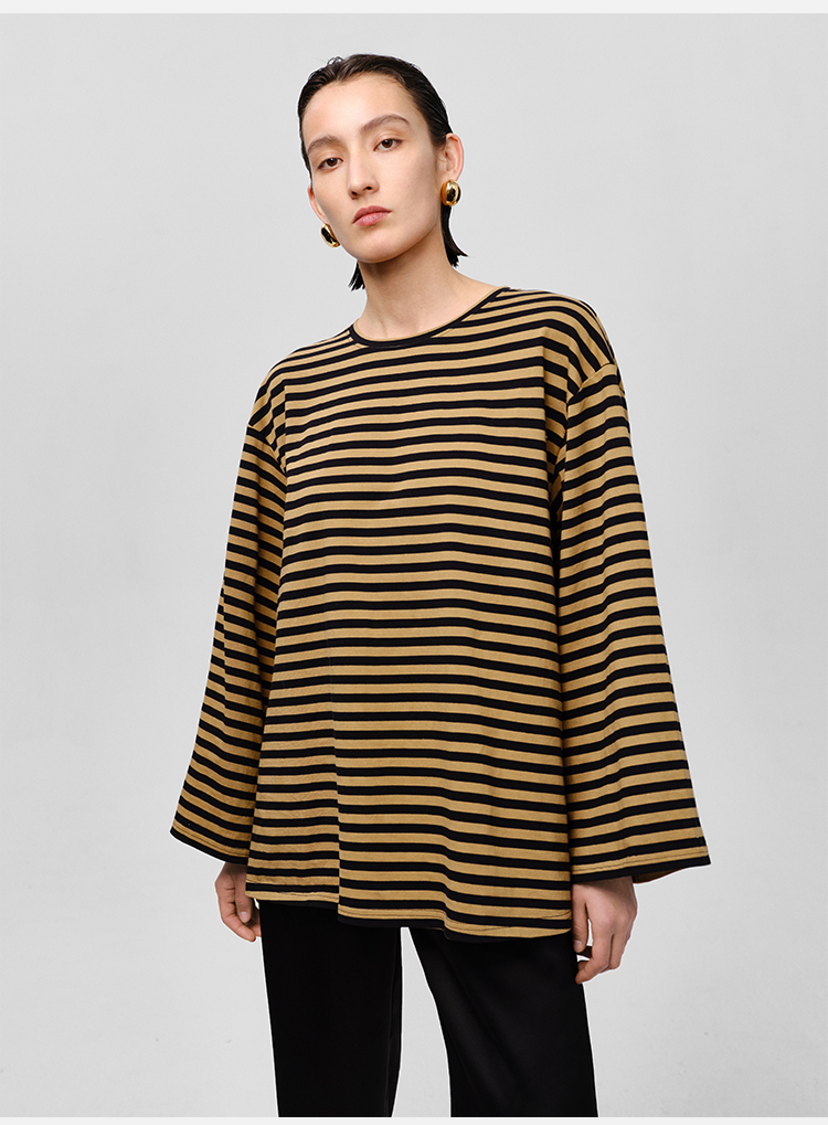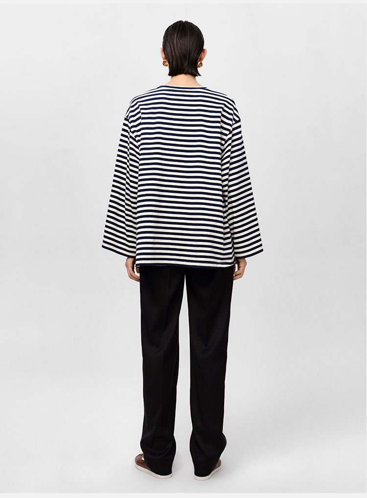 HIDEMI 条纹色织棉喇叭袖廓形圆领长袖针织上衣 蓝白/黑咖