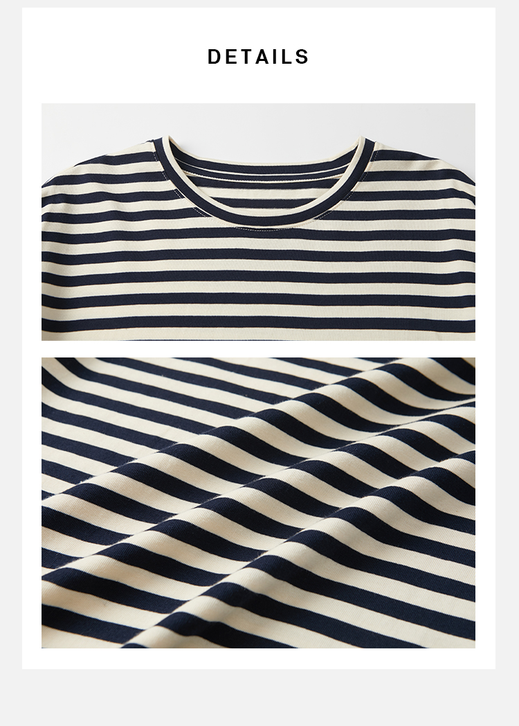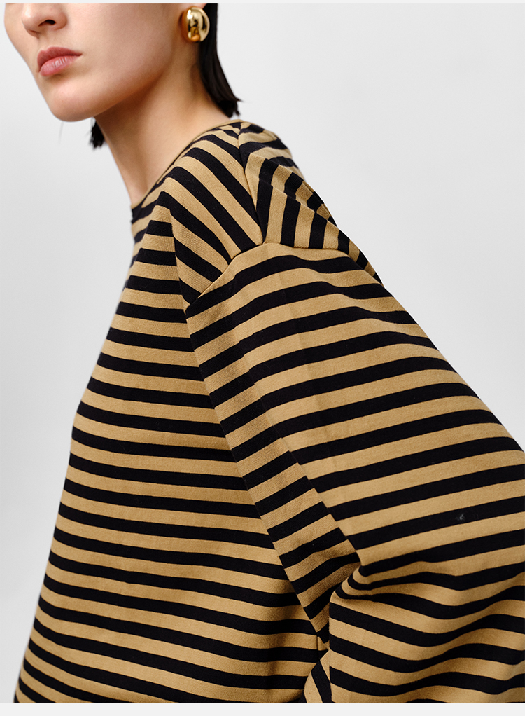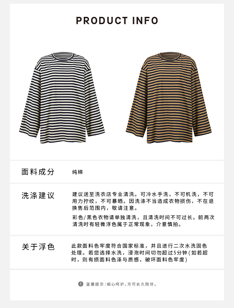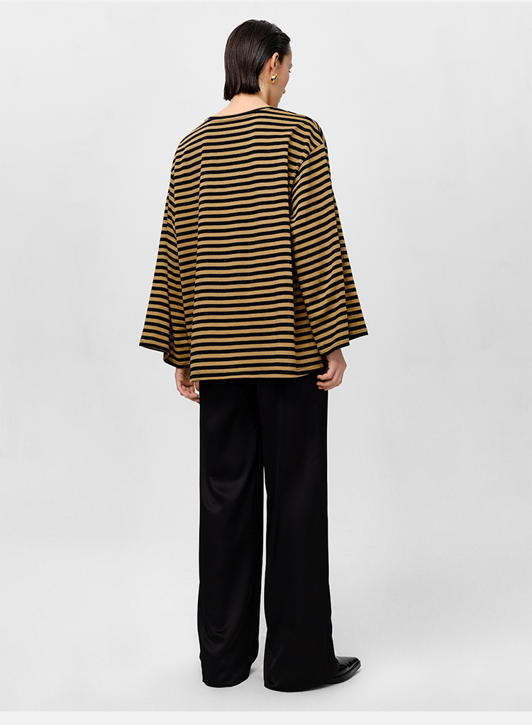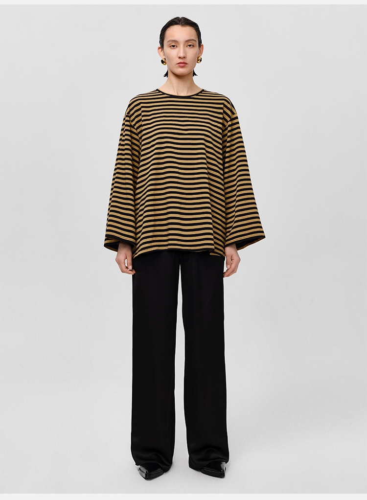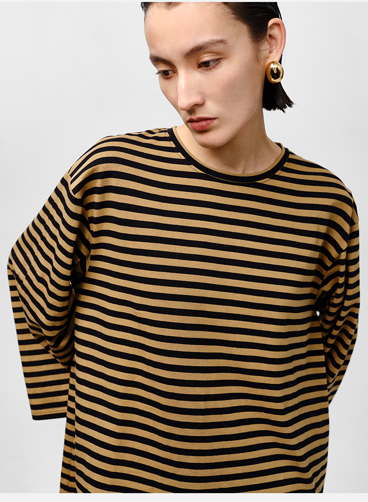 HIDEMI 条纹色织棉喇叭袖廓形圆领长袖针织上衣 蓝白/黑咖