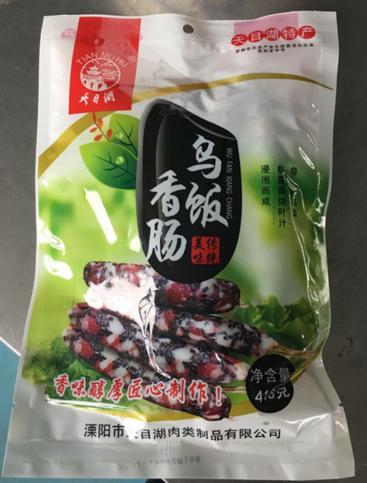 配 料:猪肉,乌饭(糯米,南烛叶汁),猪肠衣,食用盐,白砂糖,味精,白酒,食品添加剂(D-异抗坏血酸钠,亚硝酸钠),香辛料。