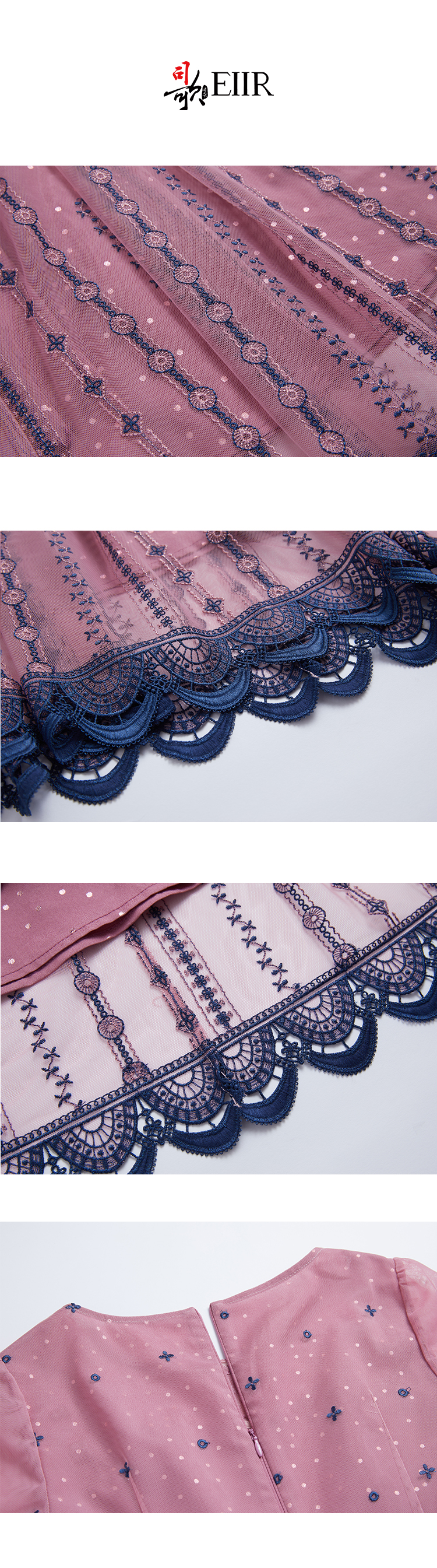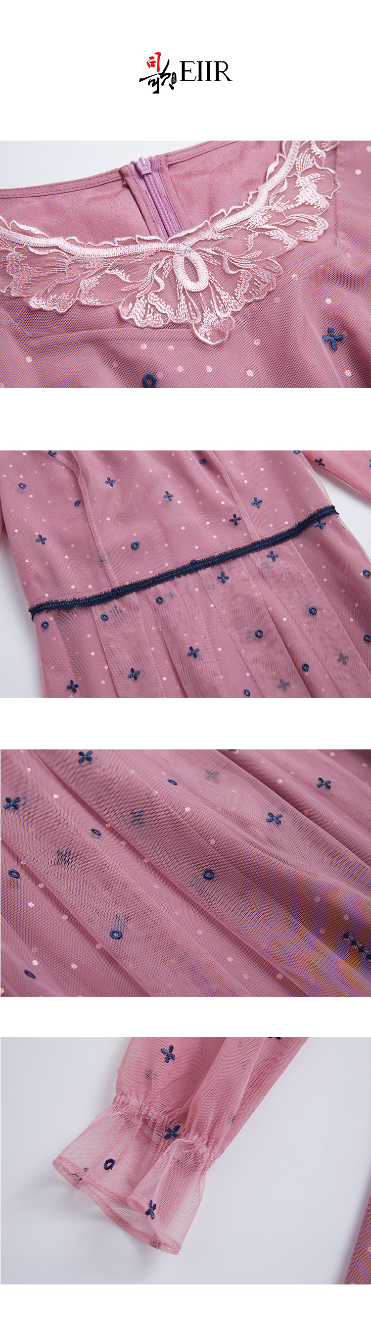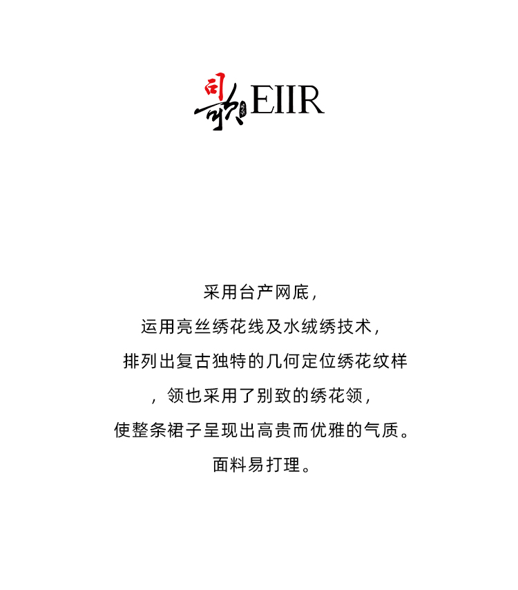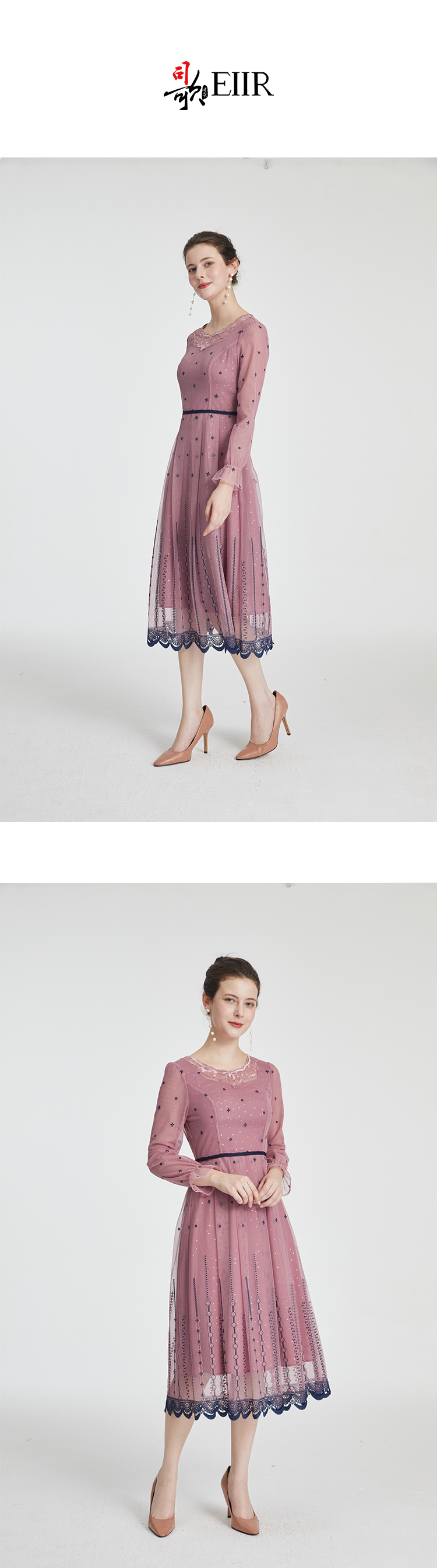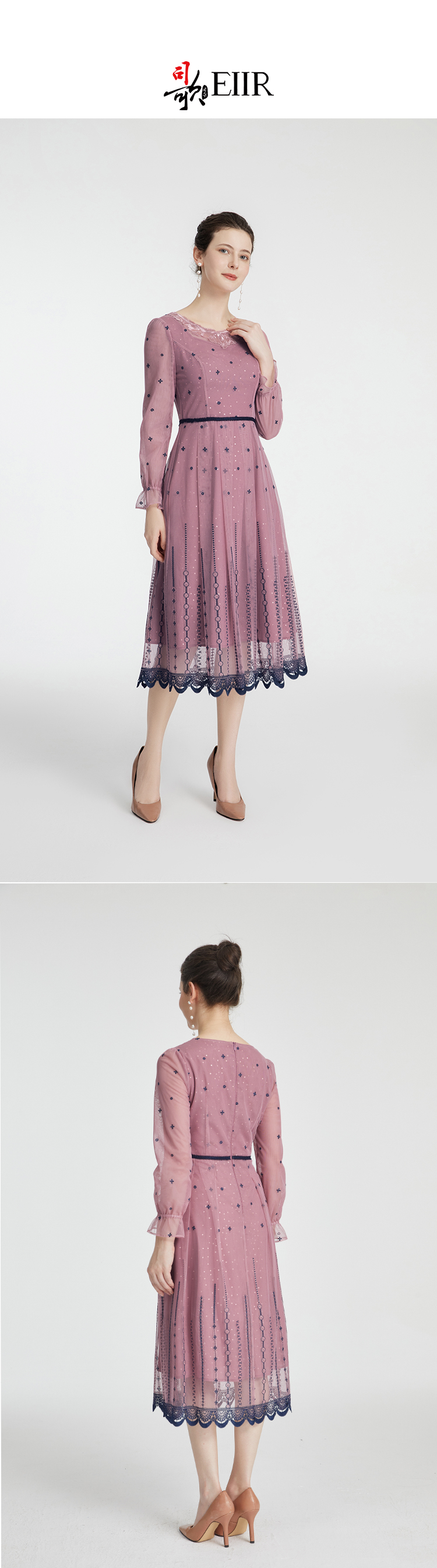 司歌刺绣连衣裙圆领网纱长袖弹力修身A881268