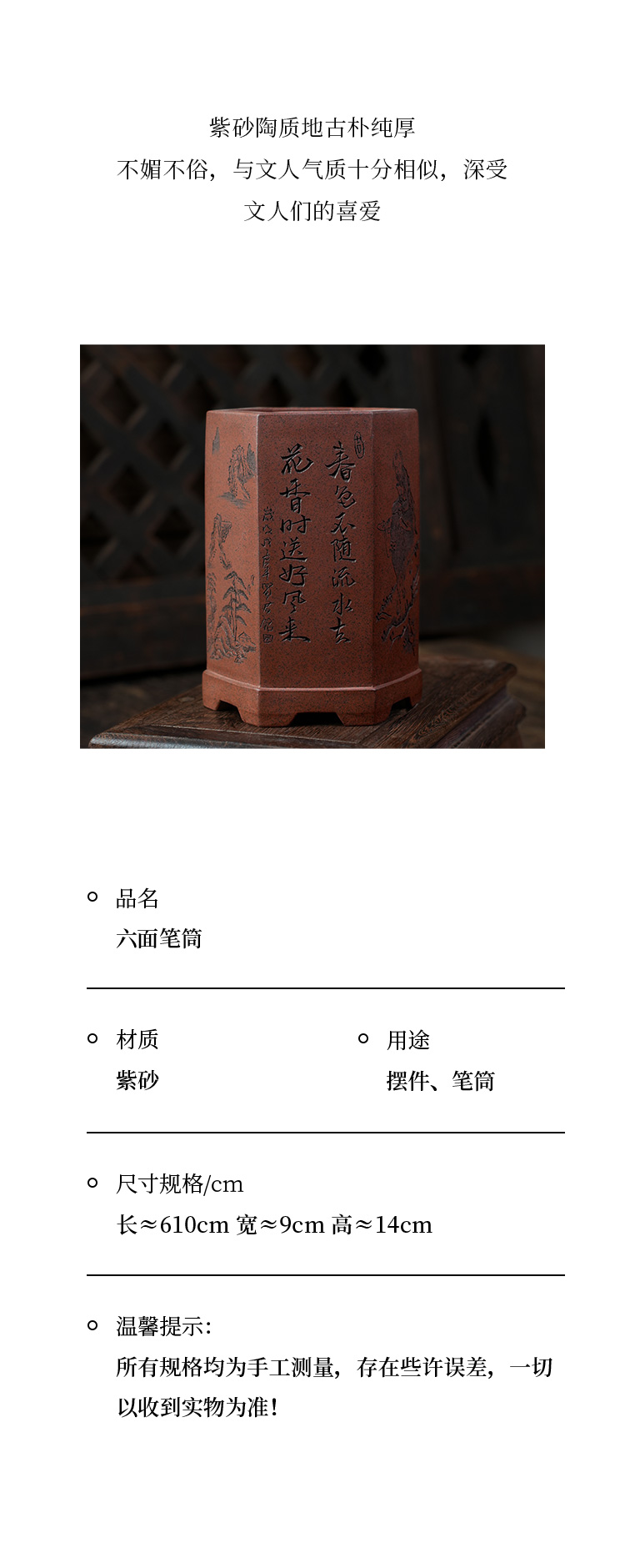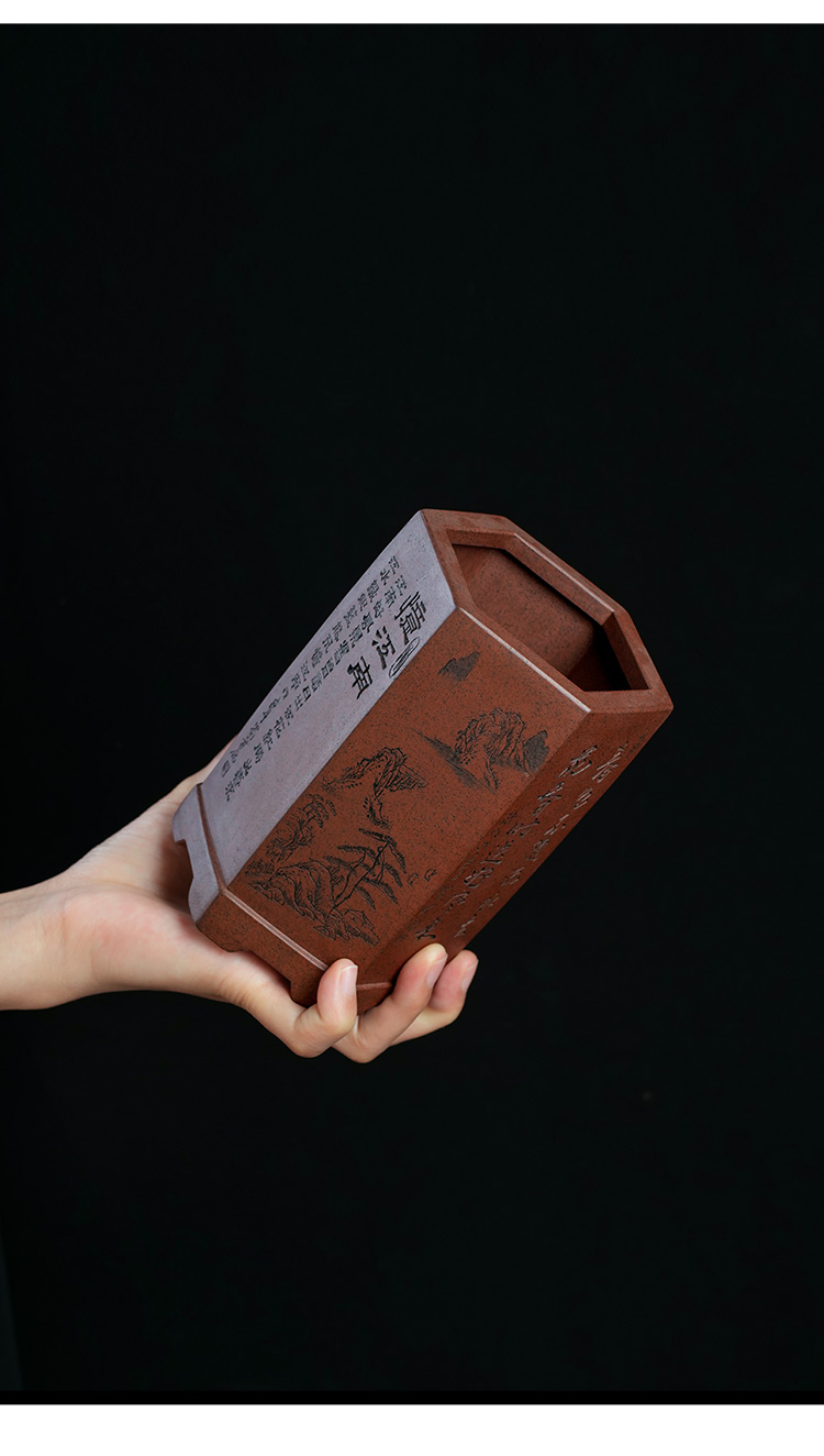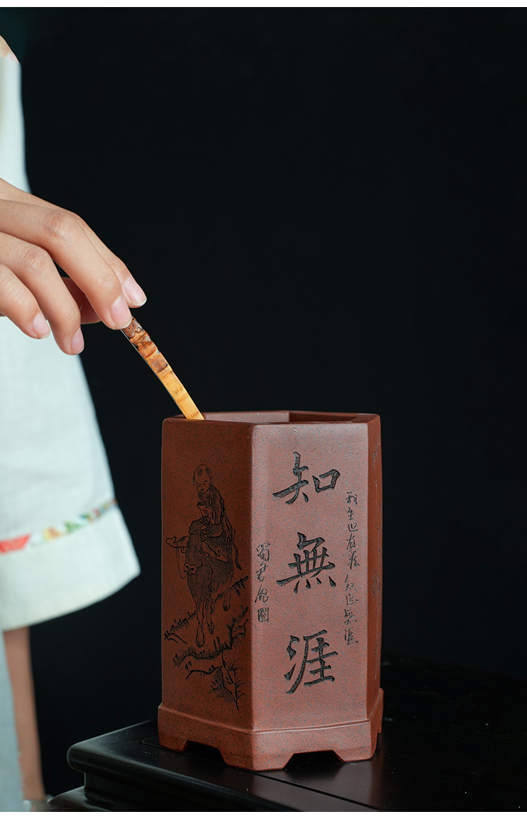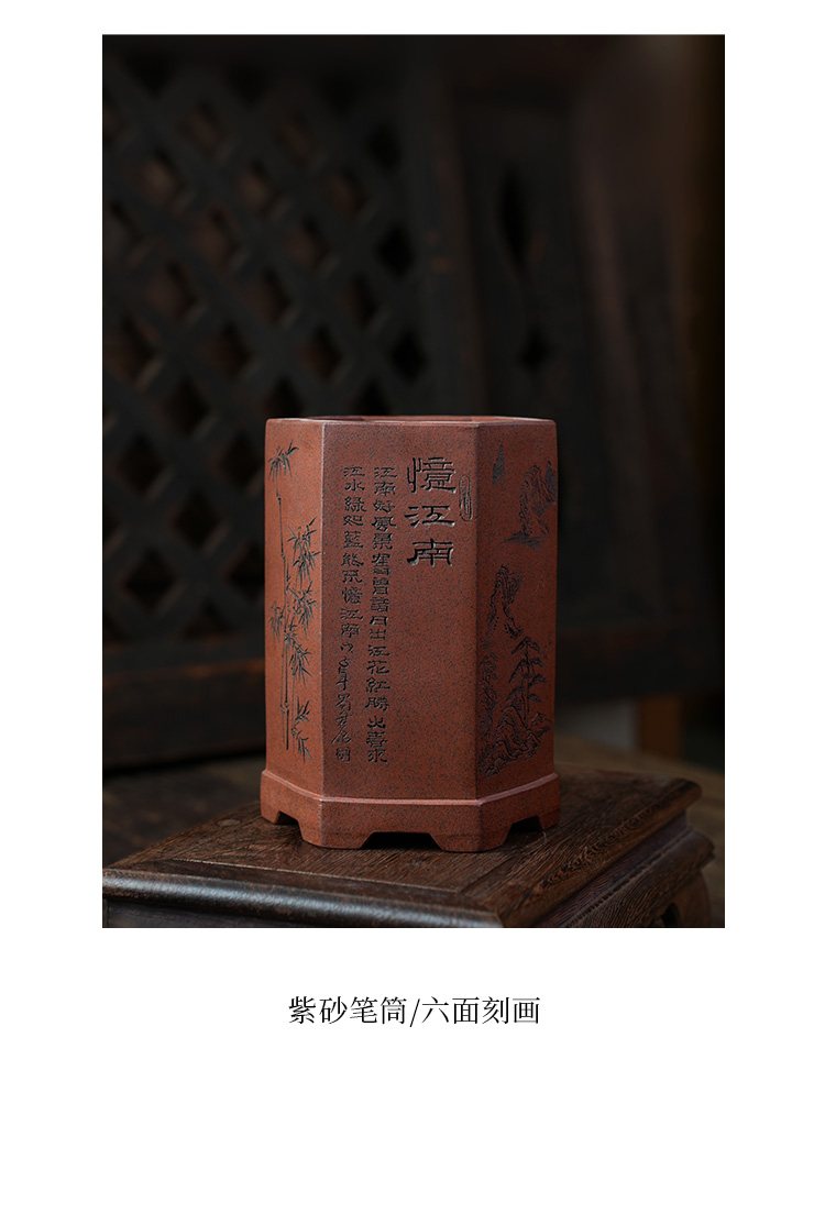 宜兴紫砂笔筒六面刻画陶瓷笔筒古风手工办公室书房学生桌面多功能收纳盒摆件