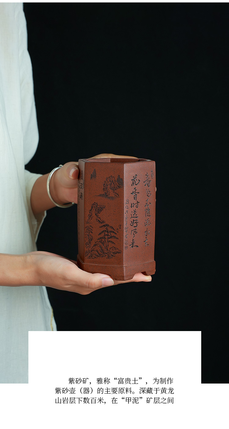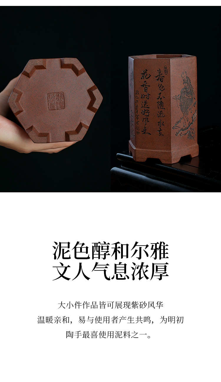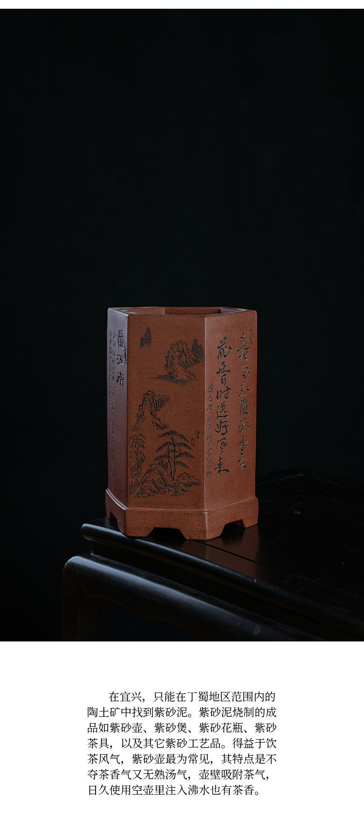 宜兴紫砂笔筒六面刻画陶瓷笔筒古风手工办公室书房学生桌面多功能收纳盒摆件