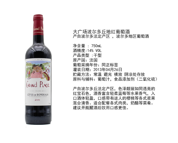 整箱特惠装 大广场波尔多丘地红葡萄酒 Grand Place, Cotes de Bordeaux 6*750ml