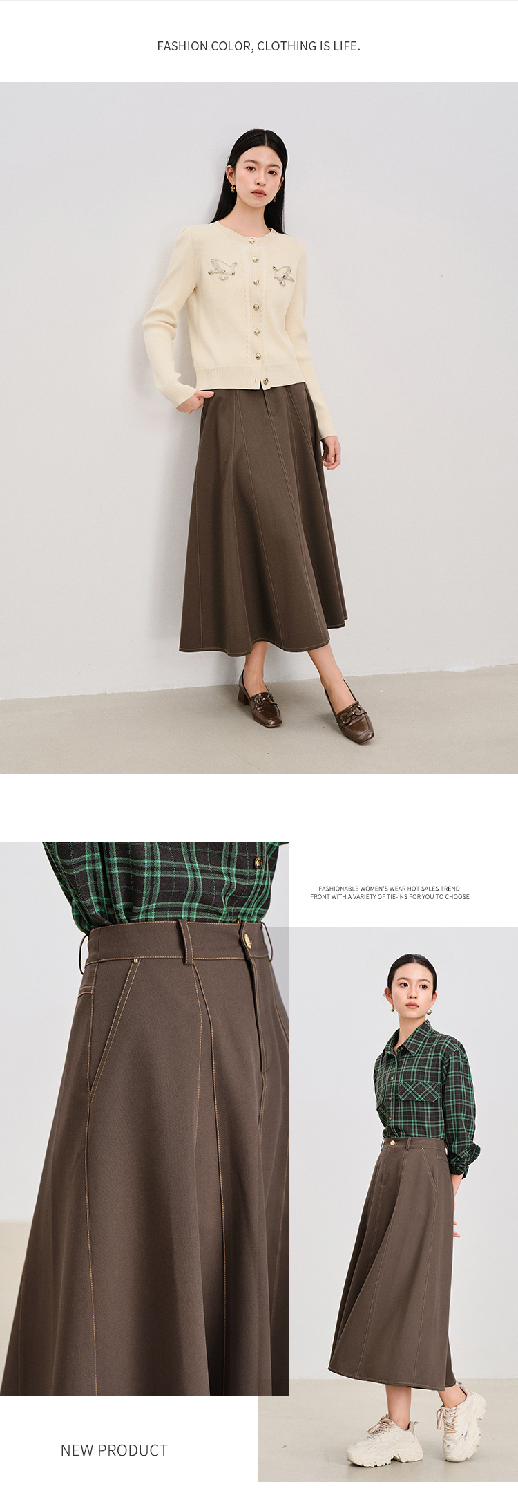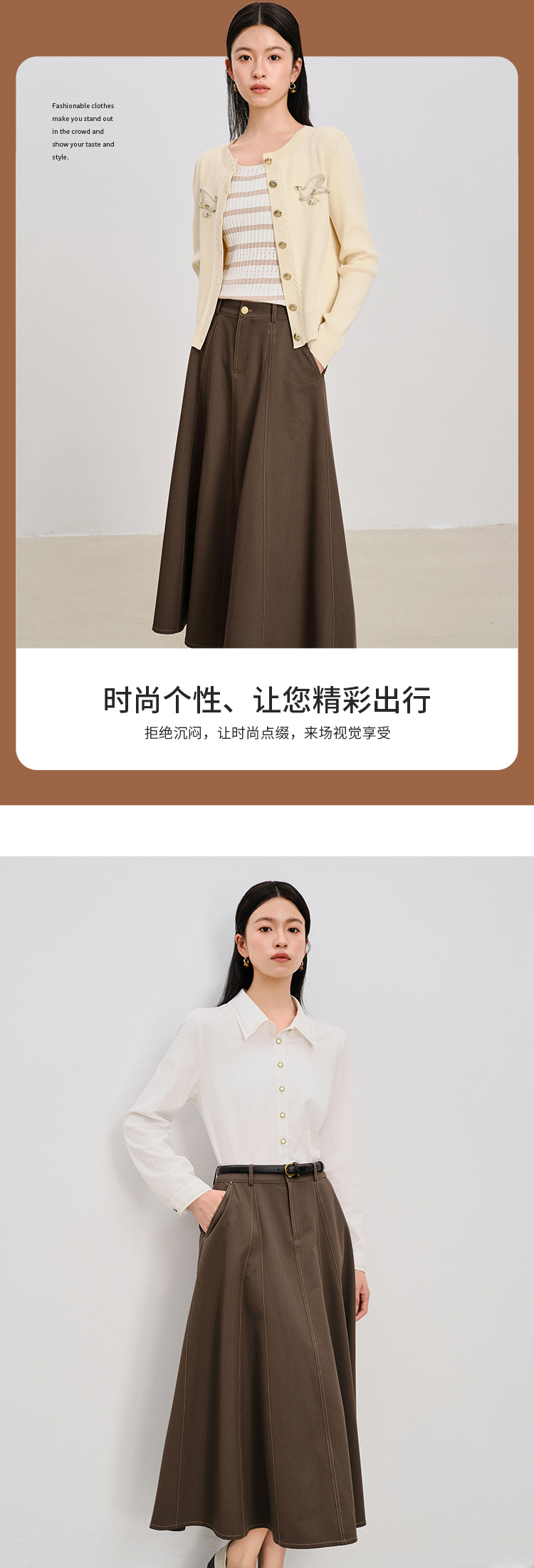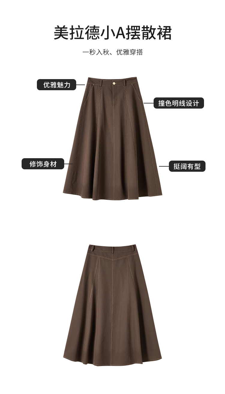 【商场同款】CNS4861 “ 美拉德伞裙 ” 美拉德棕秋季的主打色 多片结构线打造小A摆散裙 裙型流畅立体显瘦 撞色明线设计摩登现代 TR面料垂感有型透气好穿