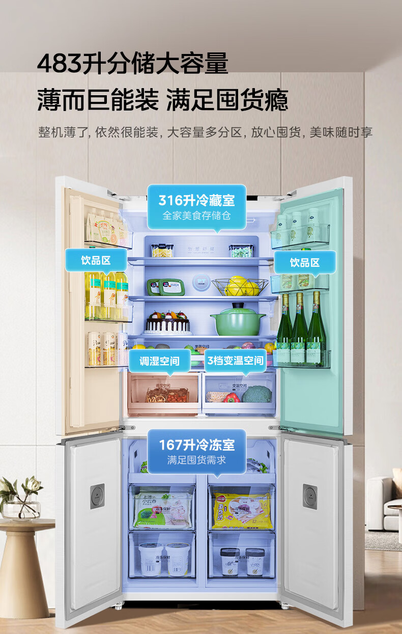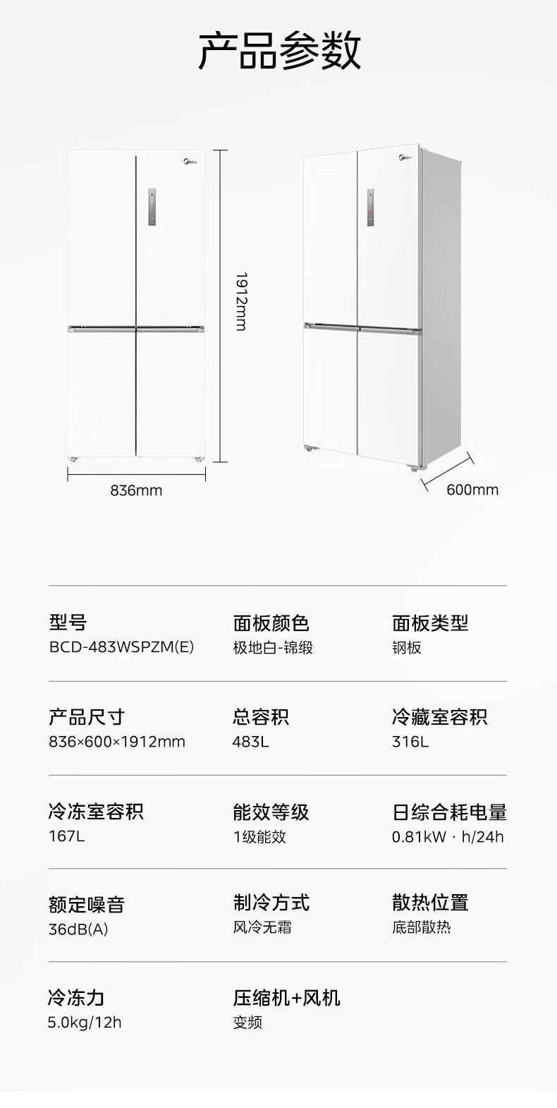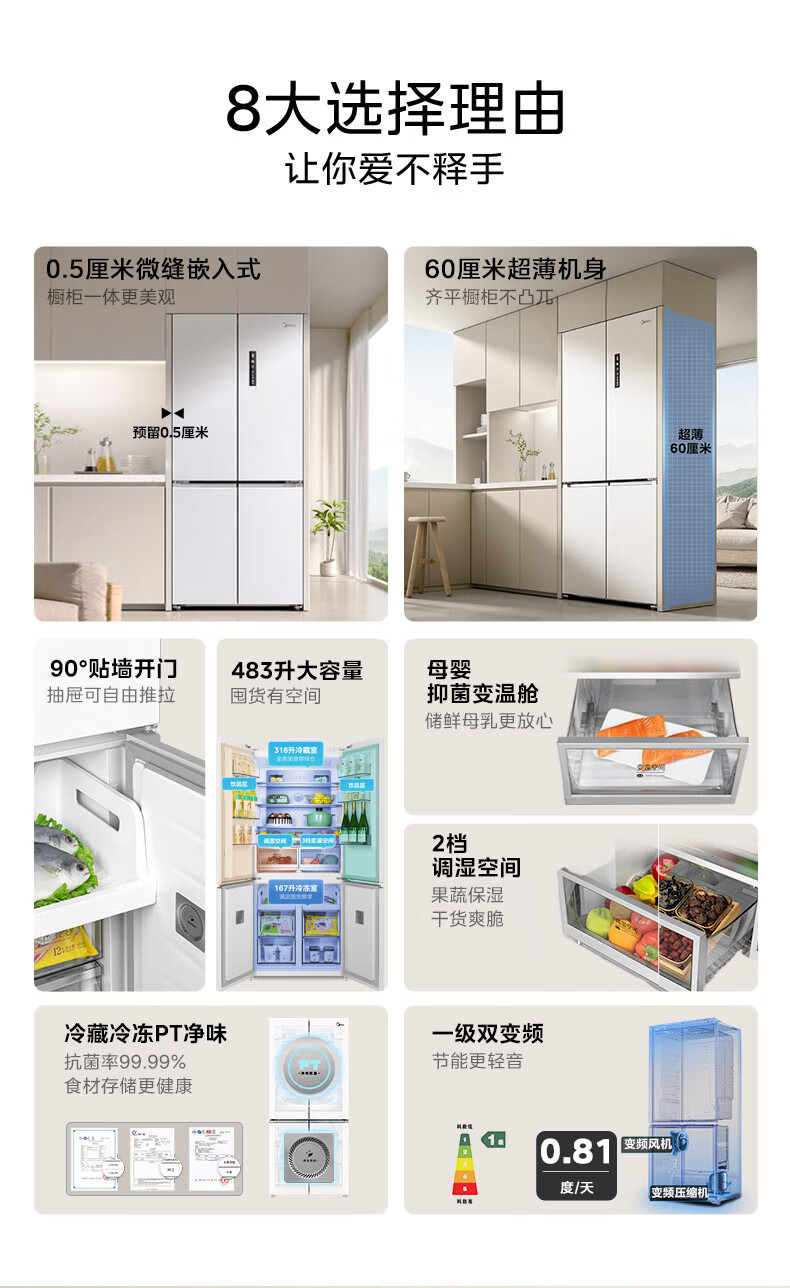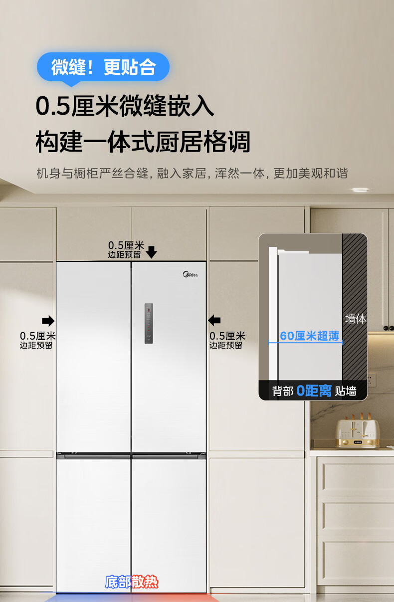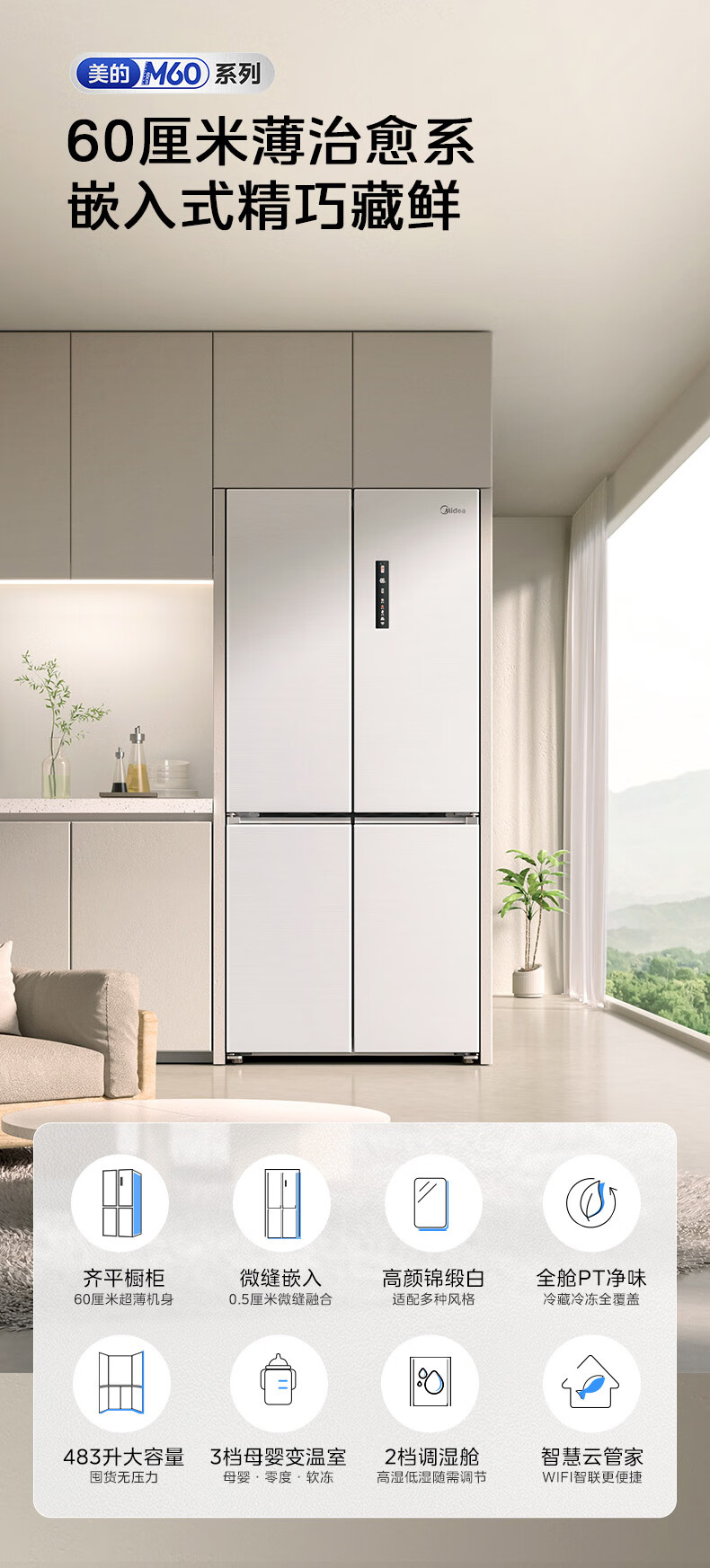 美的(Midea)M60系列60cm薄483升平嵌十字双开四开门多门超薄嵌白色无霜一级变频家用电冰箱BCD-483WSPZM(E)