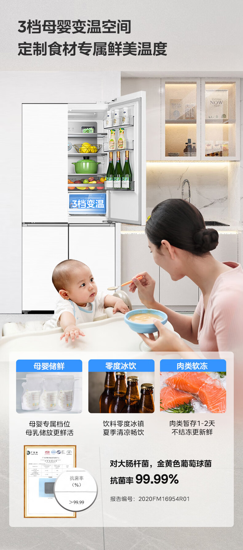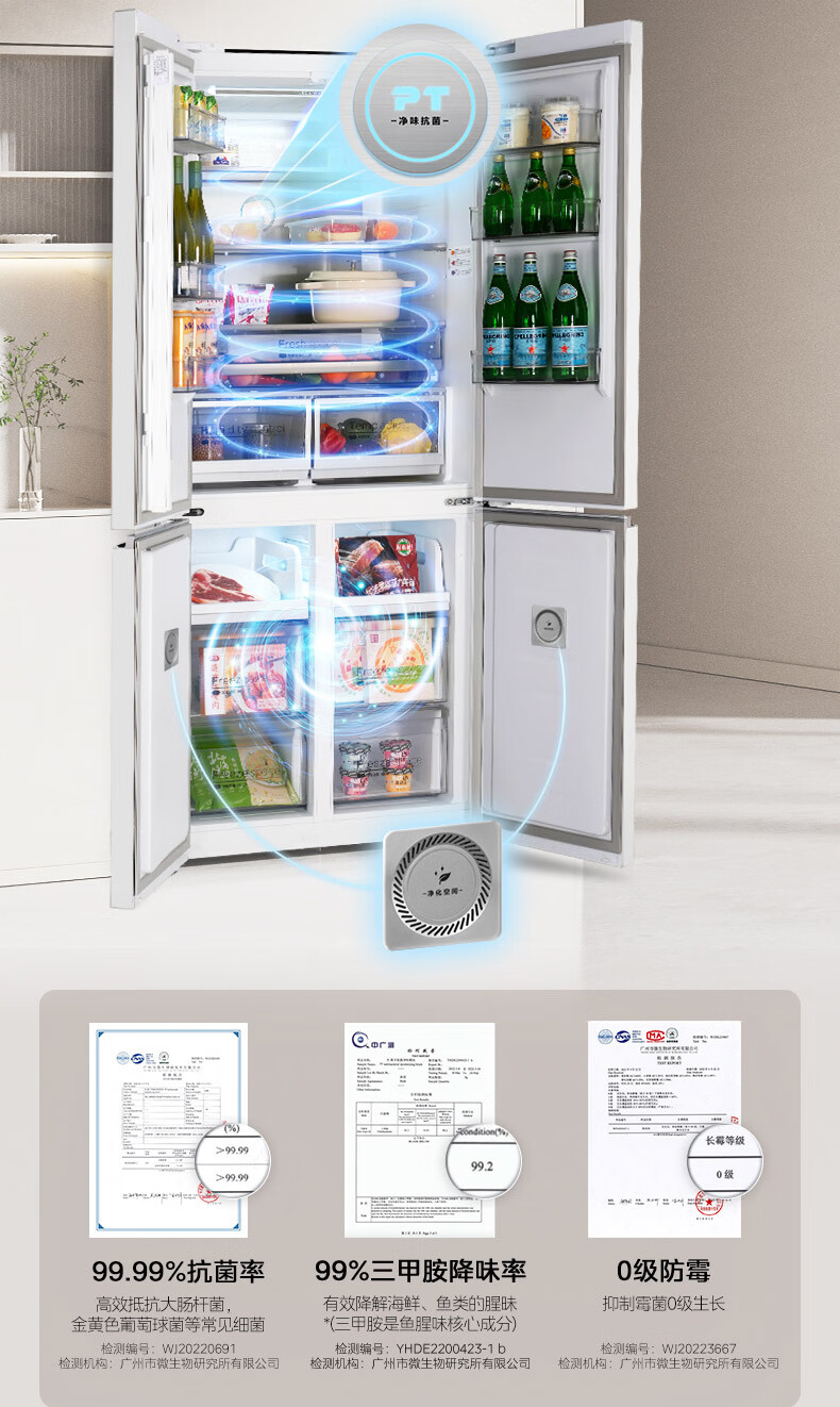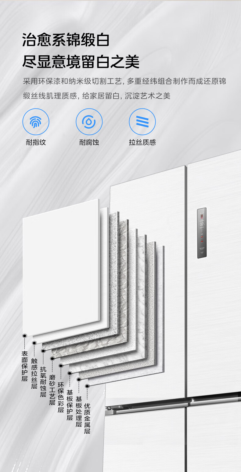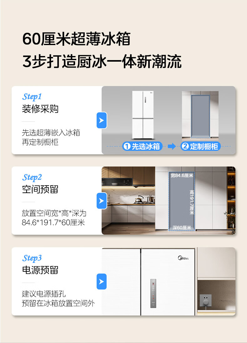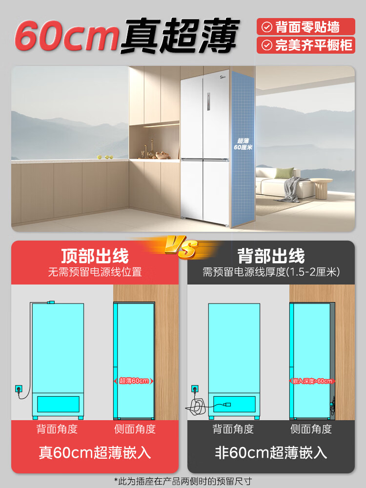 美的(Midea)M60系列60cm薄483升平嵌十字双开四开门多门超薄嵌白色无霜一级变频家用电冰箱BCD-483WSPZM(E)