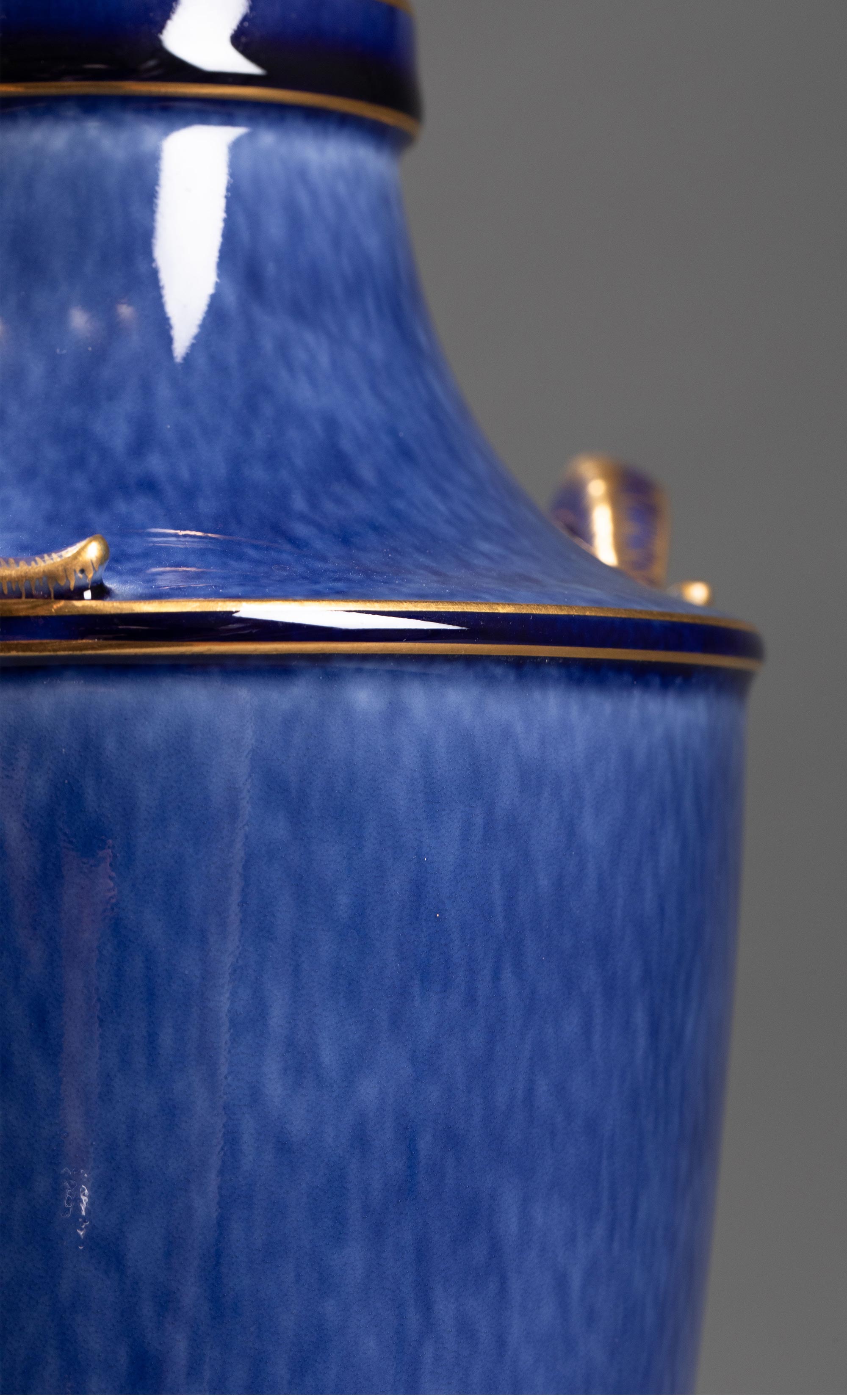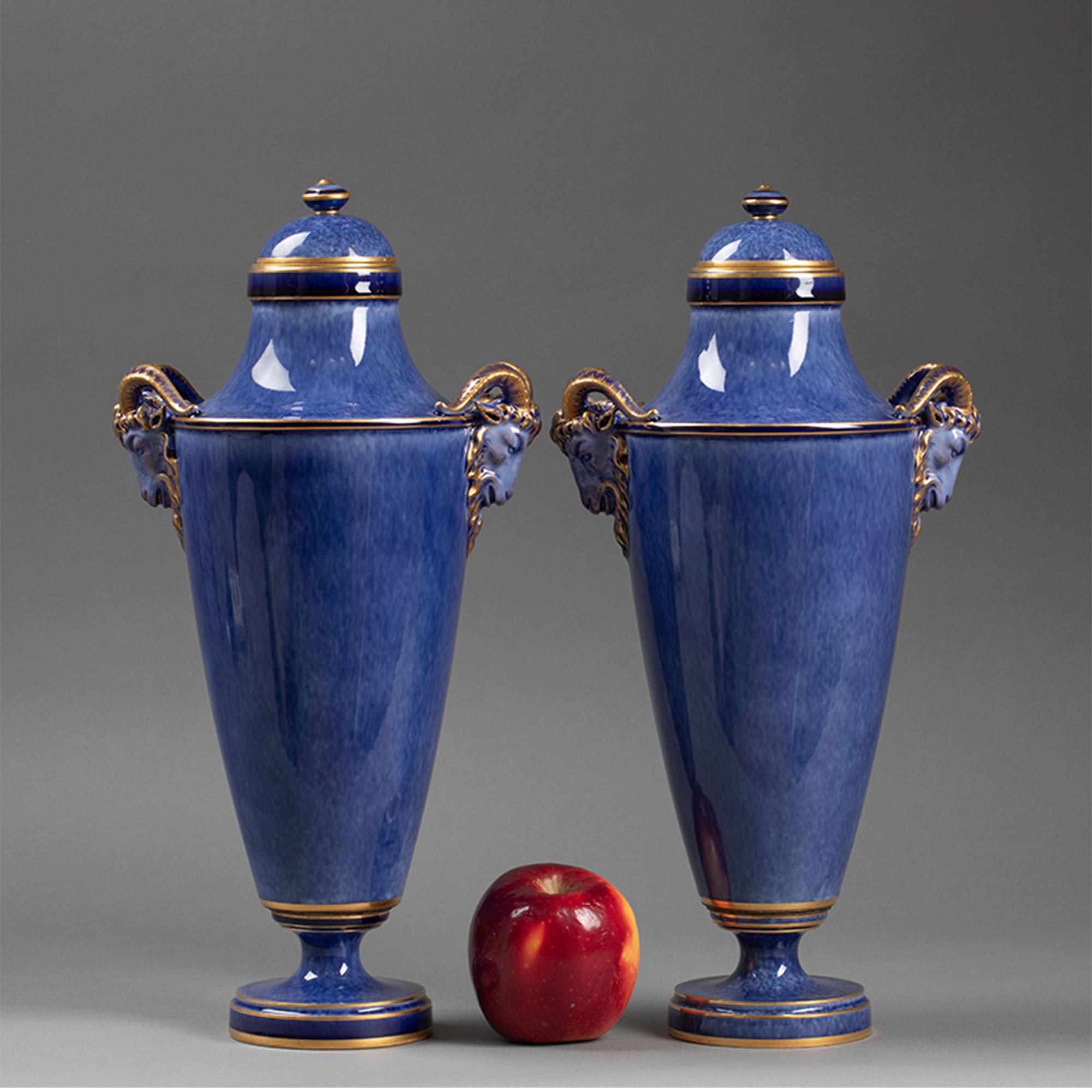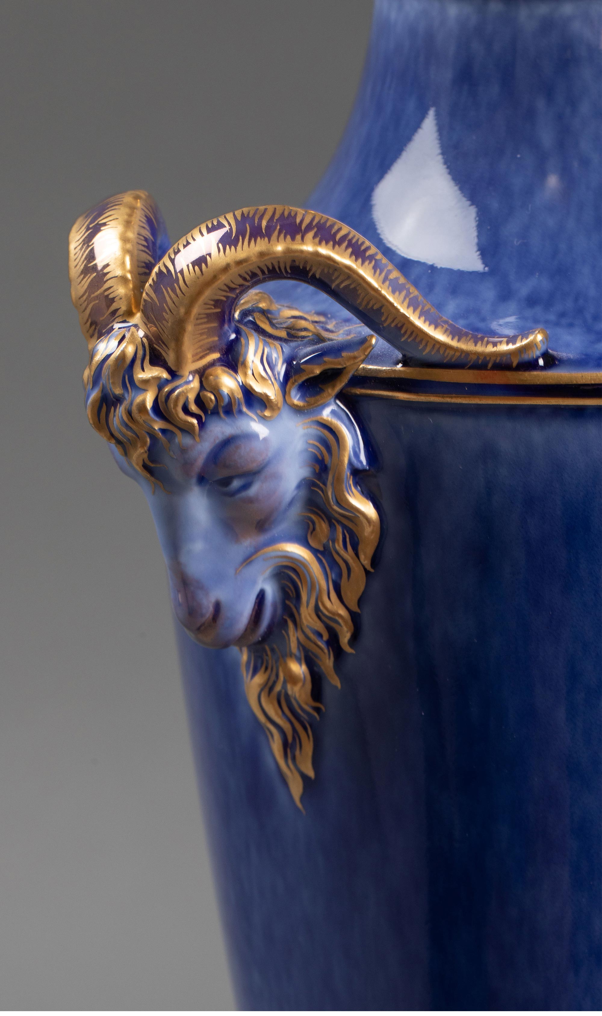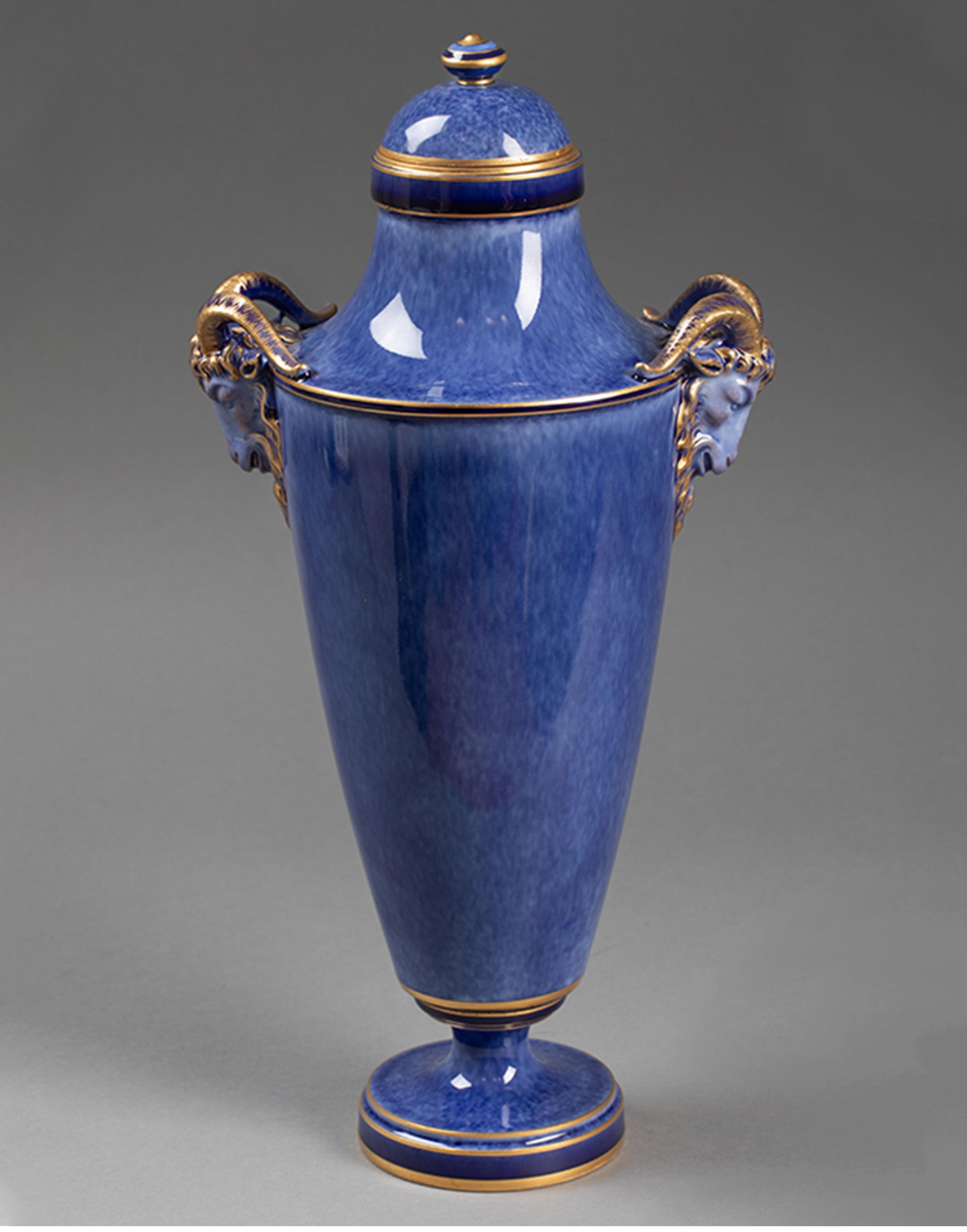 1886-1891年代法国御窑出品手绘描金装饰羊头双耳云朵蓝釉带盖瓷瓶一对