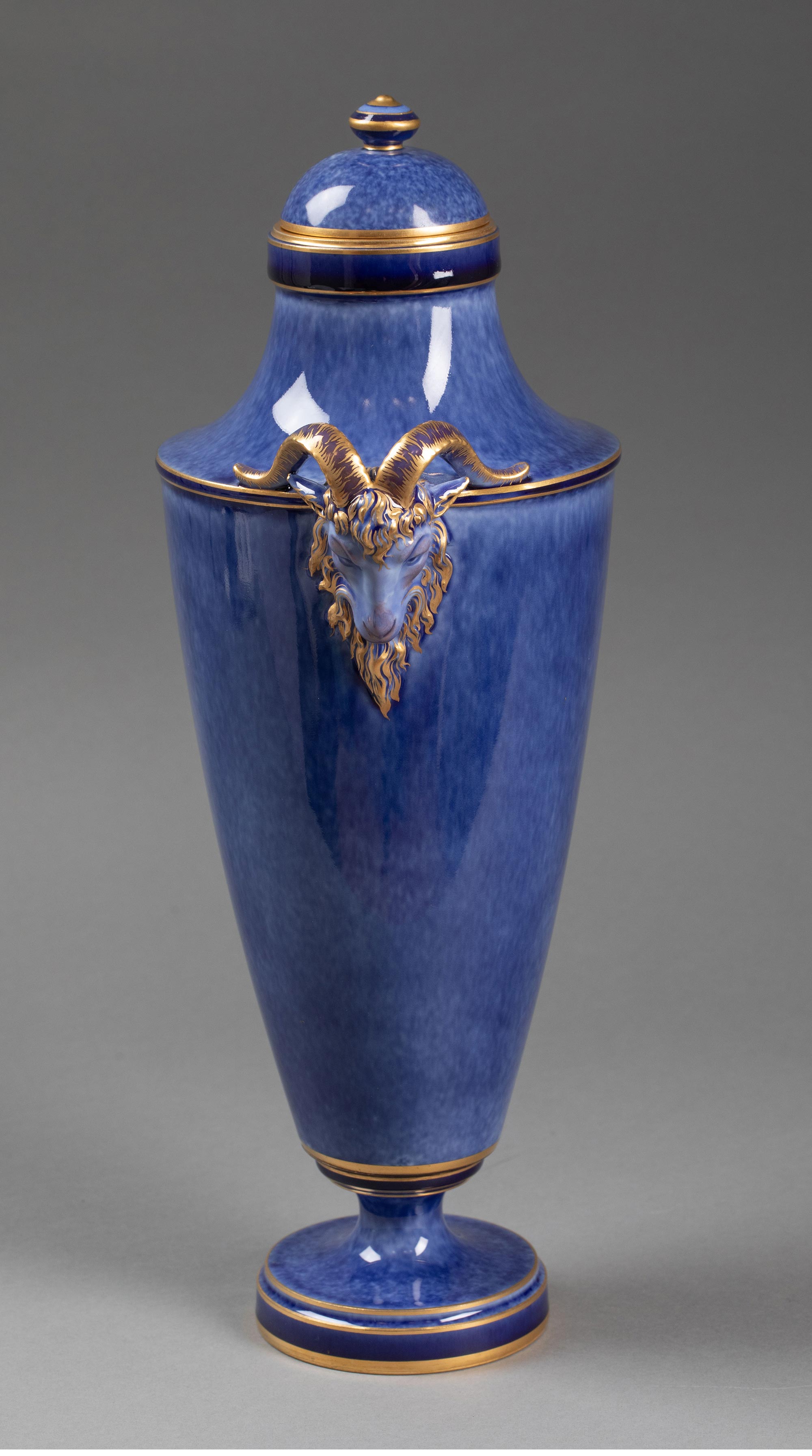 独角鹿西洋古董 1886-1891年代法国御窑出品手绘描金装饰羊头双耳云朵蓝釉带盖瓷瓶一对