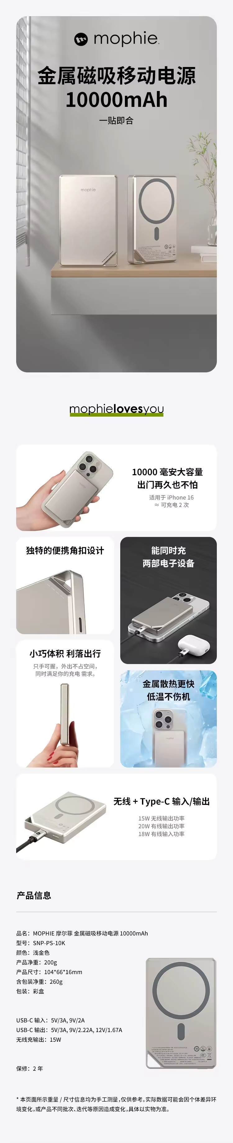 移动电源 金属磁吸 10000mAh 浅金 - mophie【国家3C认证】