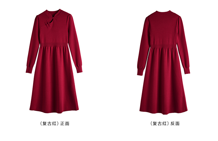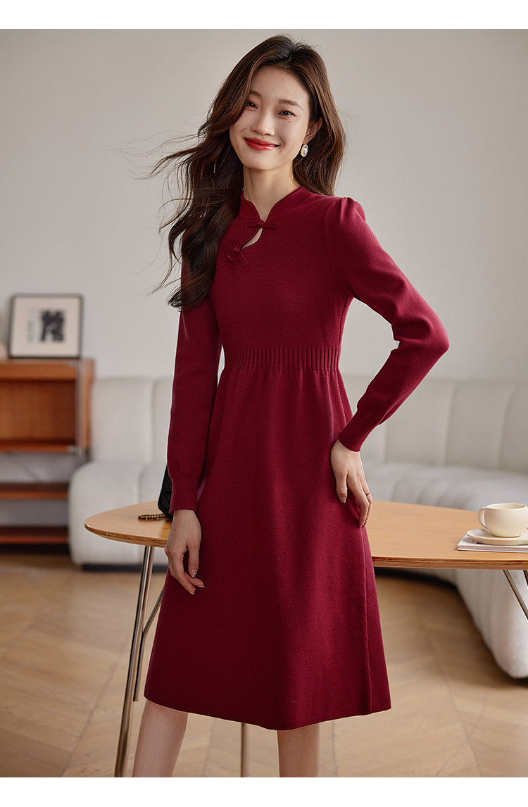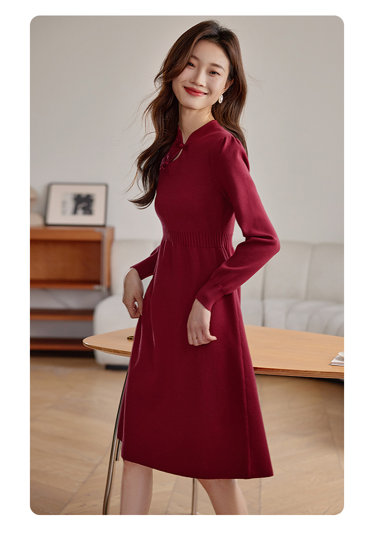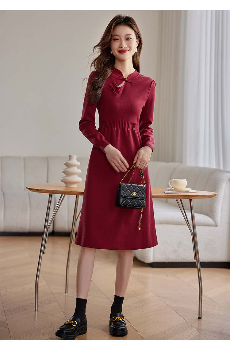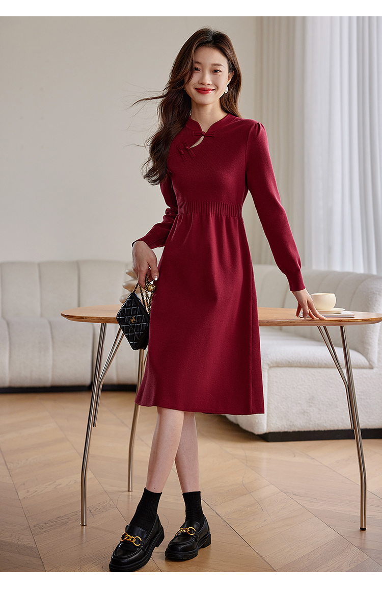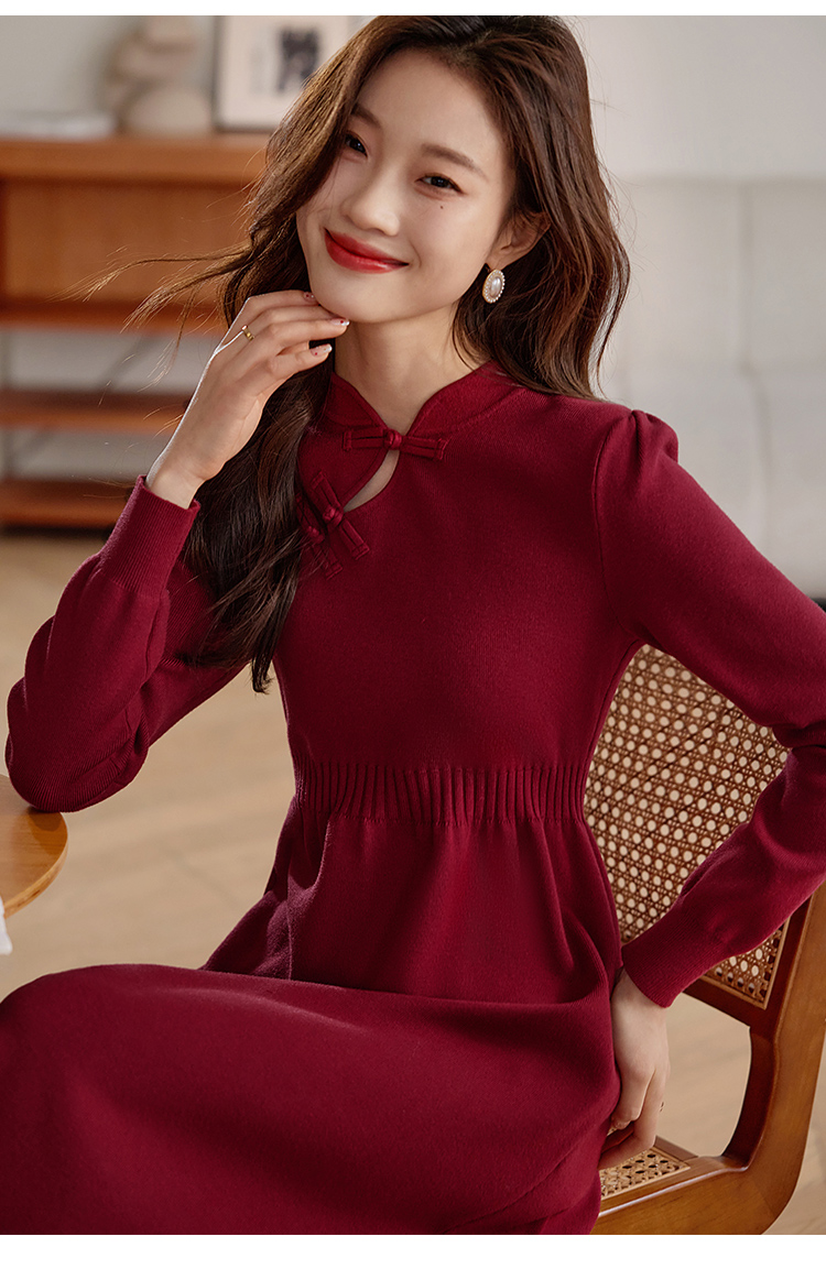 【年终特卖】熙世界红色旗袍式针织连衣裙秋冬新中式盘扣毛衣裙子